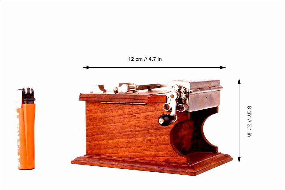 Esta fantástica máquina antigua para liar cigarrillos es una pieza de colección, de gran calidad y en muy buenas condiciones. La máquina funciona perfectamente y se puede utilizar para liar cigarrillos, si bien falta la esponjilla original que atrapaba el papel humedeciendo la zona adhesiva para luego trasladarlo al rodillo. En este vídeo se puede ver el funcionamiento de una máquina de diseño similar: https://www.youtube.com/watch?v=GX13e5XZ2Kk. El sistema de rodillos fue el primero que se empleó en este tipo de máquinas; las más conocidas y antiguas son las de la marca Lemaire.