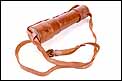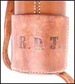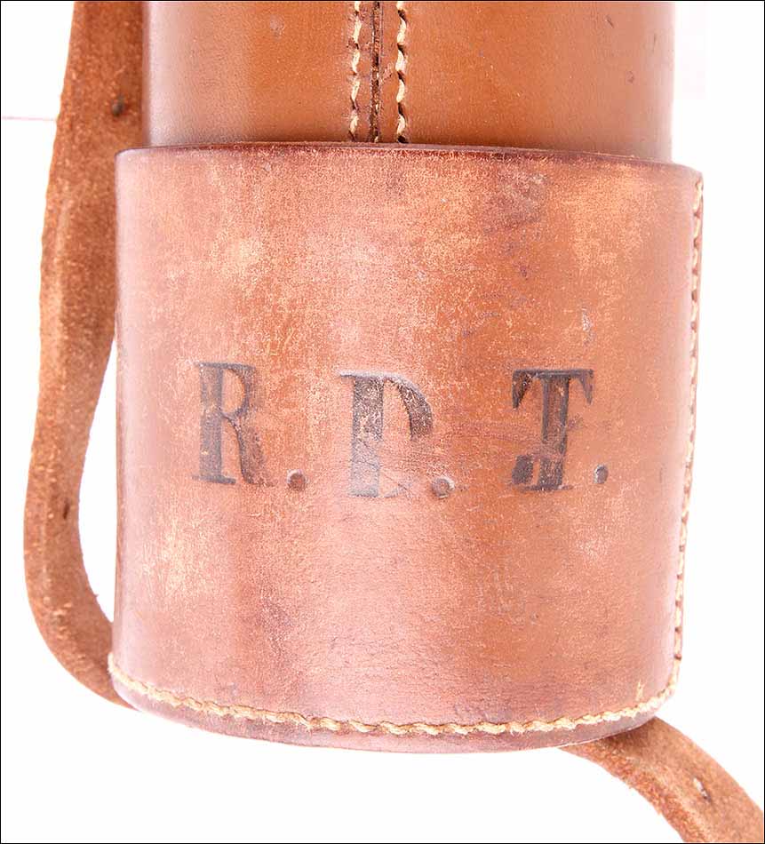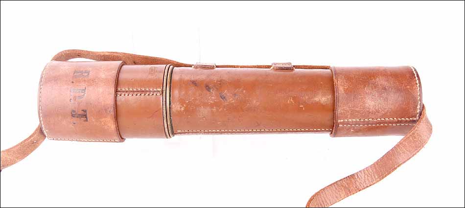 El catalejo conserva la funda de piel original de época. Se trata de una cobertura formada por varias piezas fuertemente cosidas, en excelente estado de conservación. La funda recubre parte del cuerpo principal del catalejo: esta parte lleva dos trabillas de piel por las que pasa la cinta de transporte, también fabricada en piel marrón. La correa está unida también a las dos tapas de piel que cierran el catalejo una vez recogido. El catalejo lleva también un parasol de latón forrado de piel, que se recoge con el resto del aparato. En la tapa que protege el parasol y el objetivo podemos ver tres iniciales grabadas en la piel: R.D.J.