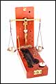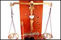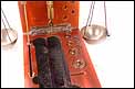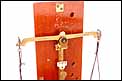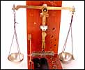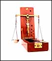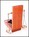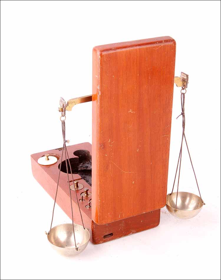 Cuando abrimos la caja, en su interior encontramos la balanza desmontada y cuidadosamente encajada en un rebaje practicado en la gruesa base de madera. En este rebaje se encajan la cruz y los platillos. Para utilizarla, colocaremos la tapa en sentido vertical y engancharemos la cruz en la parte superior del soporte vertical fijado en su cara interior. Los platillos con forma de cuenco sugieren que la balanza podría haber formado parte del equipo de un joyero, pero también pudiera tratarse de una balanza de farmacia. Tanto el latón dorado como el metal plateado de los platillos están muy bien conservados: se muestran lisos, pulidos y sin rastros de óxido.