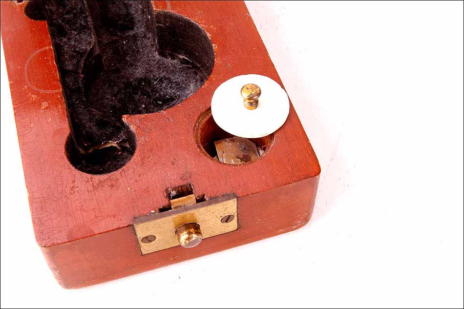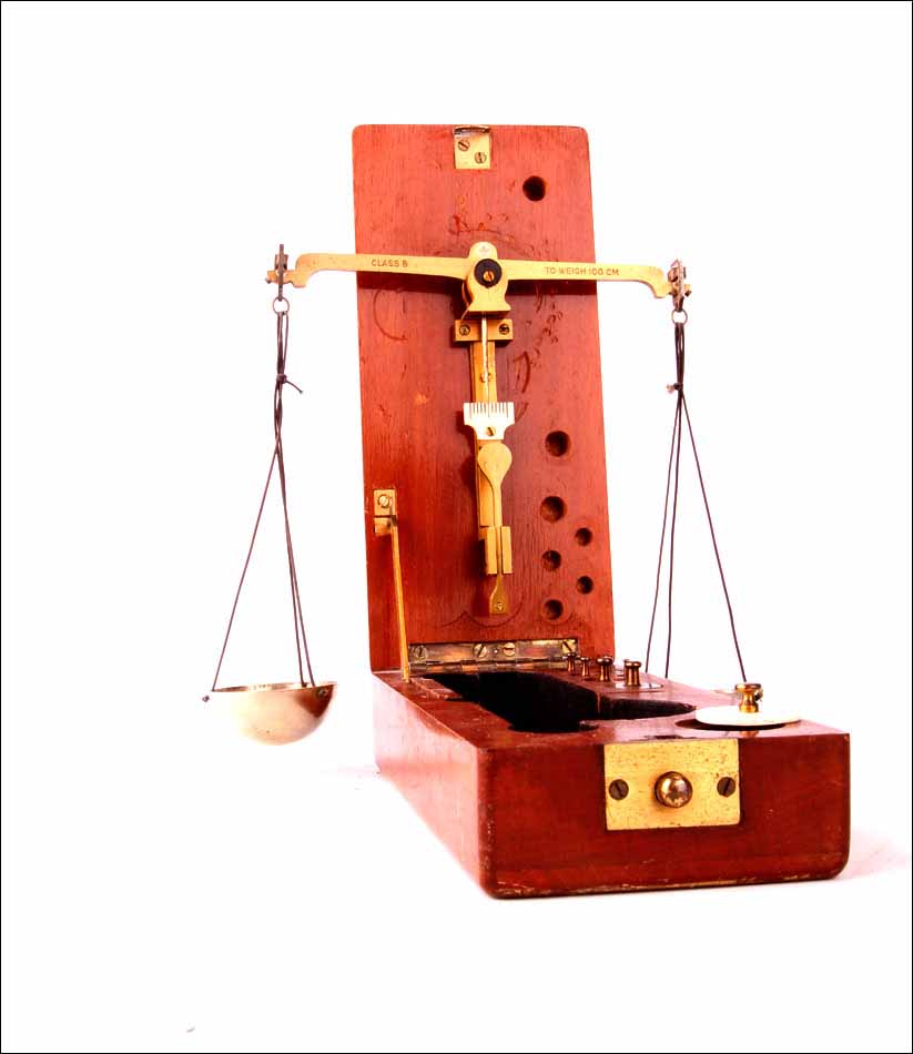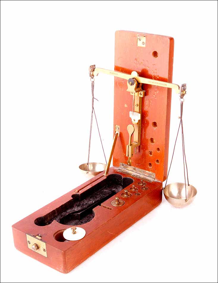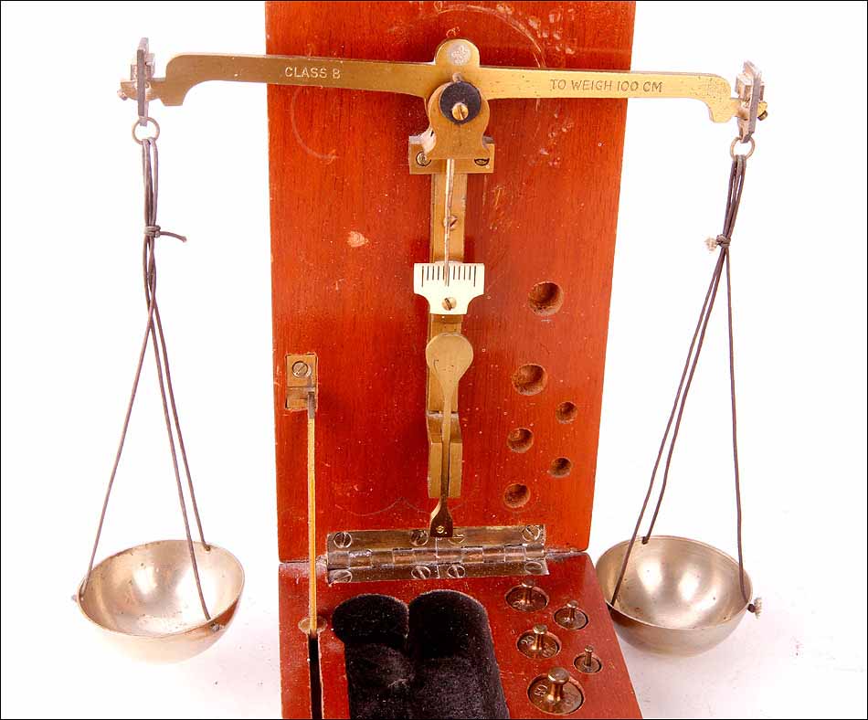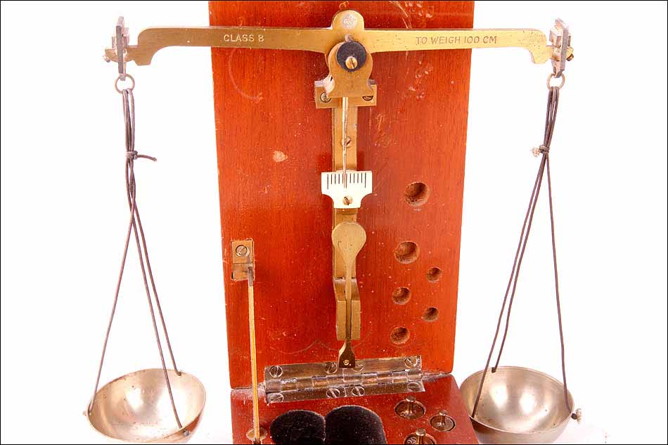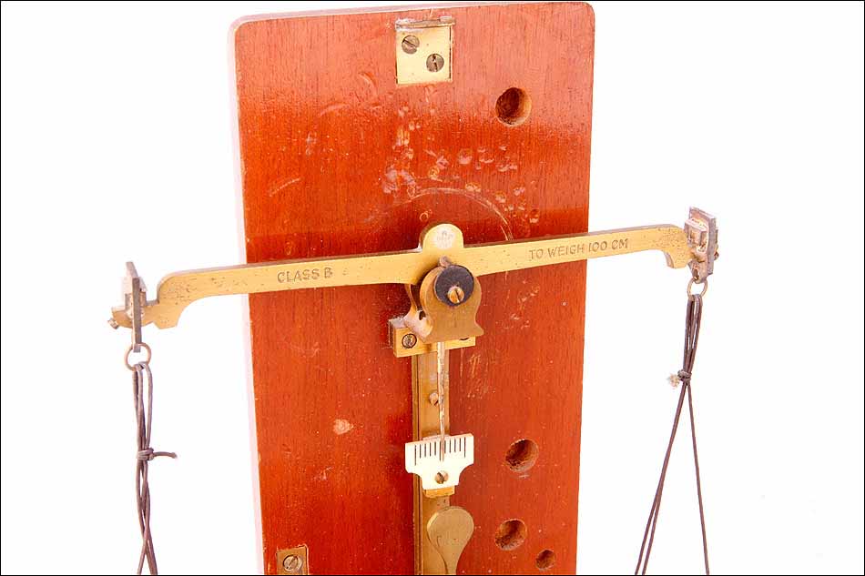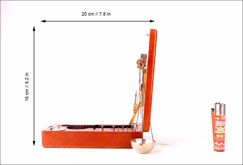 En la cruz de latón encontramos dos inscripciones grabadas en el metal: CLASS B – 10 WEIGH 100 CM. El juego de pesas que acompaña a la balanza consta de seis pesas de bronce, que se encajan en sus respectivos orificios practicados en la base de madera, y cuatro micropesas guardadas en un compartimento con tapa de metal. La caja de madera de caoba se encuentra en muy buenas condiciones, con el barniz satinado original de época y sin desperfectos de importancia.