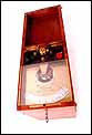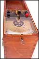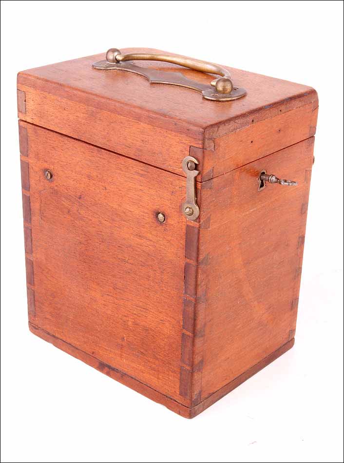En la base de latón que podemos ver bajo el cristal aparece la inscripción J. Carpentier – Ingr. Constr. A Paris, junto con el número de serie del óhmetro: 9545 – 2. Corresponde a Jules Carpentier (1851-1921), inventor e ingeniero francés. Todas las partes de las que consta el óhmetro se encuentran en muy buenas condiciones: el cristal protector es original y está intacto, mientras que el latón dorado no muestra signos de óxido ni deterioro. La escala es claramente legible, y el panel donde se conectan las clavijas y se seleccionan las funciones conserva todas las piezas originales. La caja de madera de caoba que contiene todo el sistema está en muy buen estado de conservación: llaman la atención las sólidas y atractivas uniones en cola de milano, muy delicadas y realizadas a mano. El asa, el cierre y la cerradura con la llave son también originales; estas dos últimas funcionan perfectamente.
