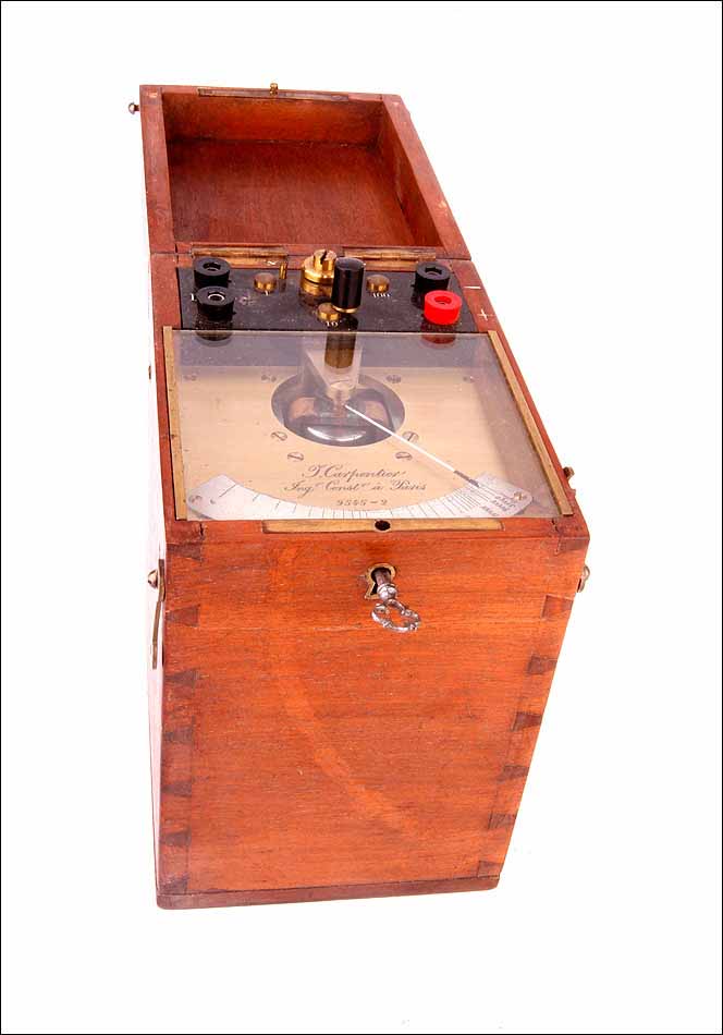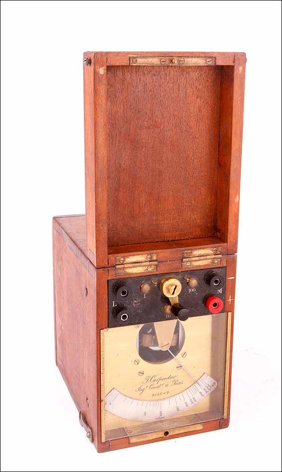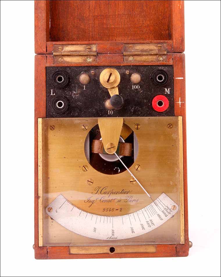 Este hermoso aparato de medición eléctrica es un óhmetro u ohmímetro, fabricado por J. Carpentier en París a finales del siglo XIX o principios del XX (circa 1900). El ohmímetro se encuentra en fantástico estado de conservación.