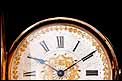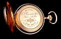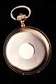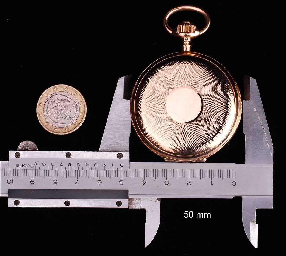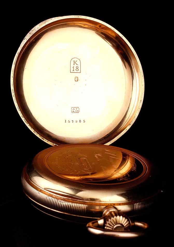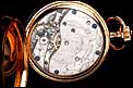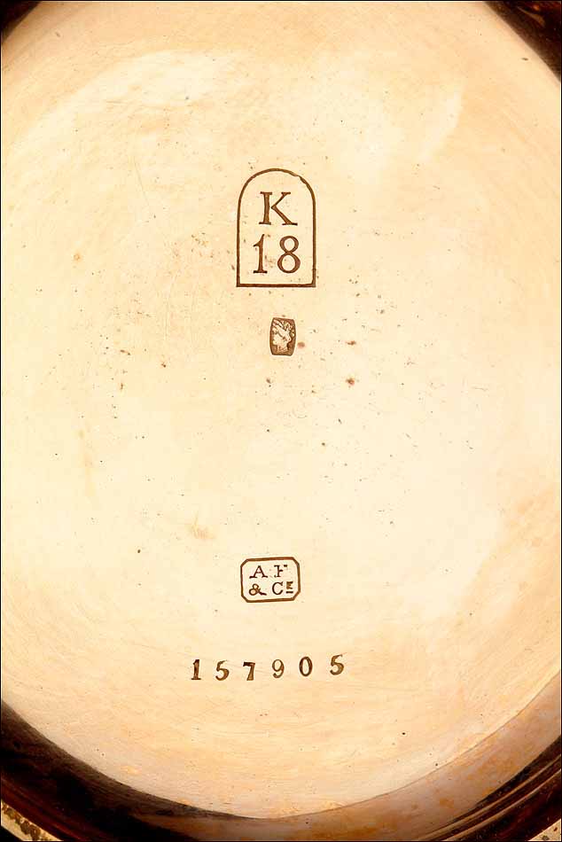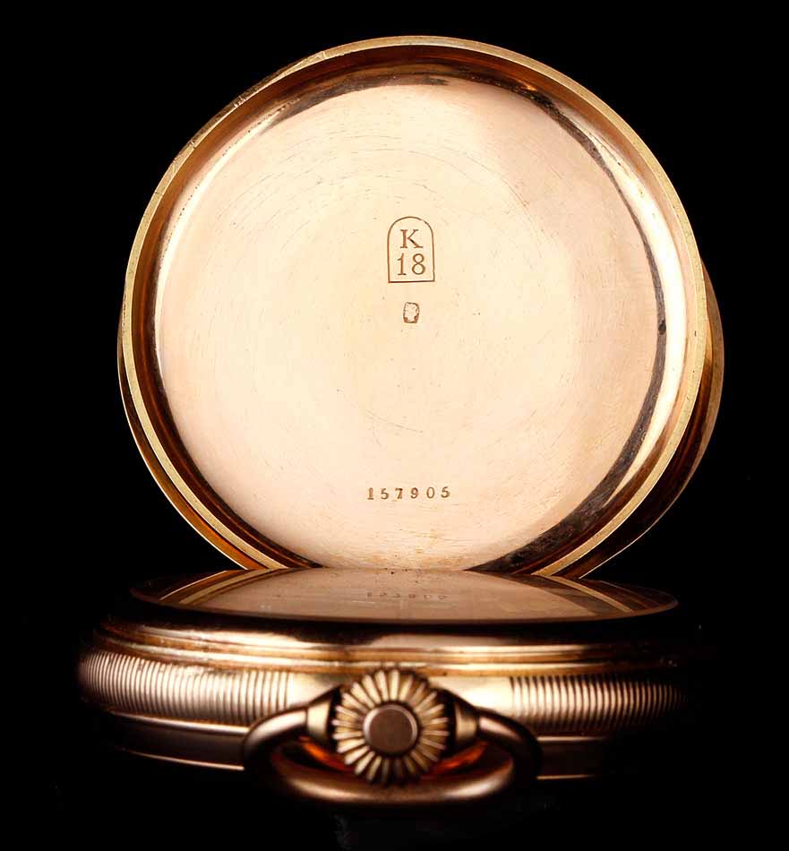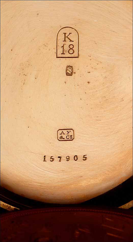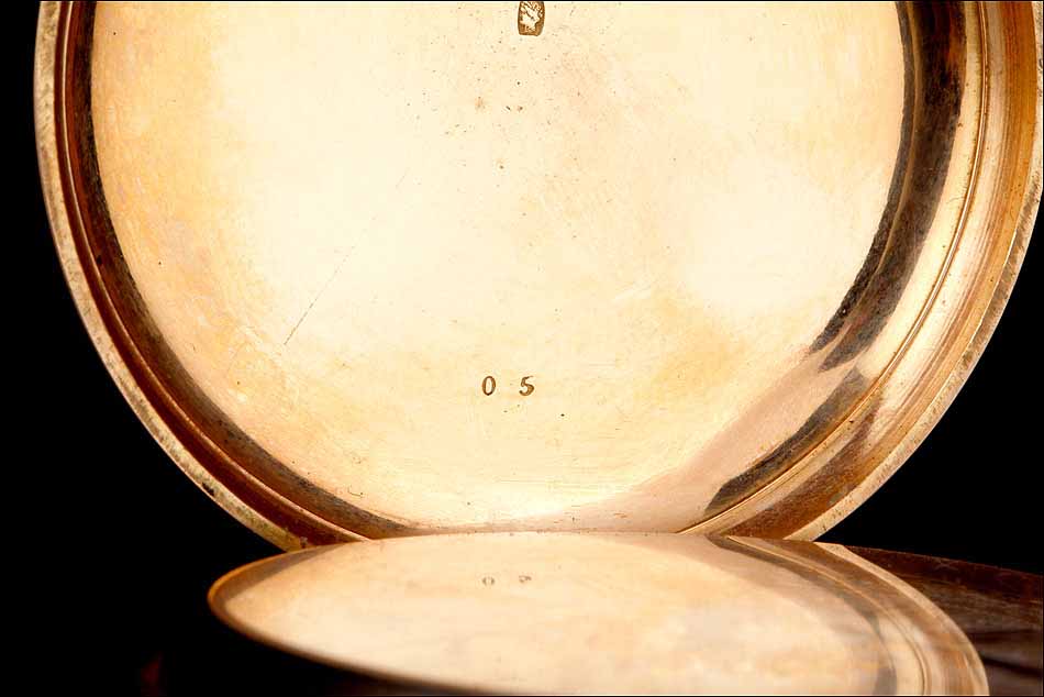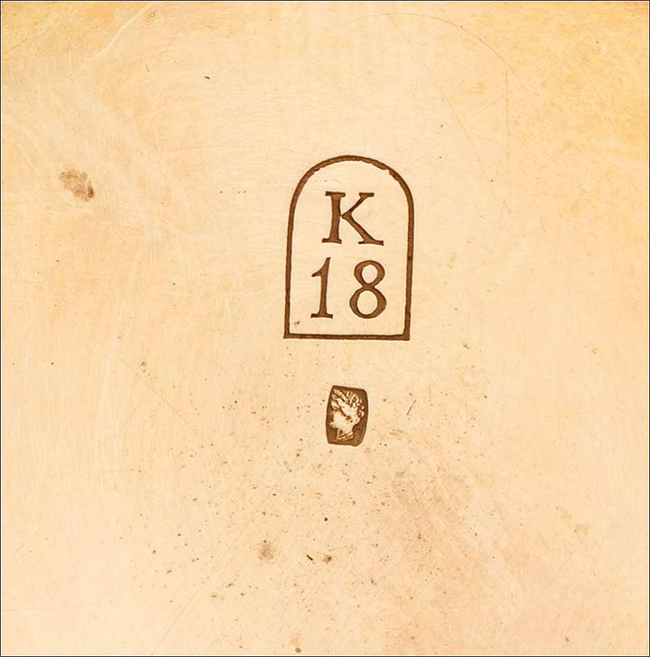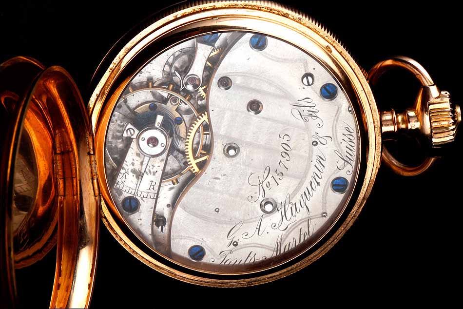En el interior de la tapa delantera encontramos el sello 18K (que indica los quilates) acompañado del contraste correspondiente al oro suizo. La tapa guardapolvo está firmada con el nombre del fabricante y lleva también los contrastes; bajo ella, una tapa de cristal protege el mecanismo. Este lleva el mismo número de serie grabado en el metal, acompañado de la firma de G. A. Huguenin. Además, en el colgante podemos ver otro contraste de la época.