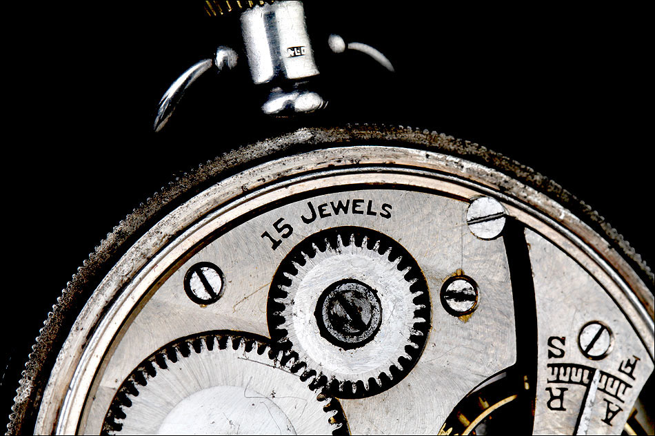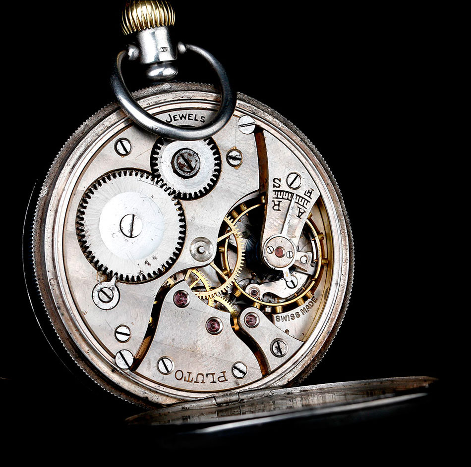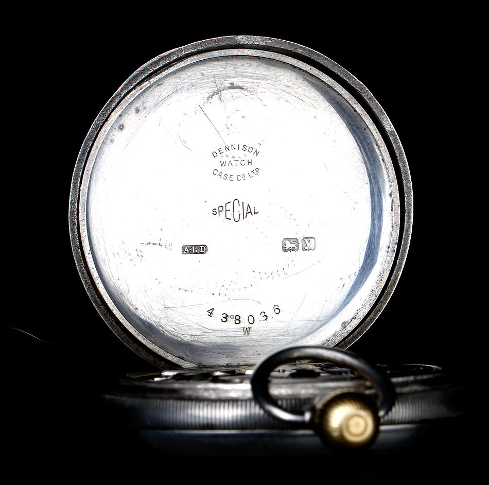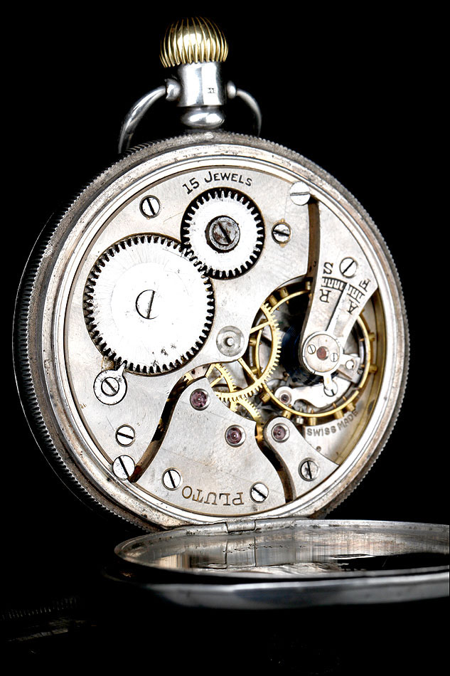 La tapa guardapolvo es también de plata maciza. Su cara vista es lisa, mientras que la cara interna lleva varios contrastes (entre ellos el león correspondiente a la plata inglesa, que se repite en varias partes del reloj), el número de serie antes mencionado y la inscripción DENNISON WATCH CASE CO. LTD. – SPECIAL. Bajo ella encontramos el mecanismo del reloj, en el cual podemos ver grabada la palabra PLUTO y la inscripción 15 JEWELS.