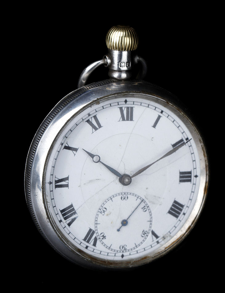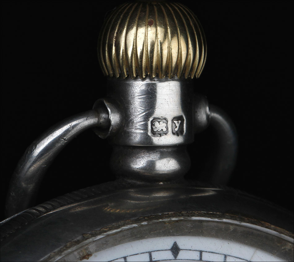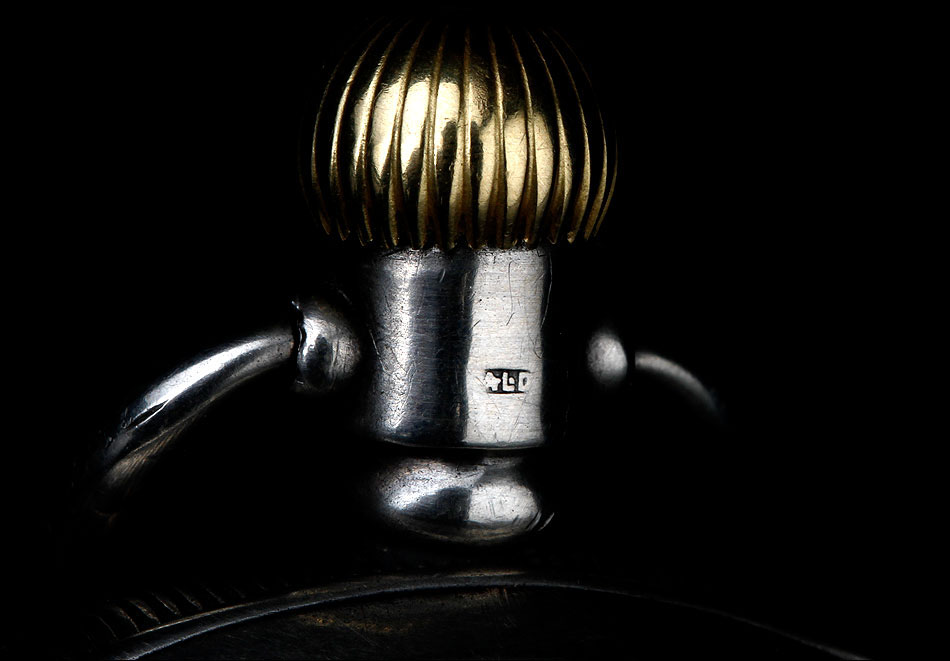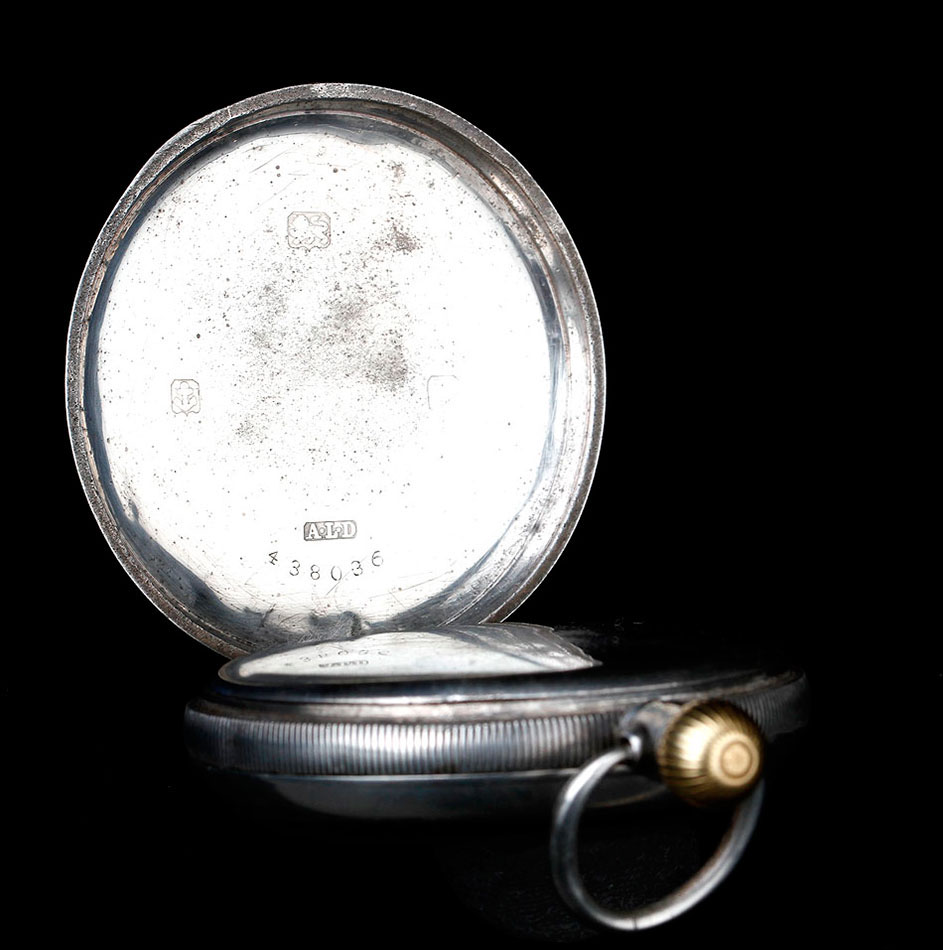 La caja del reloj está fabricada en plata maciza contrastada. Podemos ver varios contrastes que indican su procedencia y calidad, repartidos por las tapas, el colgante y la caja en sí. La plata está muy bien conservada y muestra una hermosa pátina depositada por el paso del tiempo. La esfera tiene algunos pelos, pero está completa y muestra claramente los números romanos de color negro. Lleva agujas rectas y segundero: su diseño es clásico, simple y elegante. La tapa trasera lleva un fino grabado con forma de escudo, ligeramente desvaído; en su interior podemos ver varios contrastes y el número de serie 438036.