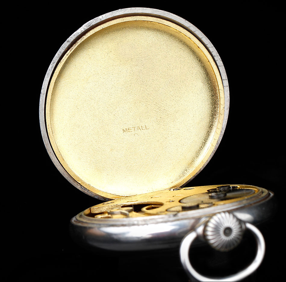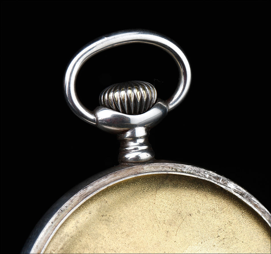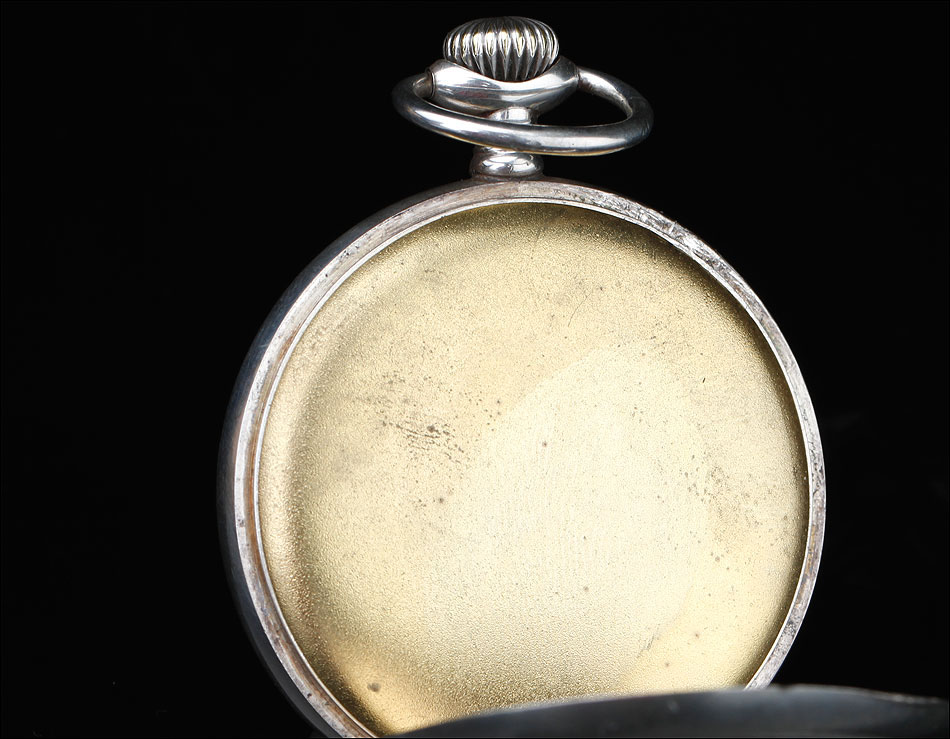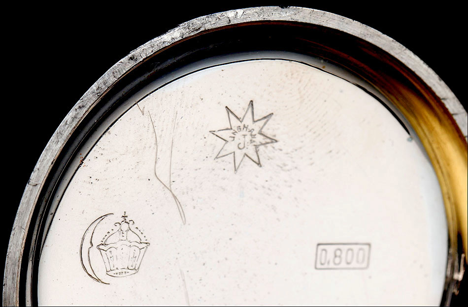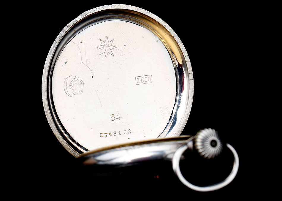 La esfera del reloj es de porcelana blanca con números arábigos negros y segundero. Está en magníficas condiciones, sin desperfectos ni pelos. Las agujas son rectas, de metal cobrizo. Sobre la esfera, en el colgante podemos ver uno de los contrastes que marcan a este reloj. En el interior de la tapa posterior descubrimos la marca del fabricante (una estrella con la palabra JUNGHANS en su interior), la ley de la plata (0,800), un sello con una corona y una media luna (la marca alemana para la plata fabricada a partir de finales del siglo XIX), el número 34 y, bajo él, el número de serie C348102. La tapa guardapolvo es de metal dorado y plateado; bajo ella, la maquinaria lleva grabada la firma antes mencionada y el número 0085527.