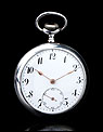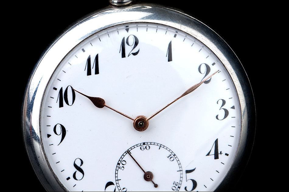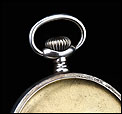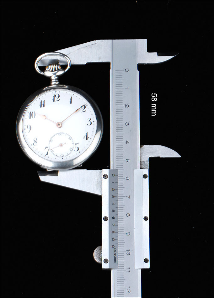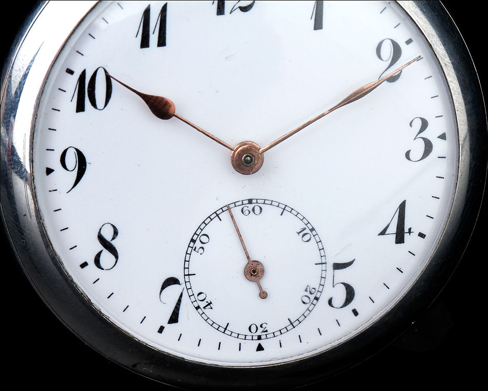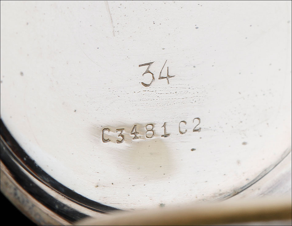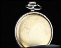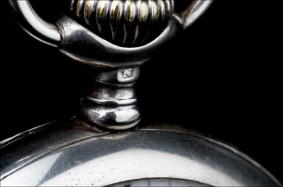 La esfera del reloj es de porcelana blanca con números arábigos negros y segundero. Está en magníficas condiciones, sin desperfectos ni pelos. Las agujas son rectas, de metal cobrizo. Sobre la esfera, en el colgante podemos ver uno de los contrastes que marcan a este reloj. En el interior de la tapa posterior descubrimos la marca del fabricante (una estrella con la palabra JUNGHANS en su interior), la ley de la plata (0,800), un sello con una corona y una media luna (la marca alemana para la plata fabricada a partir de finales del siglo XIX), el número 34 y, bajo él, el número de serie C348102. La tapa guardapolvo es de metal dorado y plateado; bajo ella, la maquinaria lleva grabada la firma antes mencionada y el número 0085527.