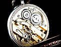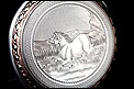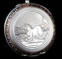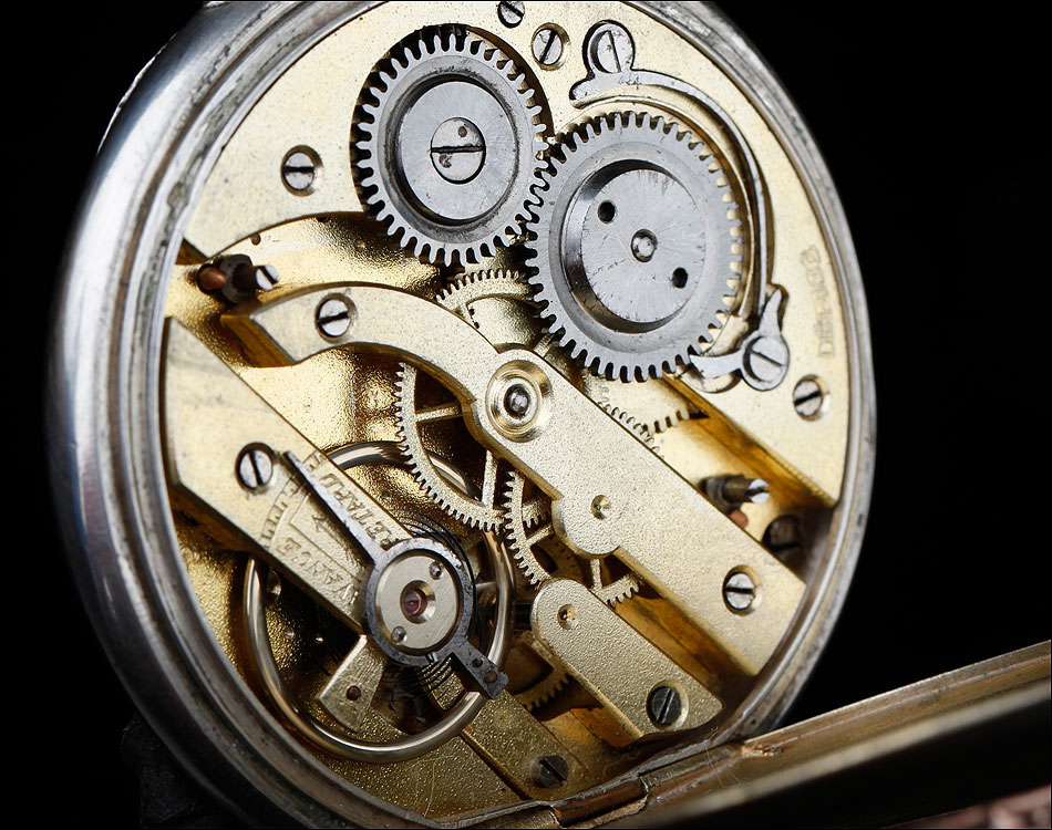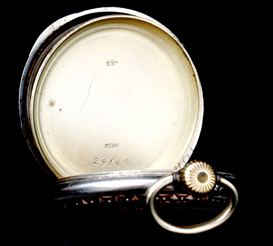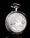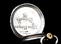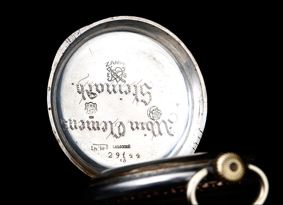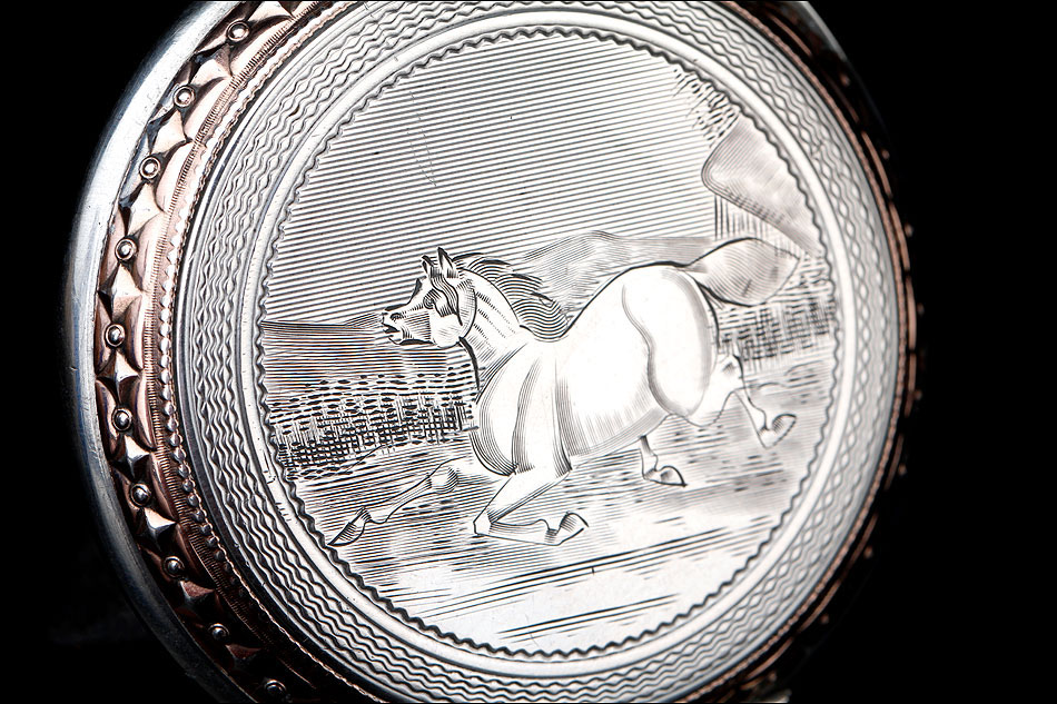 Igualmente atractiva es también la tapa posterior del reloj. Está decorada con un grabado realizado a mano que representa a un caballo galopando por el campo. Su cara interior lleva la dedicatoria antes mencionada y varios contrastes: el sello del platero (con un corazón y un arco con flechas), la ley de la plata (un escudo con las letras HHH y el número 0,800), la marca de la plata alemana (una media luna y una corona) y la inscripción GALONNE seguida del número 34 y del serial 29144. Este número de serie aparece también grabado en el interior de la tapa guardapolvo.