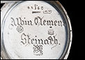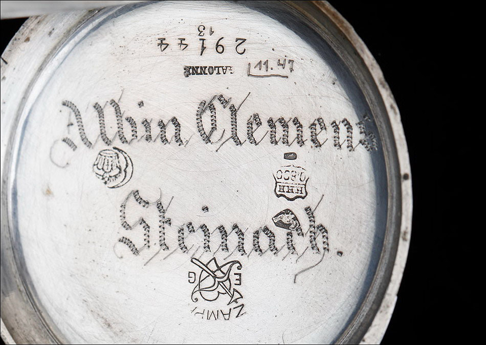 Bello reloj de bolsillo antiguo con caja de plata maciza, fabricado en Alemania a principios del siglo XX (circa 1900). El reloj es de elegante y sencilla factura, y está decorado con un grabado realizado a mano en su tapa posterior. La caja es de plata de ley 800, a excepción de la tapa guardapolvo, realizada en metal plateado. La maquinaria se ha limpiado y ajustado al detalle, por lo que podemos afirmar que a día de hoy el reloj funciona a la perfección. La tapa trasera lleva grabada una dedicatoria en su cara interior, realizada a mano en letras góticas punzonadas. Se trata del nombre propio Alvin Clemens Steinarch, que probablemente fuera propietario del reloj en algún momento de su historia.