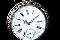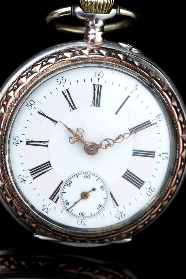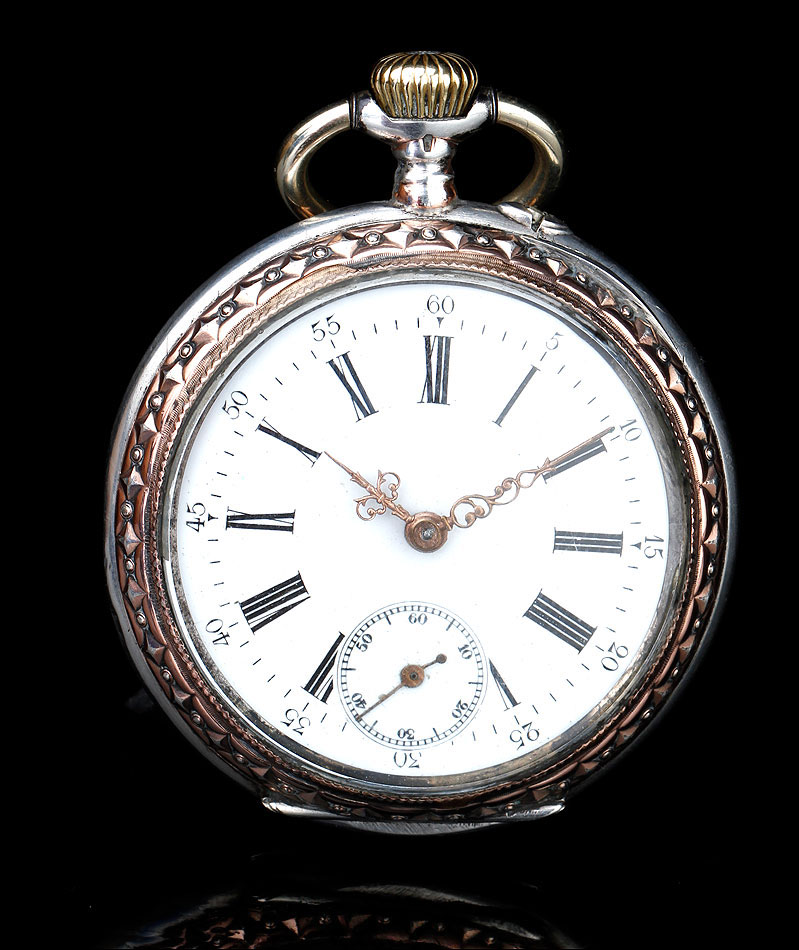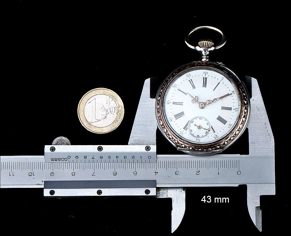 La cara delantera del reloj es muy bella. Rodeando al cristal que protege la esfera podemos ver la caja de plata grabada con un motivo decorativo. Este motivo, al igual que la corona, han sido delicadamente dorados para crear un hermoso contraste con la plata lisa. La esfera es de porcelana blanca y está muy bien conservada, mostrando solo un fino pelo apenas perceptible. Los números son romanos, en color negro, mientras que las agujas de metal cobrizo tienen una bella forma de filigrana. La esfera lleva segundero y minutos en números arábigos.