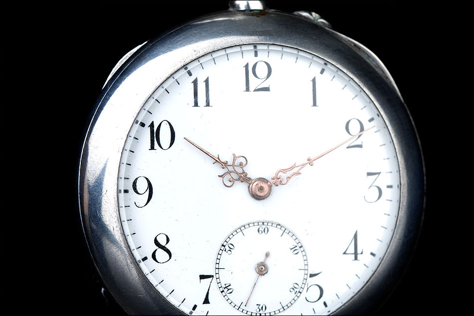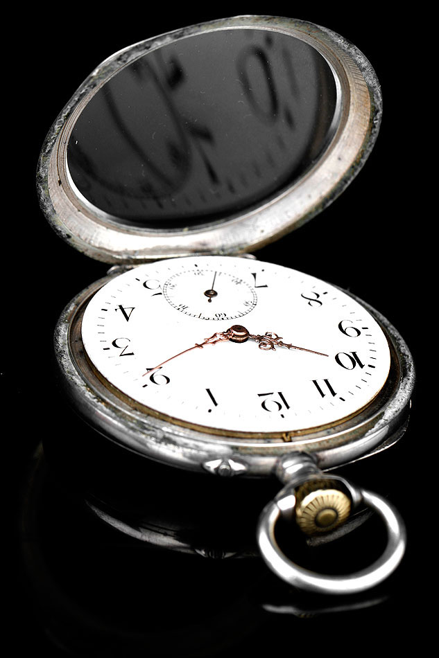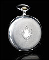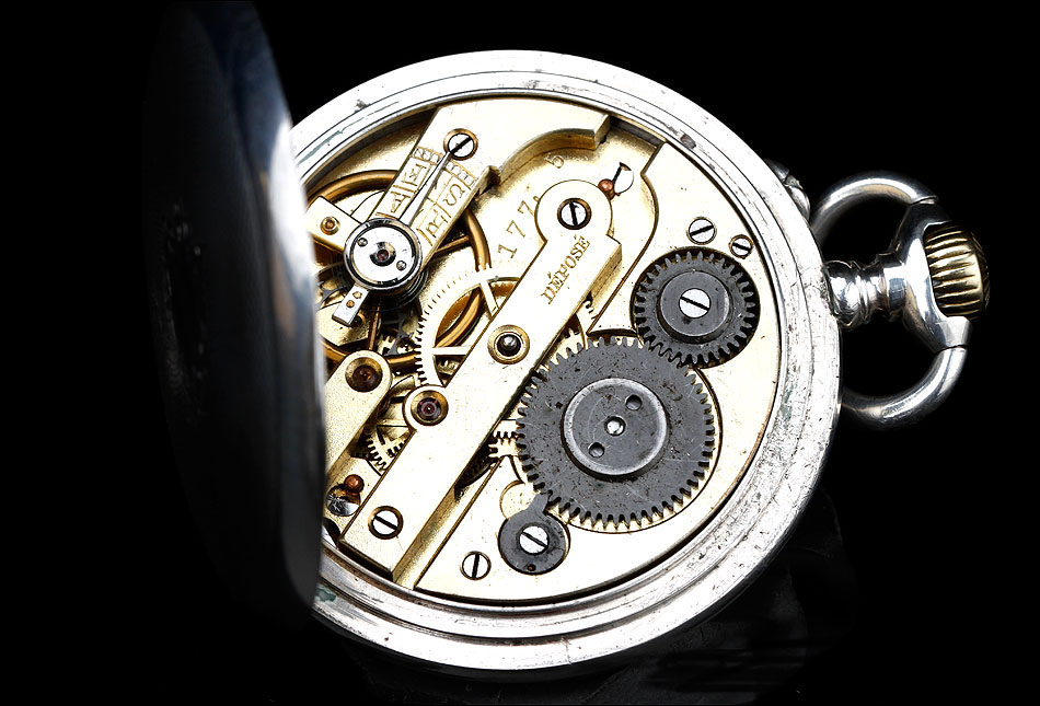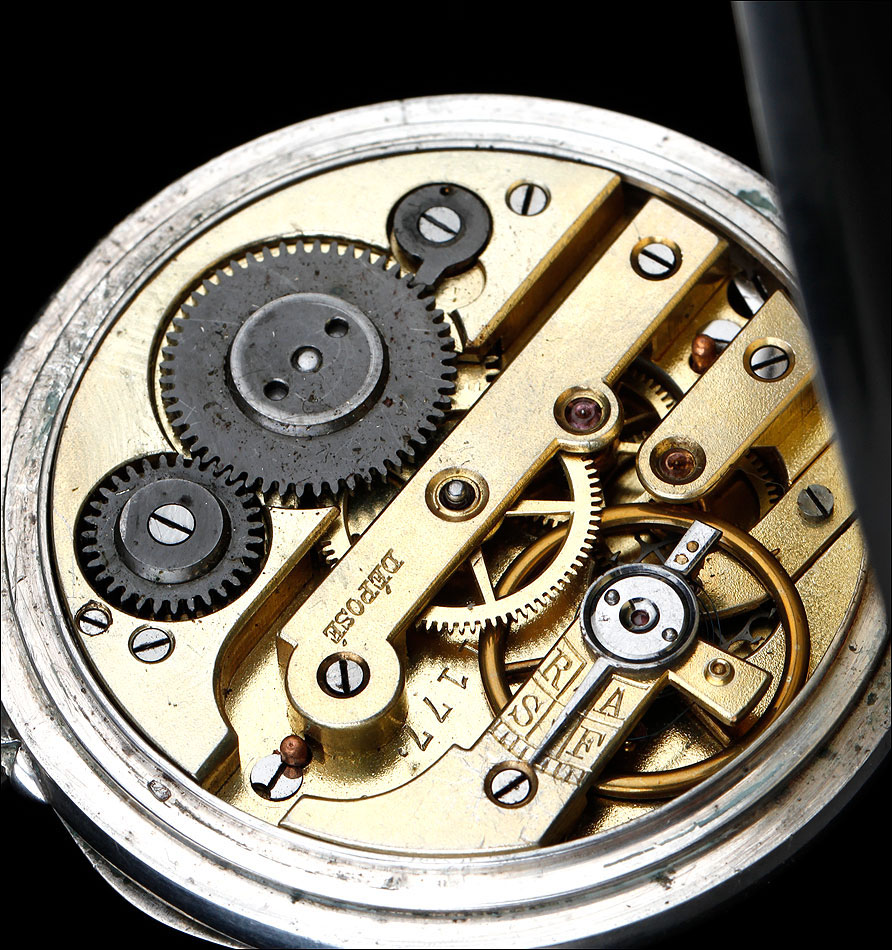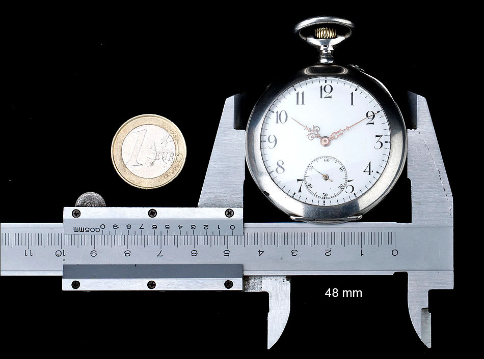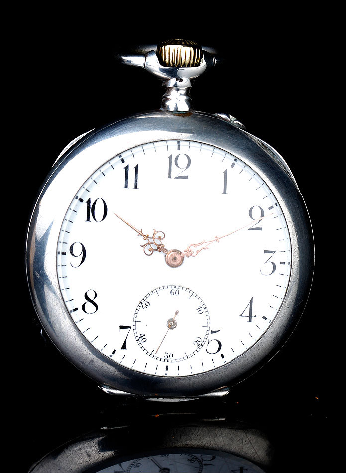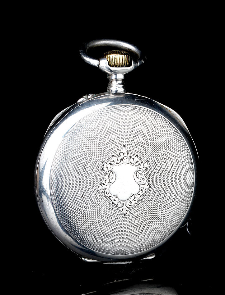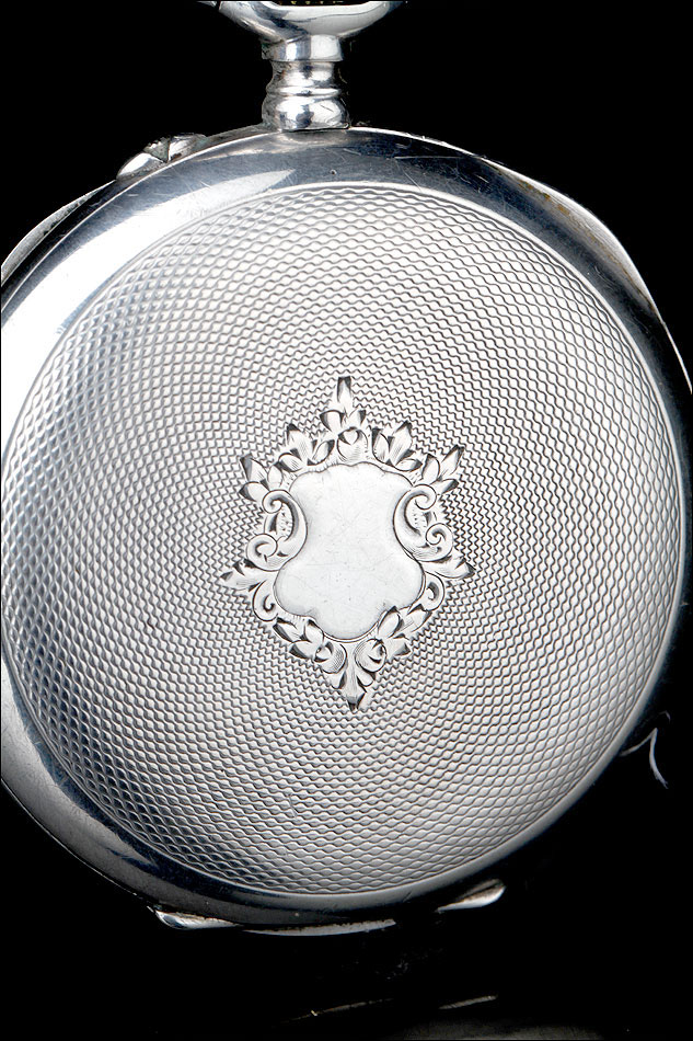La caja de plata contrastada está en buen estado, sin golpes ni desperfectos, y lo mismo cabe decir de la esfera y el vidrio delantero. La esfera es de porcelana blanca y lleva números romanos en color negro. Las manecillas son de metal cobrizo y tienen una delicada forma de filigrana. Como es habitual es este tipo de relojes, también hay un segundero. La tapa trasera de plata está decorada con un fondo guilloché en grano de avena; en el centro lleva un bonito escudo grabado a mano. En su interior encontramos los contrastes de la plata alemana (una media luna y una corona) y de la plata suiza (un urogallo). Este último también aparece grabado en el colgante.