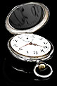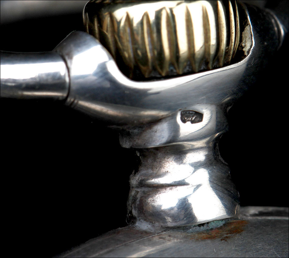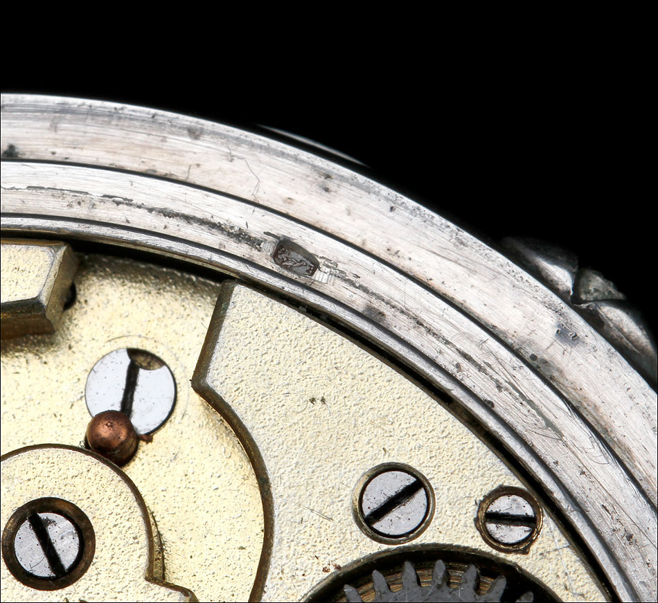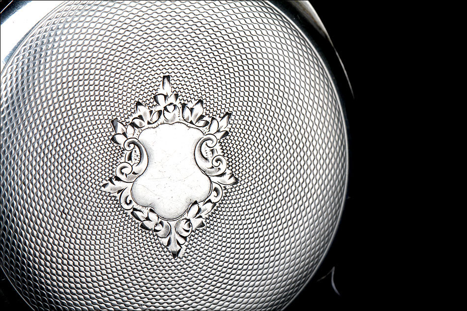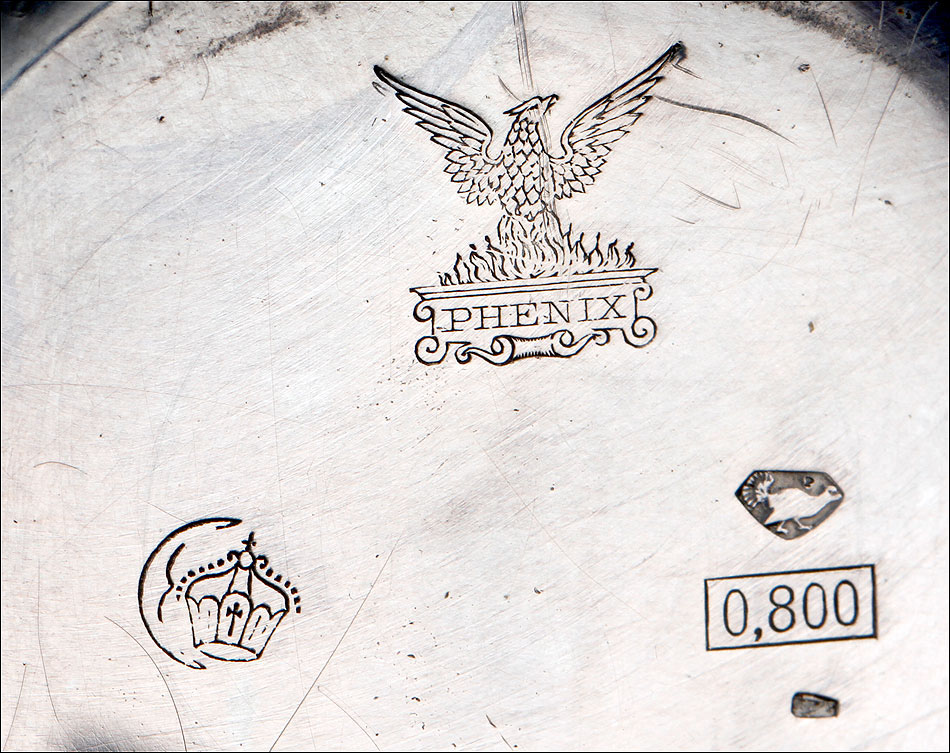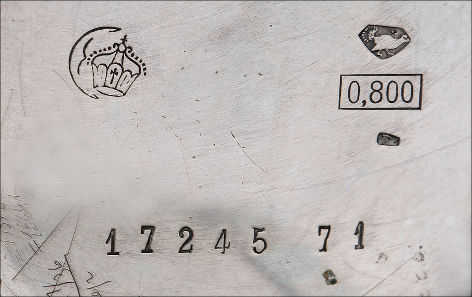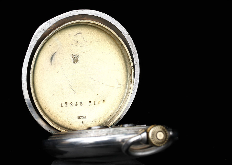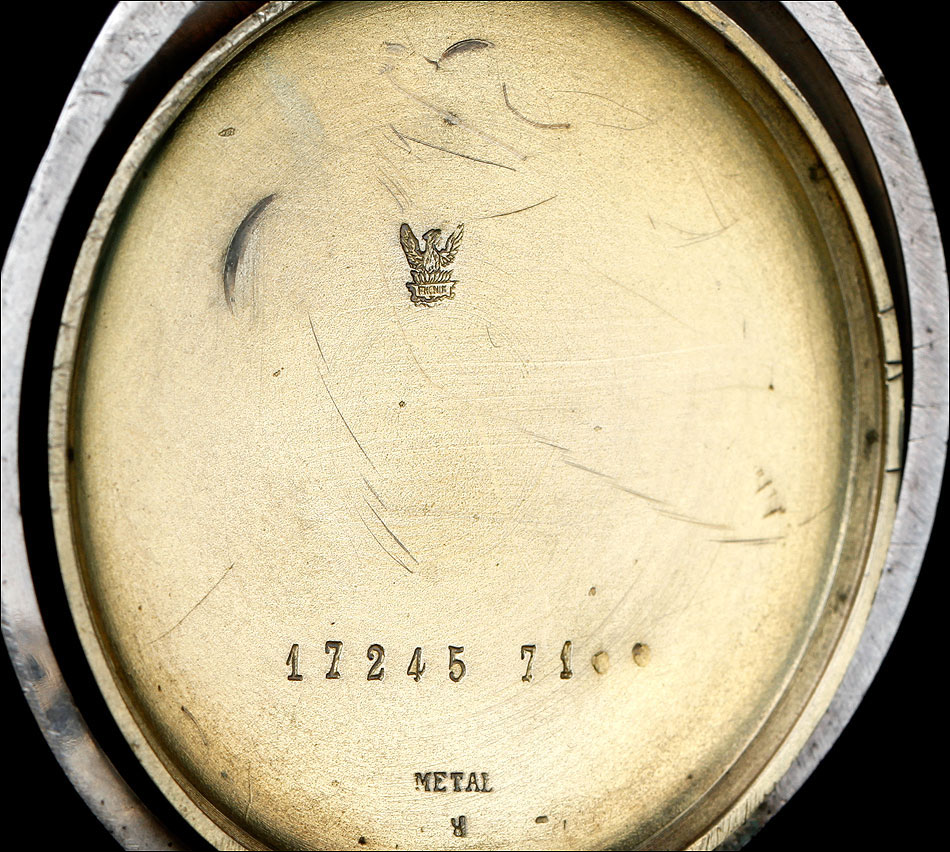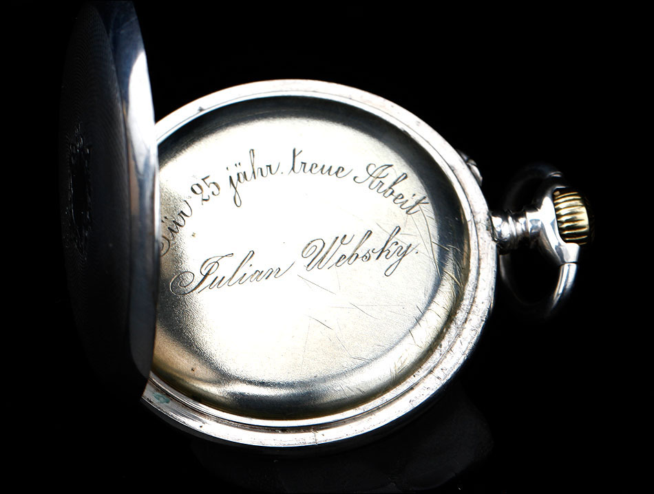 En la parte superior podemos ver el logotipo de la marca: un ave fénix desplegando las alas sobre un lecho de llamas. También encontramos la ley de la plata (0,800) y el número 17245, seguido por la cifra 71. Bajo esta tapa aparece la tapa guardapolvo, que lleva grabado en su cara vista el nombre Julian Websky; en su cara interna encontramos de nuevo el logotipo de la marca y el número de serie. Tal y como indica la palabra METAL, esta tapa no es de plata sino de metal dorado y plateado.