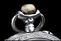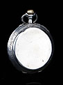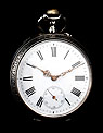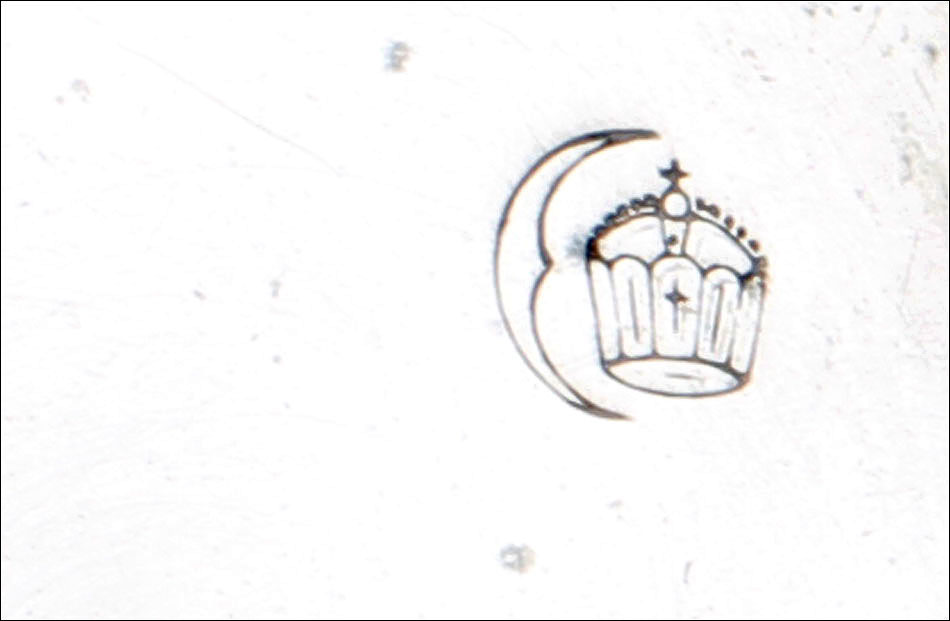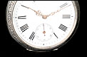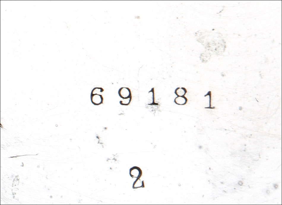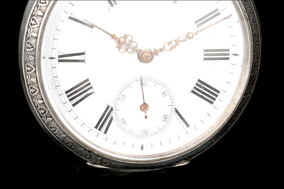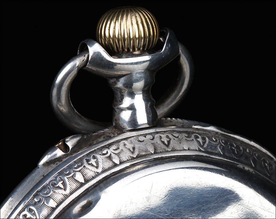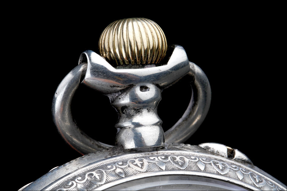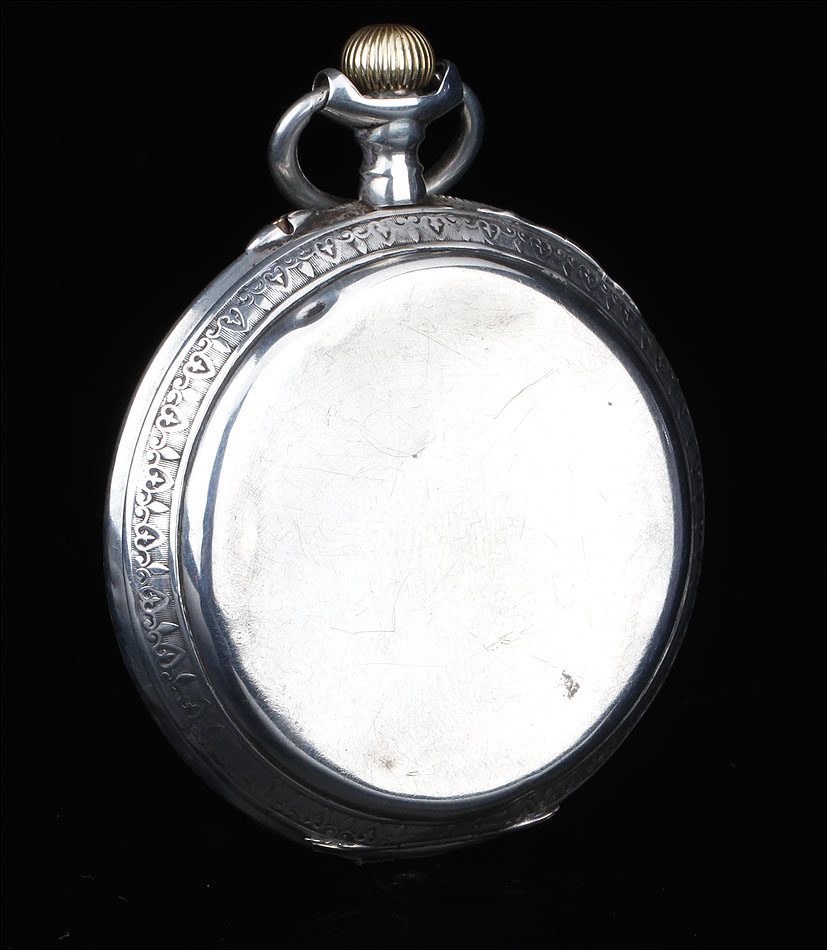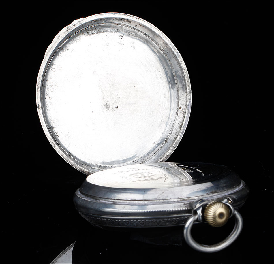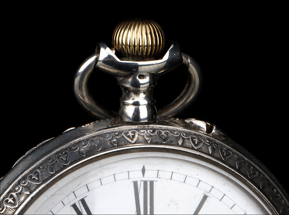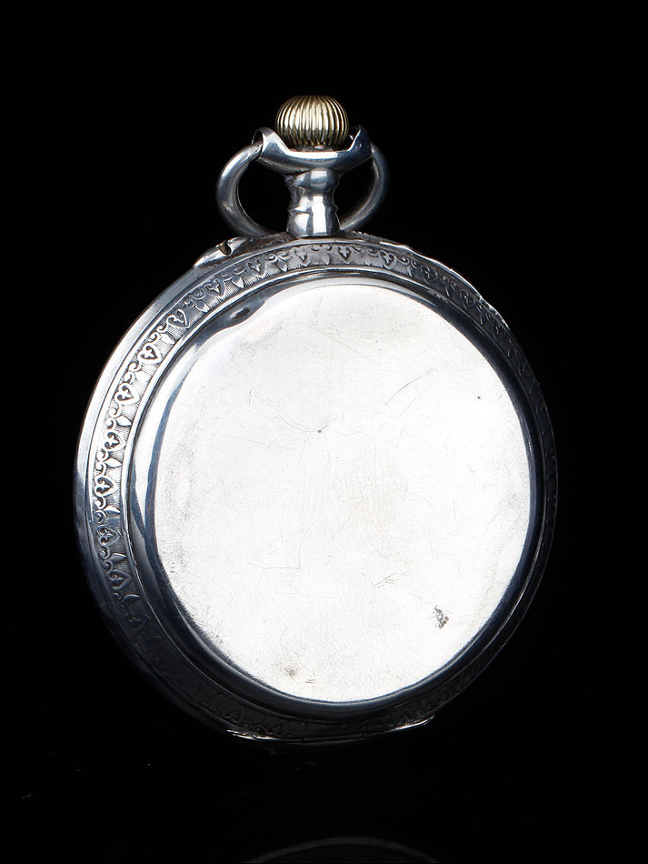 Alrededor de la esfera, la superficie de plata se ha labrado a mano con una elegante cenefa con símbolos decorativos clásicos (flores de lis y picas). La esfera está protegida por el cristal original, siendo de color blanco con números romanos negros. Tiene segundero y manecillas de filigrana dorada, todo ello en excelentes condiciones. La tapa trasera es de plata lisa, sin decoración alguna; en su interior podemos ver de nuevo el contraste del urogallo y una marca con una media luna y una corona, correspondiente a la plata alemana. También podemos el número de serie 69181 – 2.