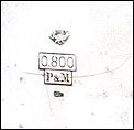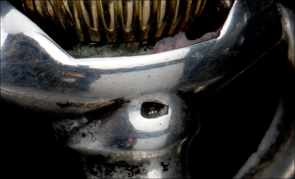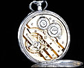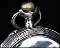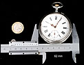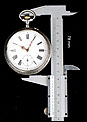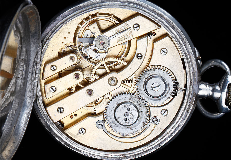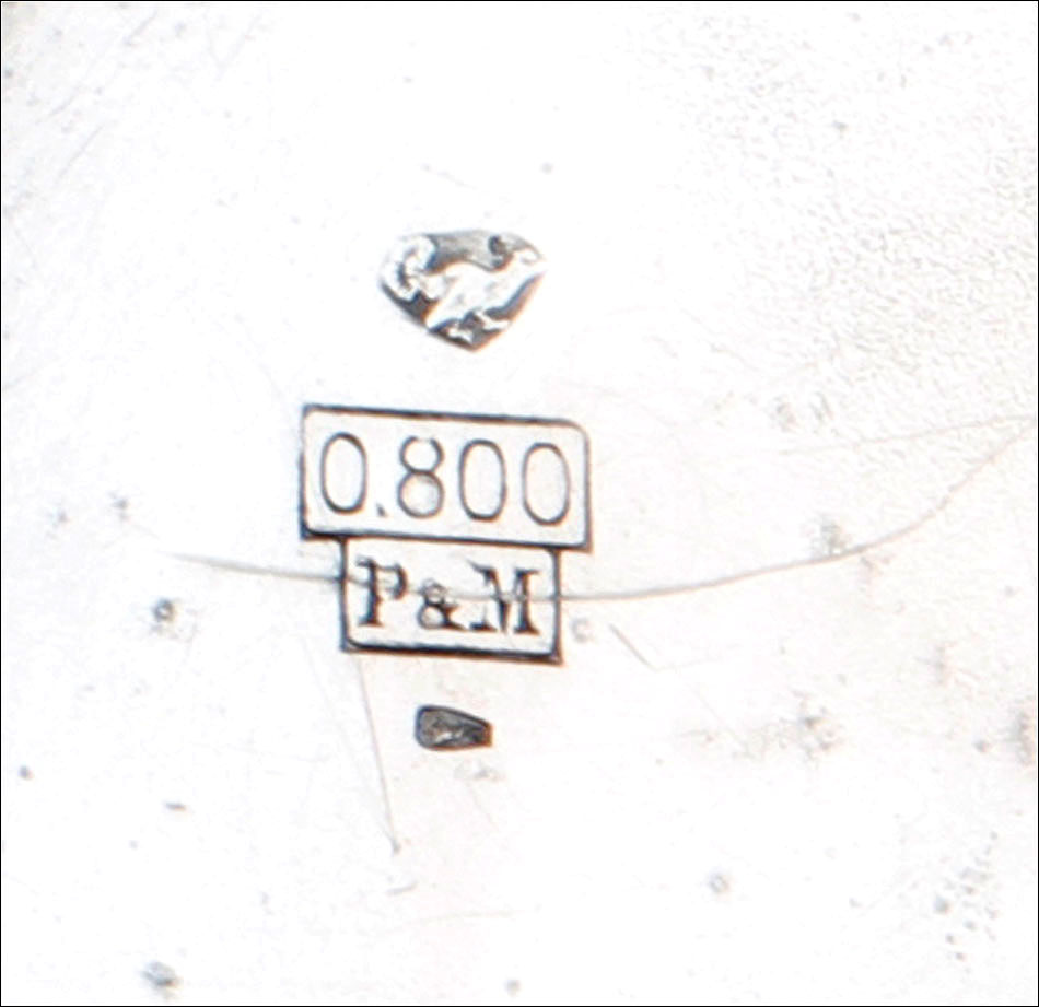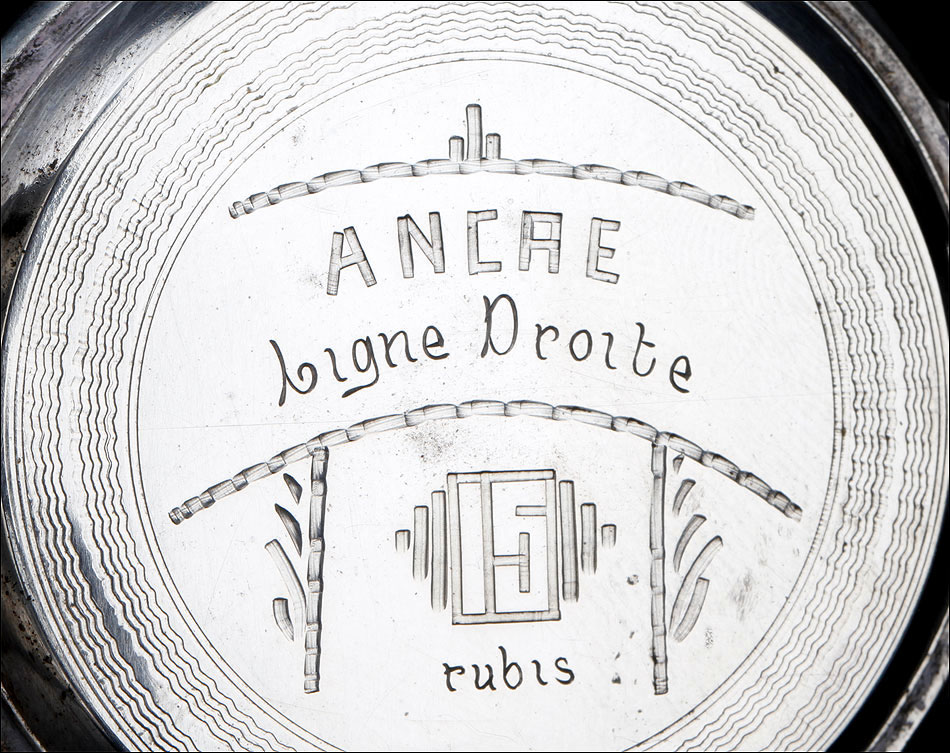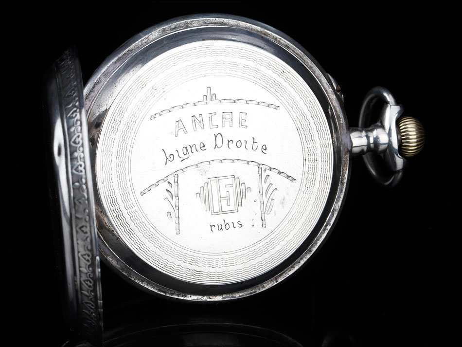La tapa guardapolvo lleva una inscripción en francés grabada en su cara vista, con detalles acerca del mecanismo del reloj. Entre otros, se indica que contiene 15 rubíes. Además de los contrastes mencionados antes, en la caja del reloj también encontramos un sello que indica la ley de la plata (0,800) y el contraste del platero: las iniciales P & M grabadas dentro de un rectángulo.