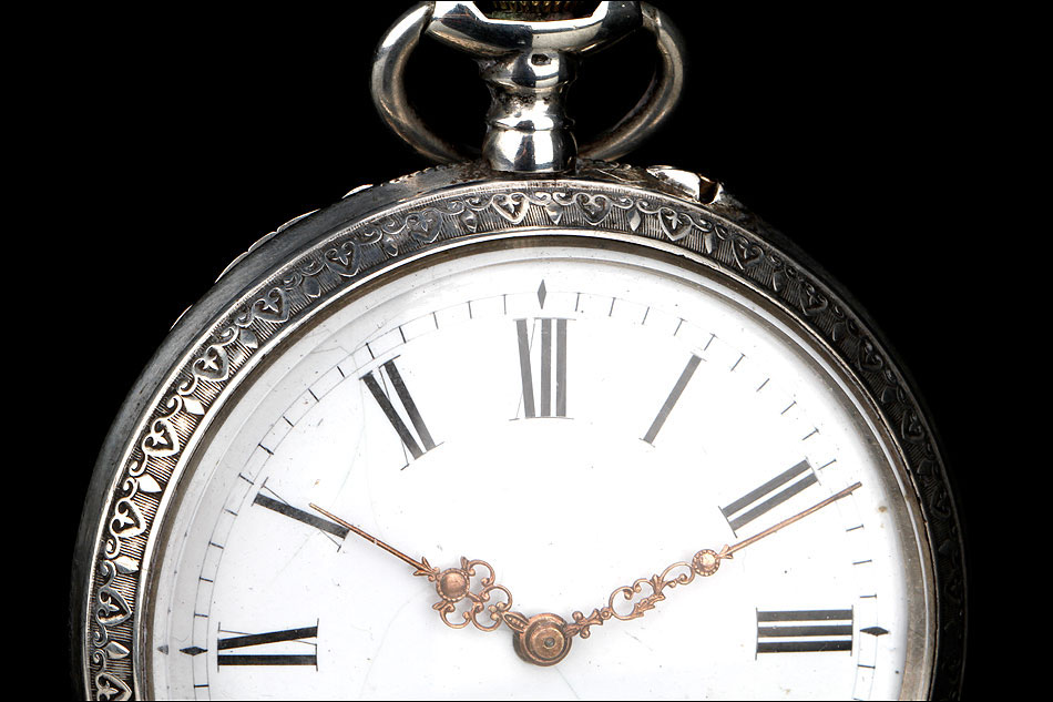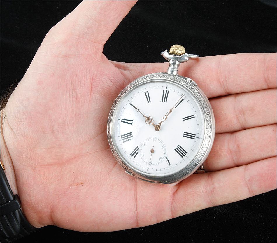 Antiguo reloj de bolsillo con caja de plata maciza grabada a mano, fabricado en Alemana circa 1890 y en muy buen estado de conservación. El reloj lleva distintos contrastes grabados en el metal, que dan fe de la calidad y el origen de la caja de plata. El mecanismo se ha limpiado y revisado a fondo para garantizar un rendimiento óptimo, de manera que a día de hoy el reloj funciona de maravilla. En el colgante (la pieza que une la corona con la caja) podemos ver un contraste con un urogallo, que identifica la plata suiza.