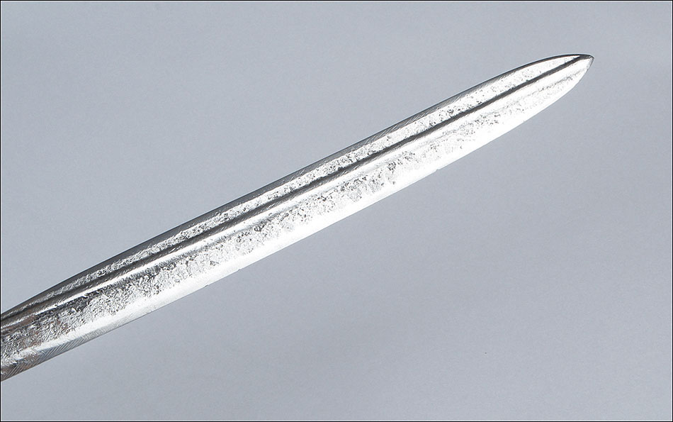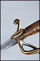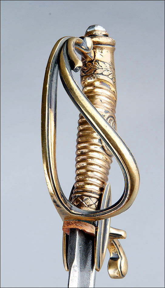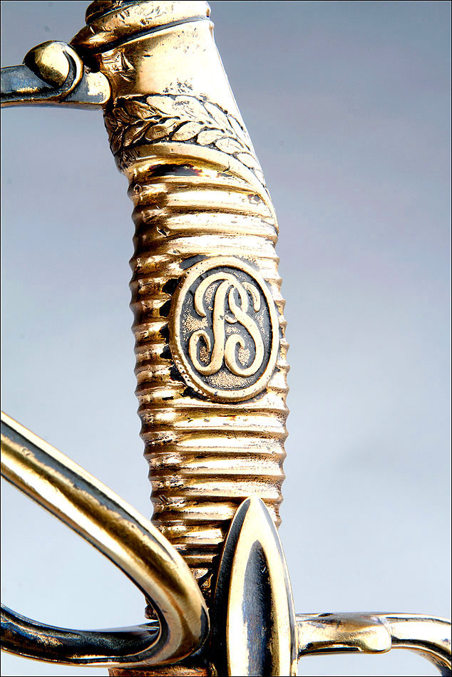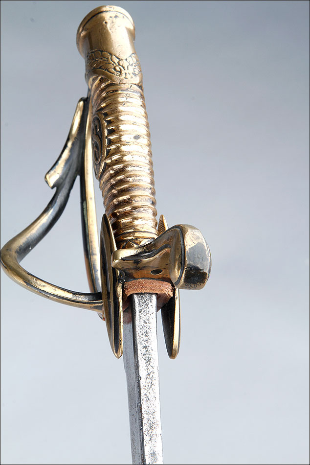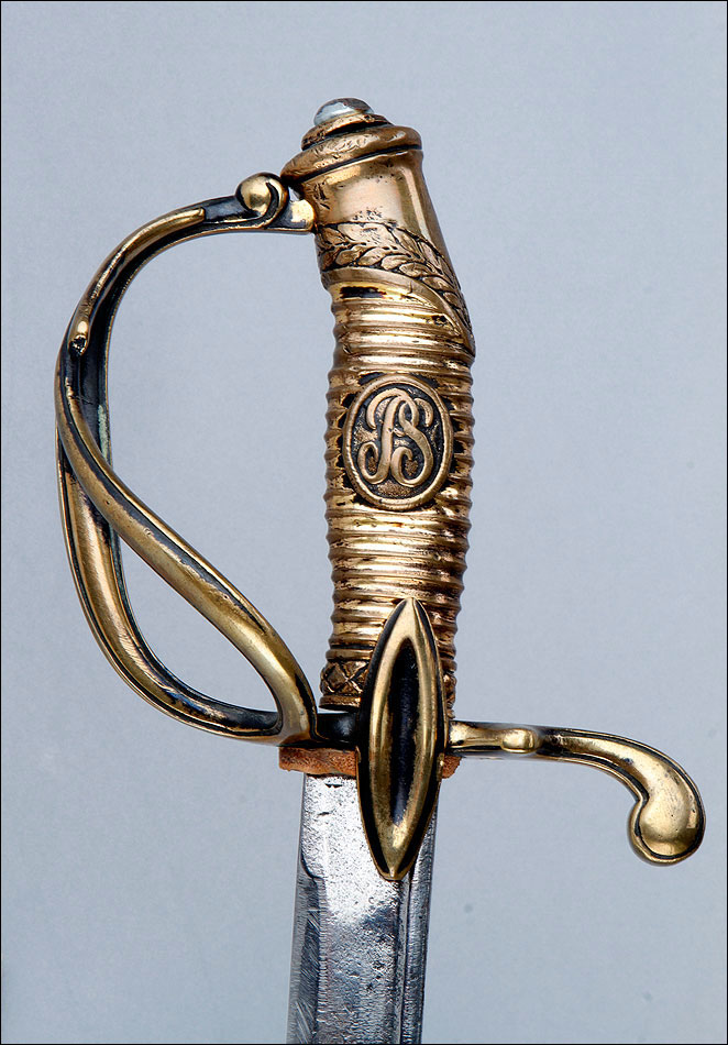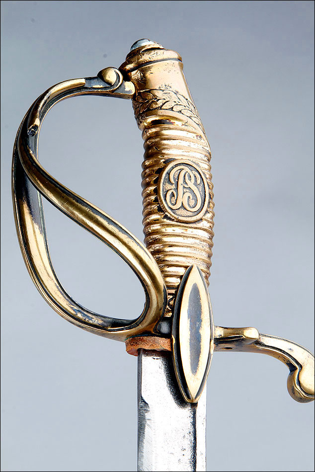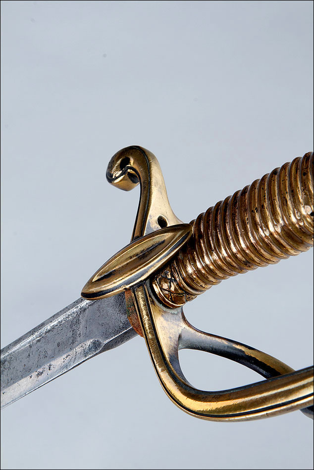 Sin duda, la parte más llamativa del sable es la empuñadura. En ella podemos ver las letras mayúsculas PS grabadas en un óvalo situado en la parte central del puño. Son la primera y última letra de la palabra PROVINCIALES, que nos indica que el portador del arma perteneció a este famoso cuerpo de reserva. El puño muestra superficie estriada, imitando el clásico diseño con cuero y torzal, y lleva grabado también un motivo vegetal. La cruz se curva hacia arriba, creando un bello guardamano formado por dos gavilanes. En el centro de la cruz hay un adorno de latón en forma de óvalo estilizado.