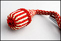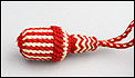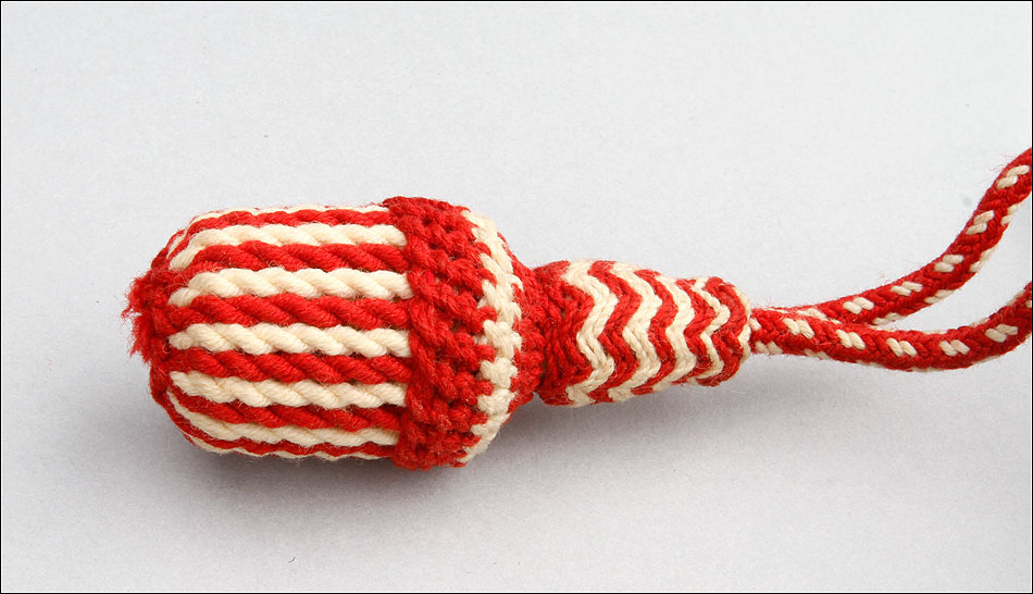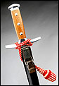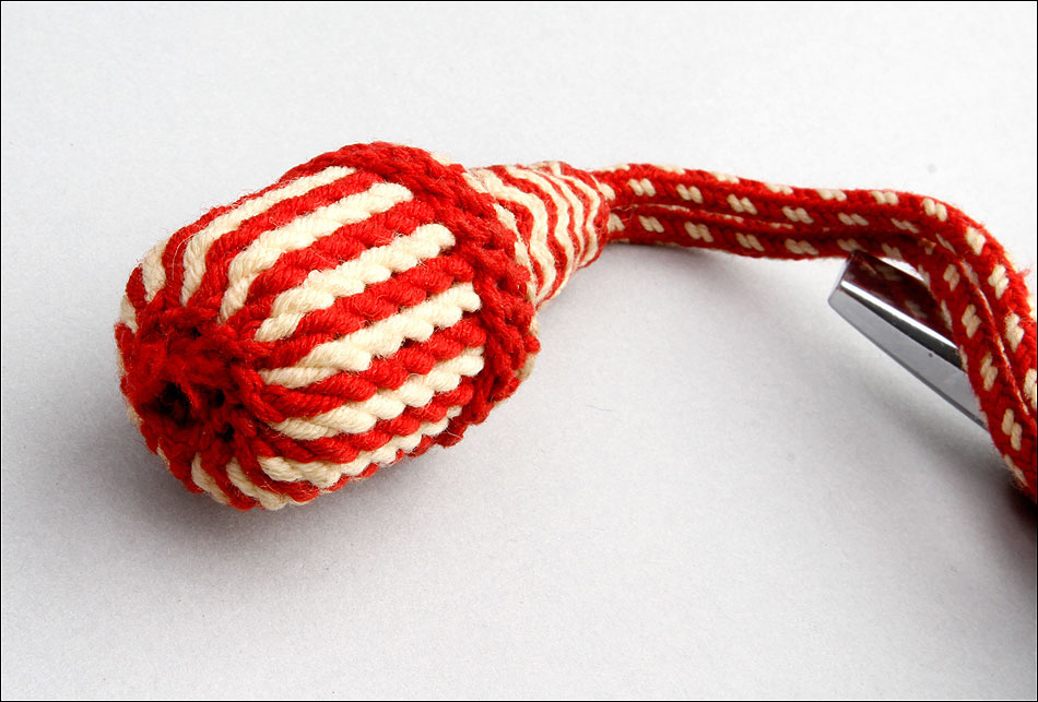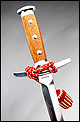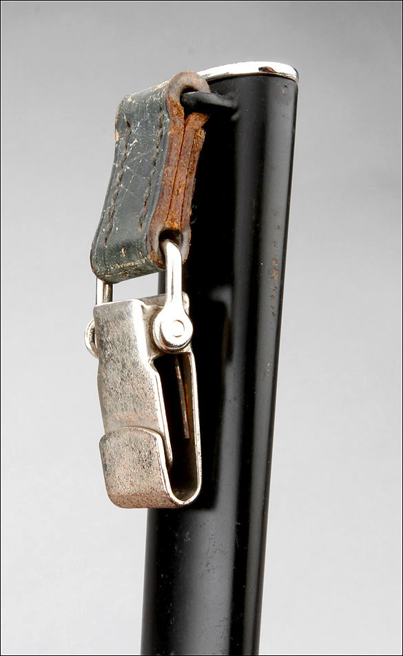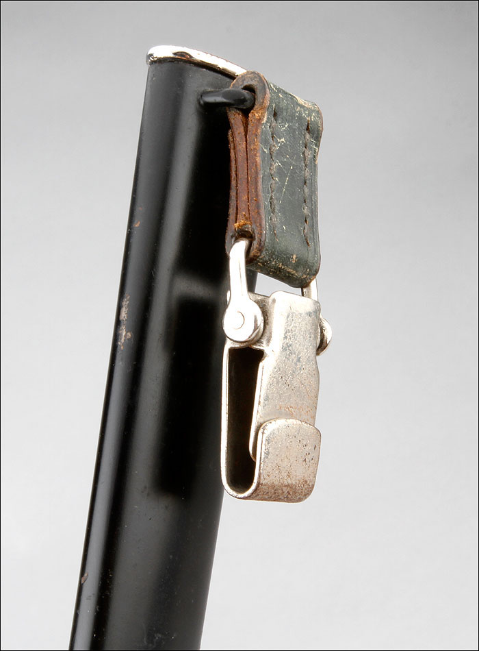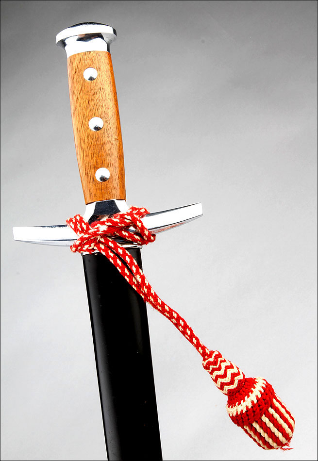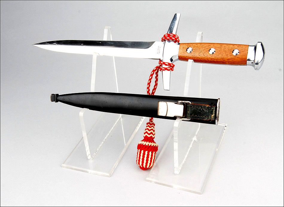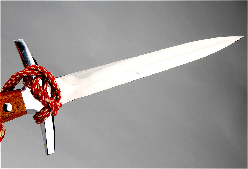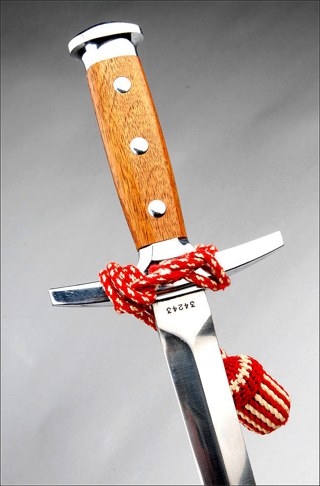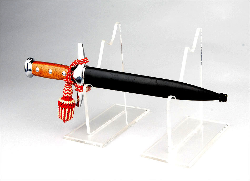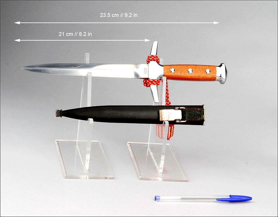 En la empuñadura distinguimos la cruz de acero con gavilanes rectos y cortos clásica de las dagas; el puño va revestido y reforzado mediante dos piezas de madera maciza fijadas con tres remaches. La madera es de color castaño dorado y está en muy buen estado. La empuñadura se remata mediante un pomo de acero. Envolviendo la empuñadura encontramos un bello porta-espadas: un cordón doble de lana de color rojo y blanco, rematado por una borla. El porta-espadas servía para conectar la daga con la muñeca del propietario, evitando que se le cayera o la perdiera durante en la batalla. Por último, cabe destacar la sobria vaina que protege la hoja, fabricada en piel negra y con enganche de metal y cuero para fijarla al uniforme.