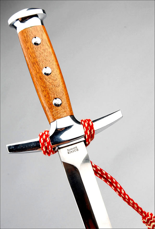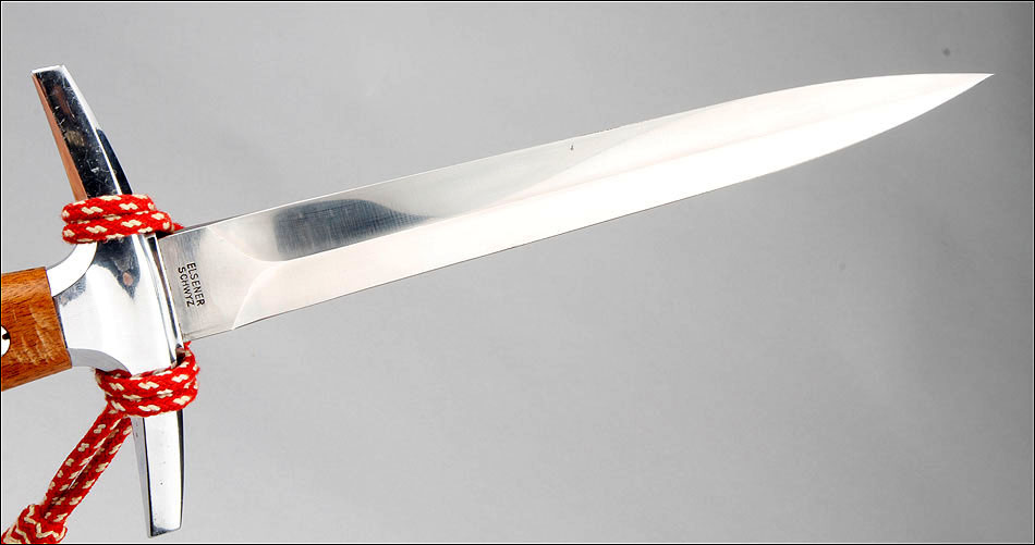 Fantástica daga suiza para oficial de infantería, de mediados del siglo XX (II Guerra Mundial) y en impresionante estado de conservación. La daga tiene hoja de acero liso, brillante y sin rastros de óxido o deterioro. Lleva empuñadura de acero y madera, vaina de cuero negra y borlón tejido en los colores de la bandera suiza (blanco y rojo). En la hoja de la daga, cerca de la empuñadura podemos ver una inscripción en letras mayúsculas: ELSENER SCHWYZ. Corresponde a la empresa fundada por Karl Elsener a finales del siglo XIX para fabricar espadas, cuchillos y navajas.