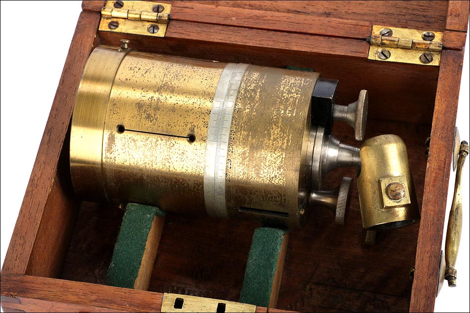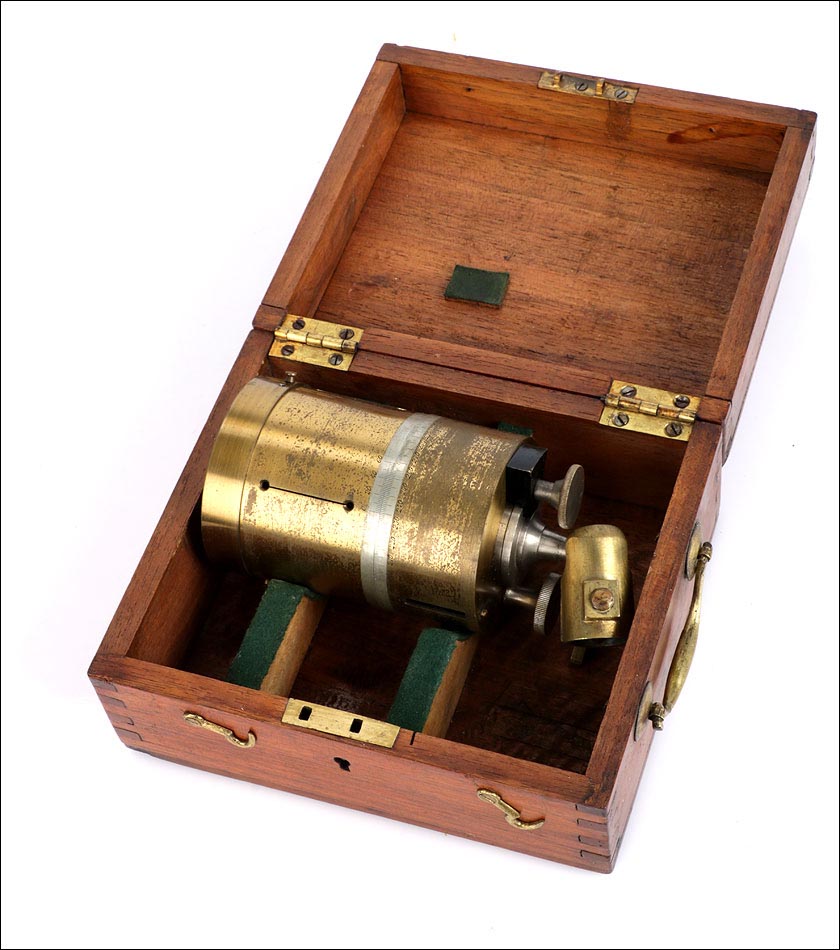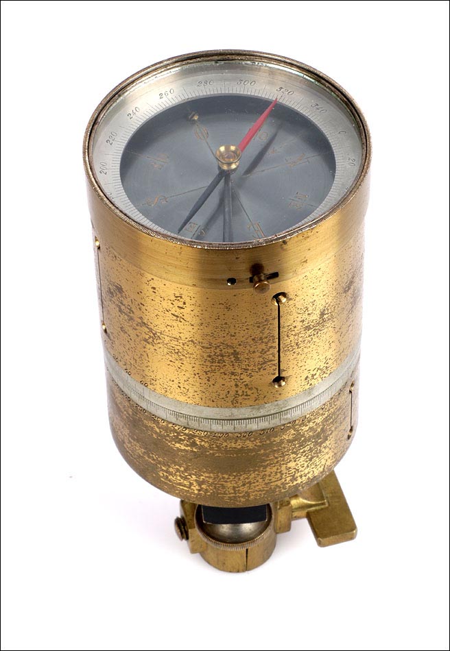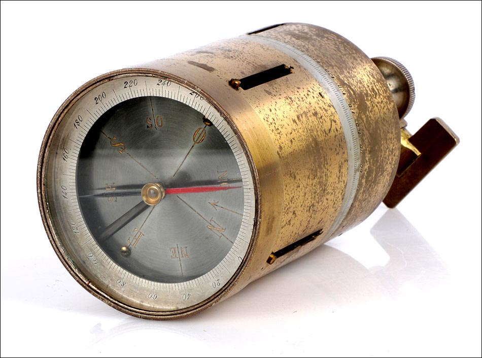 Antiguo pantómetro con brújula para uso topográfico, fabricado en el siglo XIX y en excelente estado de funcionamiento. Los pantómetros son instrumentos diseñados para medir los ángulos de un espacio, con el objeto de determinar distancias y elevaciones con precisión. El que podemos ver en las fotos es una pieza auténtica y original con más de cien años de antigüedad, que además se presenta en su estuche de madera maciza. Ambos se encuentran en buen estado de conservación: el latón del que está fabricado el pantómetro muestra signos de desgaste en su parte inferior, producto del paso del tiempo y del uso, que por otra parte le aportan una atractiva pátina de autenticidad. La brújula superior conserva el vidrio origina; la escala numerada permanece perfectamente legible y permite utilizar el pantómetro como instrumento funcional, además de como elemento decorativo. El estuche de madera lleva preciosas uniones artesanales en cola de milano, sólidas y resistentes, y conserva el asa, las bisagras y los cierres de latón originales en magníficas condiciones.