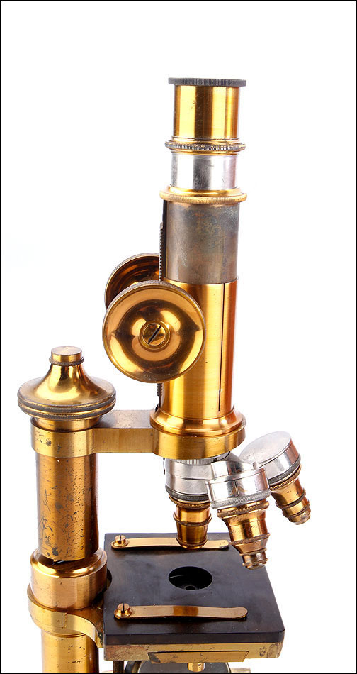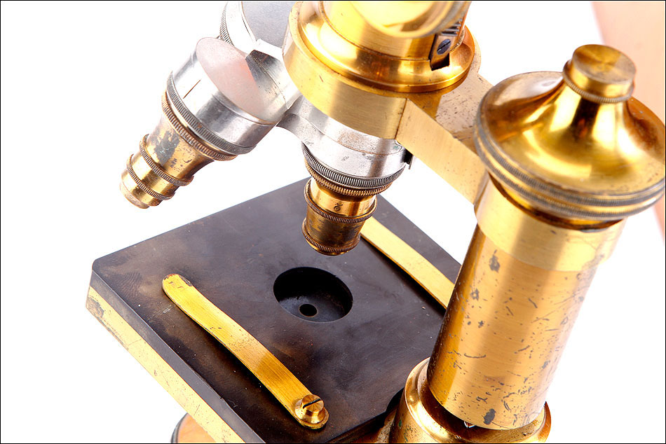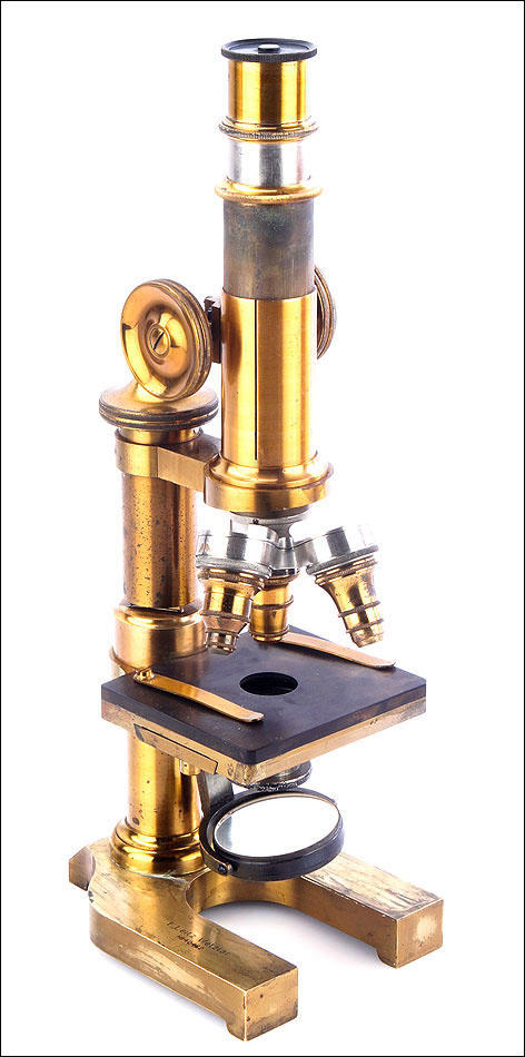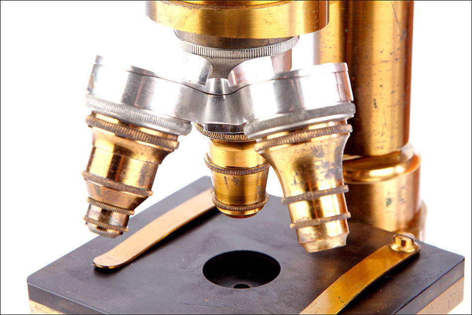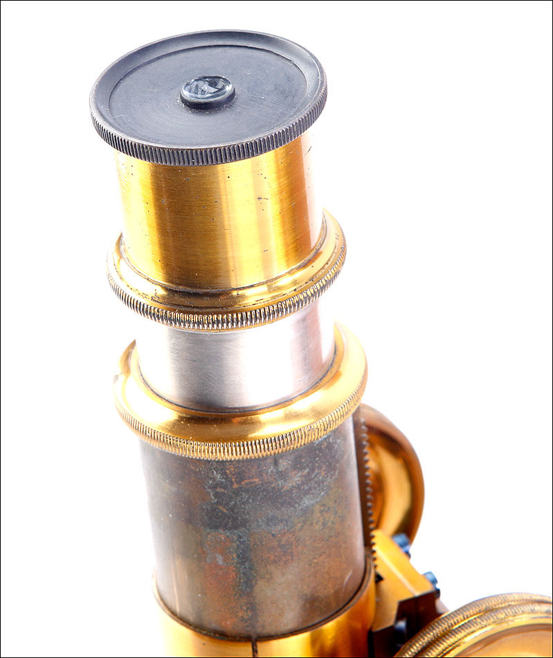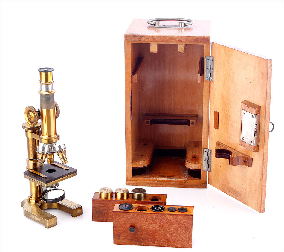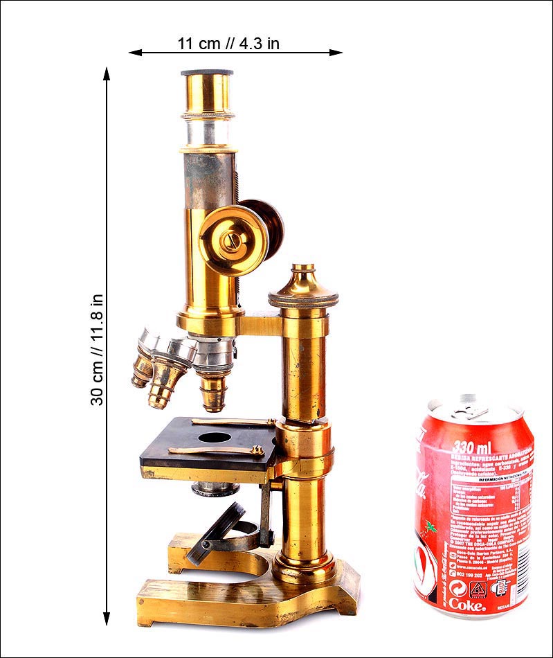 Magnífico microscopio antiguo E. Leitz Wetzlar de atractivo diseño y en buen estado de conservación. El microscopio lleva revólver de tres lentes y funciona bien, y todavía se puede emplear para visualizar muestras y preparados. Está fechado en 1889 y procede de Alemania. Se guarda en su estuche original de caoba, con cerradura y llave en funcionamiento. Este fantástico instrumento científico se presenta con el espejo doble original (en excelente estado), tres oculares y tres lentes; las lentes van acompañadas de sus respectivas fundas de latón. El microscopio está fabricado en latón dorado y metal plateado; el latón conserva el lacado transparente original de época en buenas condiciones.