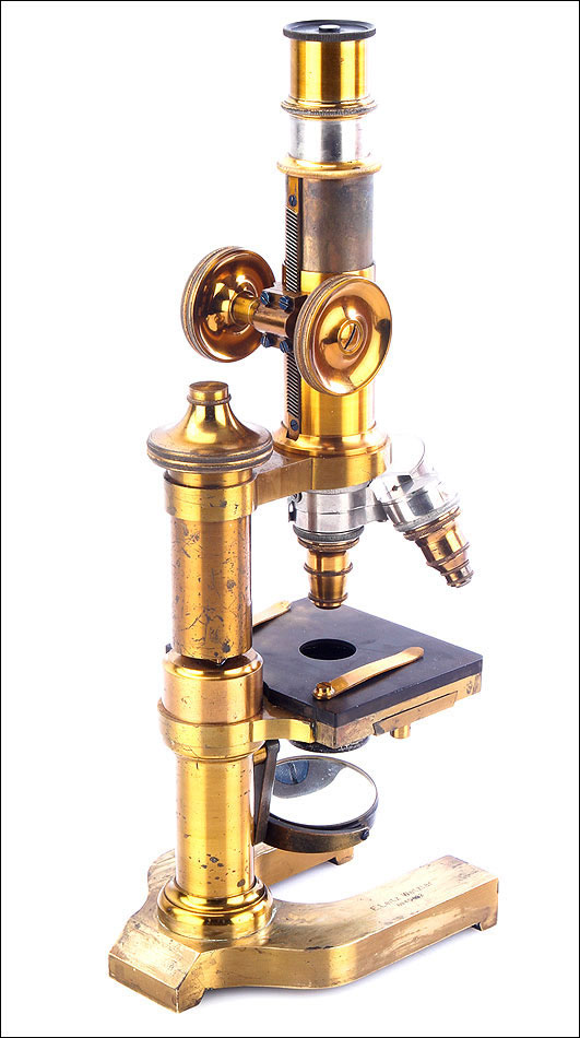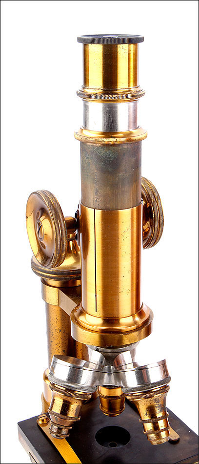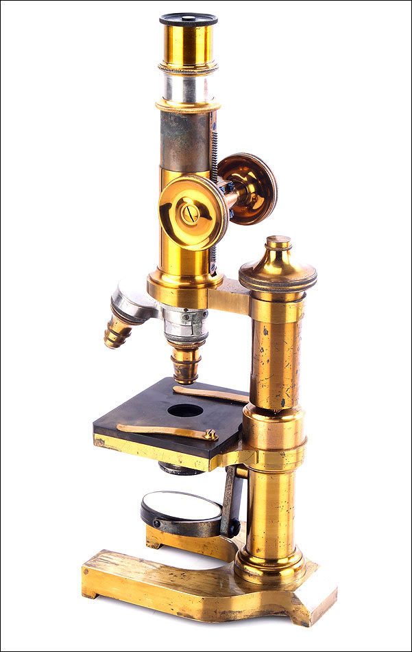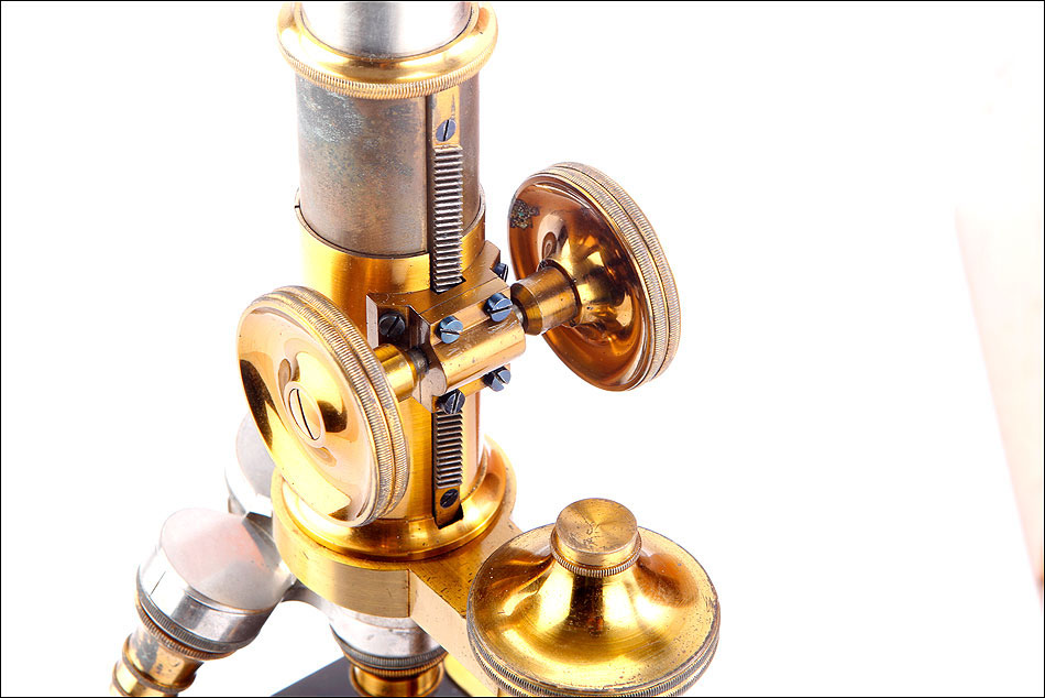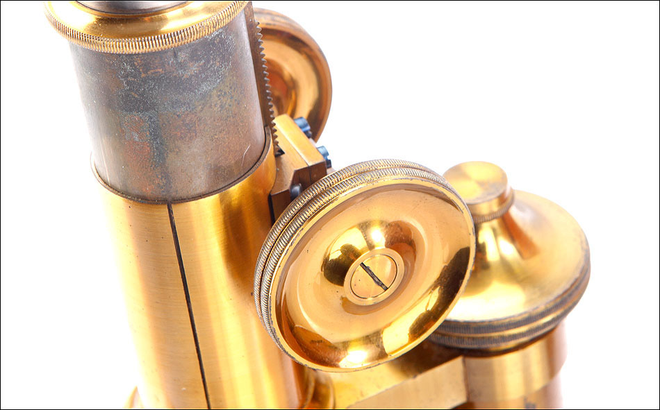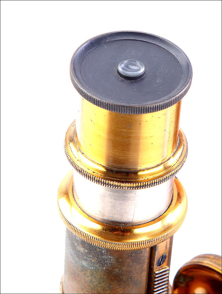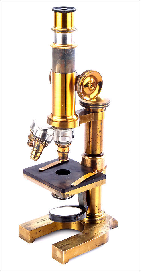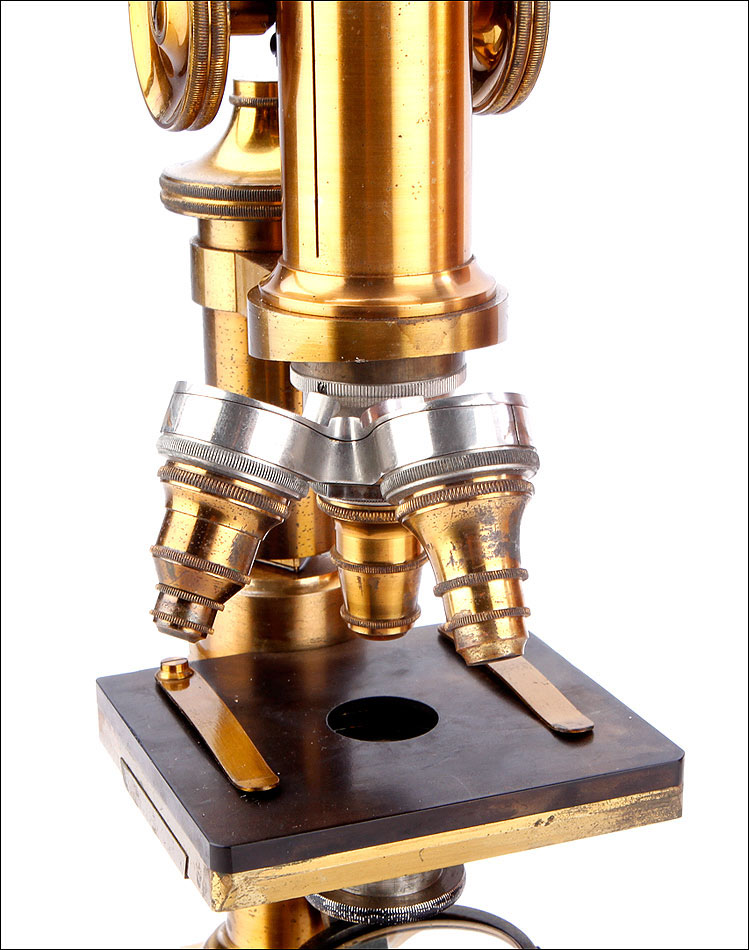 Magnífico microscopio antiguo E. Leitz Wetzlar de atractivo diseño y en buen estado de conservación. El microscopio lleva revólver de tres lentes y funciona bien, y todavía se puede emplear para visualizar muestras y preparados. Está fechado en 1889 y procede de Alemania. Se guarda en su estuche original de caoba, con cerradura y llave en funcionamiento. Este fantástico instrumento científico se presenta con el espejo doble original (en excelente estado), tres oculares y tres lentes; las lentes van acompañadas de sus respectivas fundas de latón. El microscopio está fabricado en latón dorado y metal plateado; el latón conserva el lacado transparente original de época en buenas condiciones.