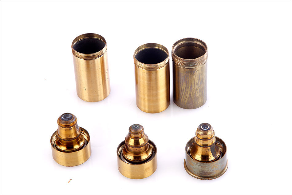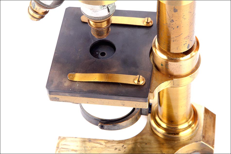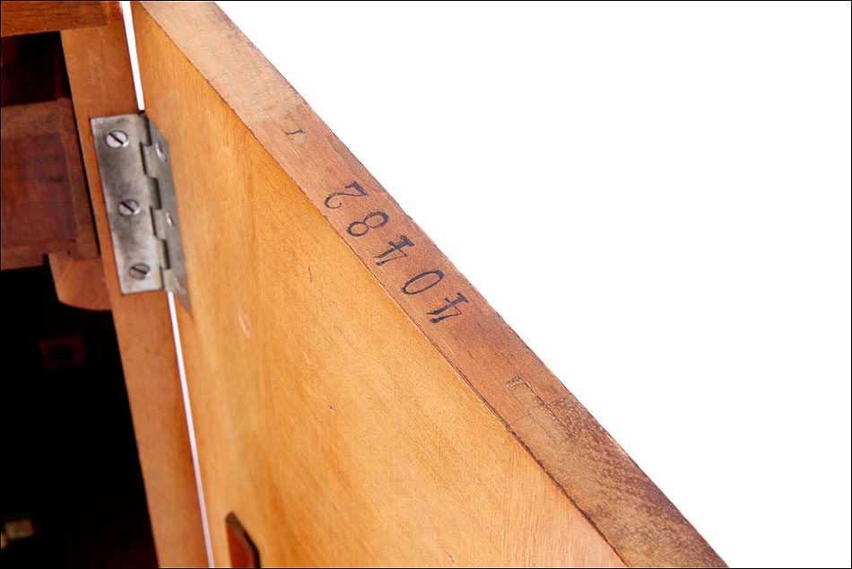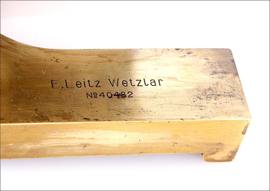 Todas las piezas y componentes del equipo son originales de época y se mueven con fluidez. En la base de herradura podemos ver grabado el nombre del fabricante, E. Leitz Wetzlar, y el número de serie Nº 40482. Este número aparece también grabado en el canto de la puerta del estuche, lo que indica que este fue fabricado expresamente para guardar el microscopio. El estuche es de madera de caoba maciza, está en magníficas condiciones y conserva el barnizado original. En su interior hay dos soportes de madera extraíbles diseñados para guardar las lentes y los oculares.