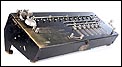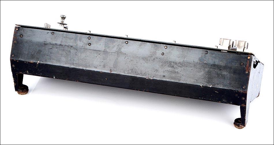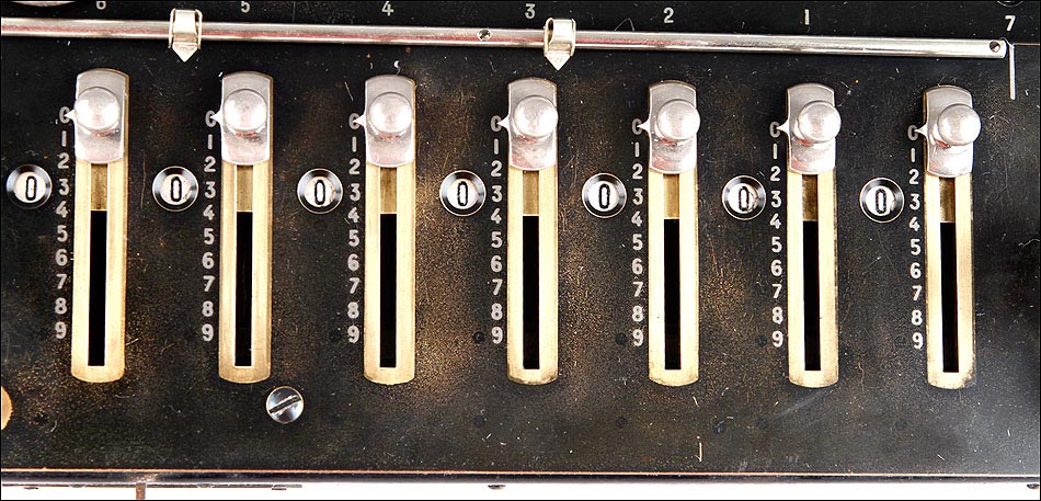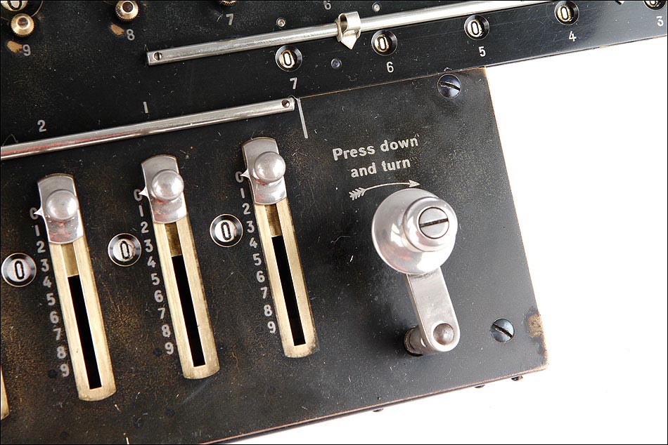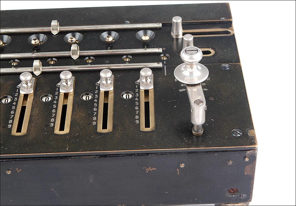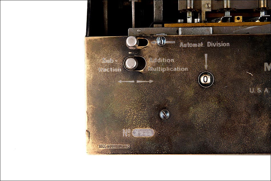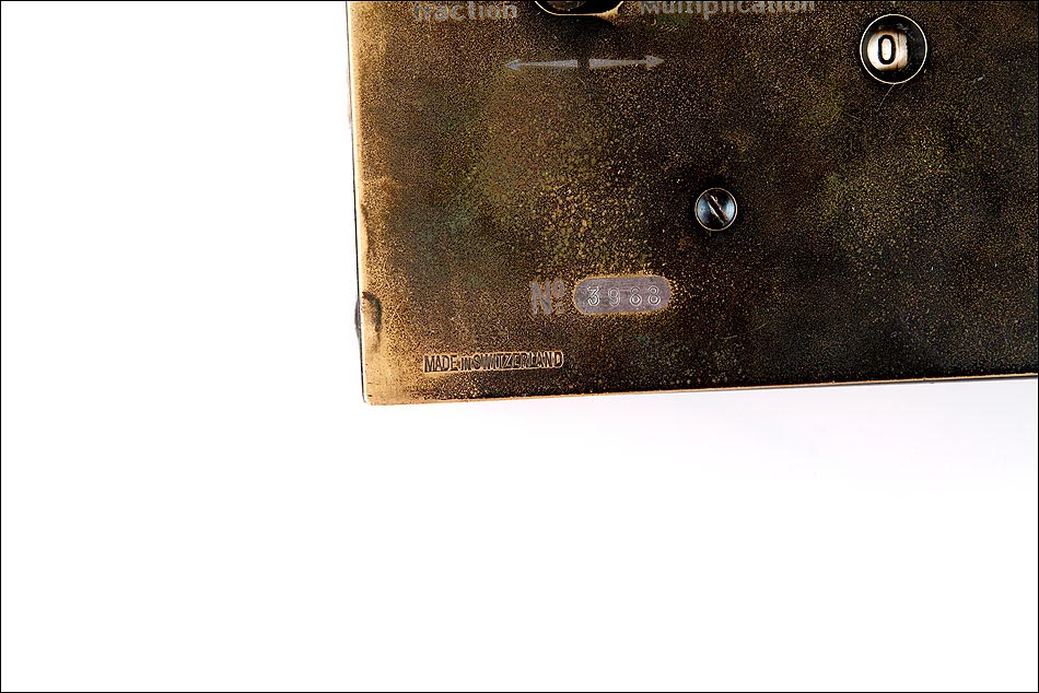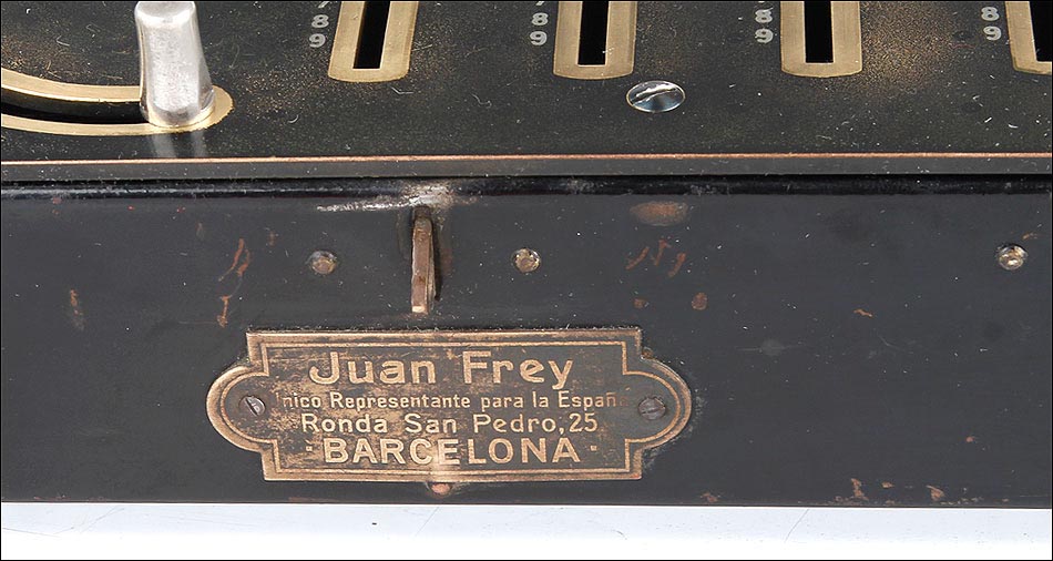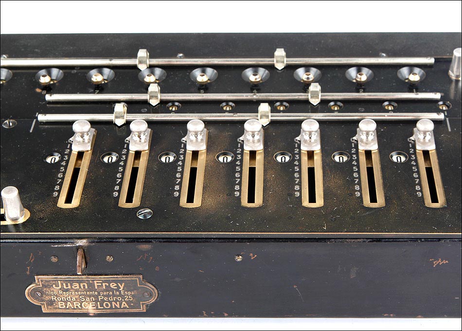 Como digo, esta preciosa máquina se encuentra bien conservada y en perfecto estado de funcionamiento. Conserva la gran mayoría del pavonado negro que originalmente recubría su parte frontal, estando más desgastado en la parte izquierda donde tradicionalmente se apoyaba la mano, y estando prácticamente impecable en el resto de la máquina. En la esquina inferior izquierda de la cara frontal podemos ver el número de serie la calculadora: 3988, junto con varias inscripciones relativas al lugar de fabricación y a la empresa fabricante. La calculadora conserva su tapa original de hierro lacado en negro, en cuyo centro aún queda buena parte de la etiqueta roja y blanca con el logotipo de la marca.