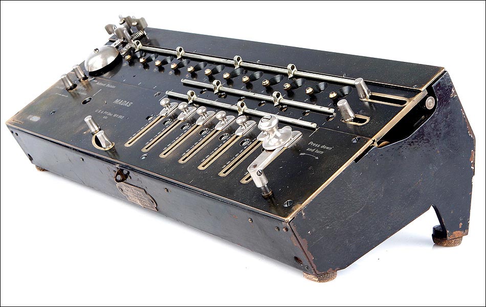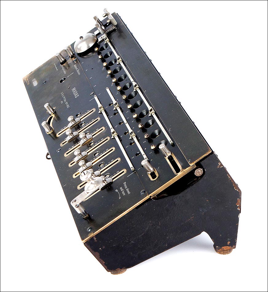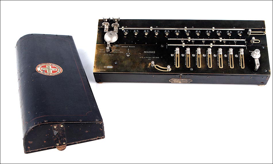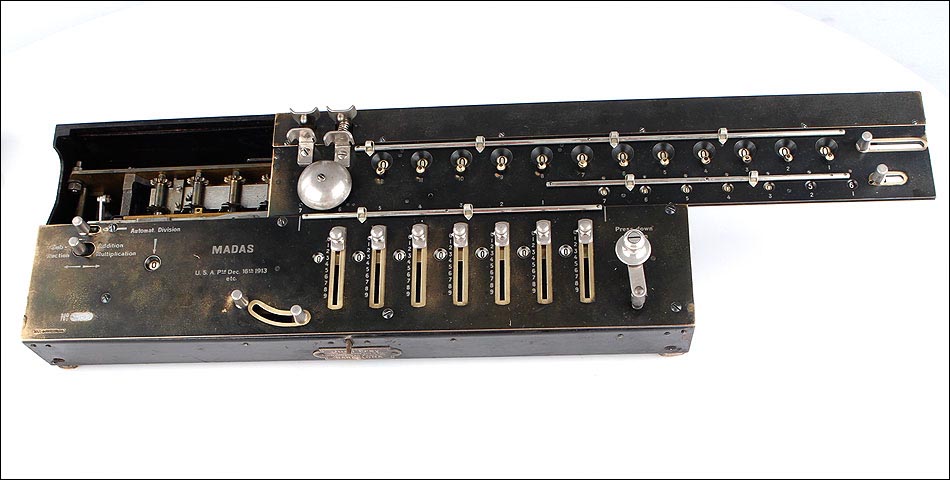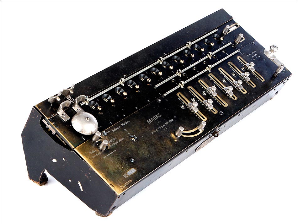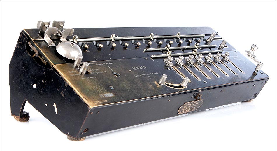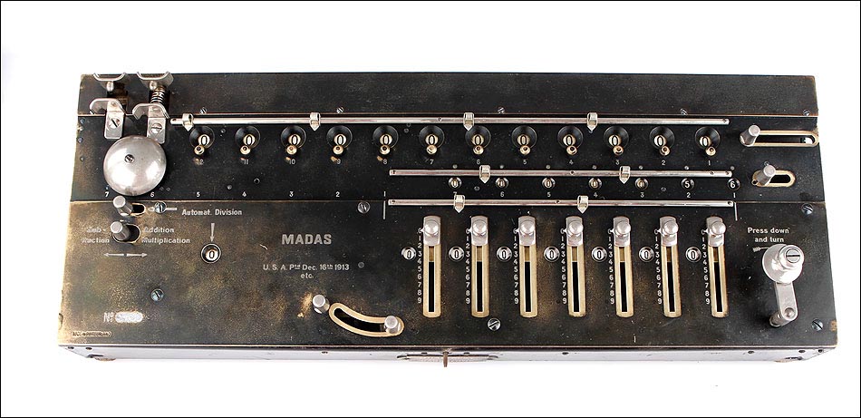 Excepcional calculadora MADAS antigua, fabricada en Suiza en el año 1913. Se trata de una máquina histórica, todo un icono en la historia de los aritmómetros del siglo XX. El nombre MADAS corresponde a las iniciales de las funciones que esta calculadora puede realizar: en alemán, Multiplicier, Automat Dividieren, Addieren, Subtrahieren; En inglés, Multiplication, Automatic Division, Addition, Substraction. MADAS. La función de división automática fue el mayor avance que incluyeron estos modelos, algo totalmente novedoso para la época. Gracias a esta función el usuario puede realizar las divisiones de forma automática, simplemente girando la manivela hasta escuchar el timbre que indica el resultado.