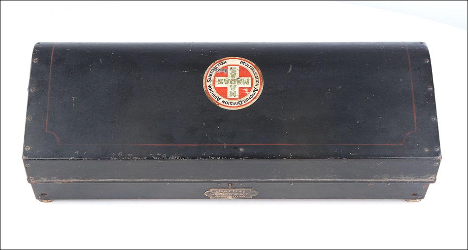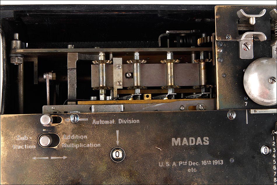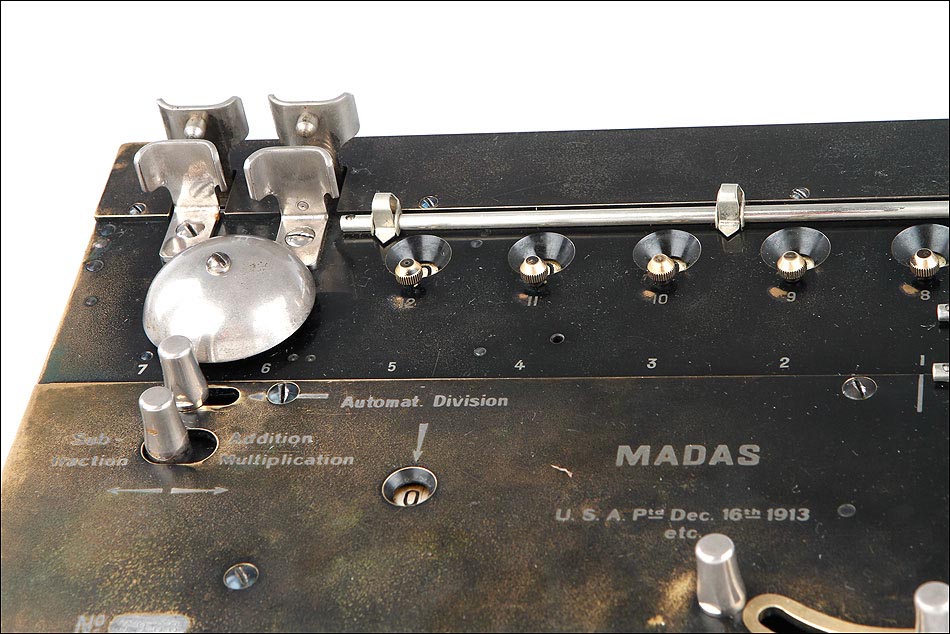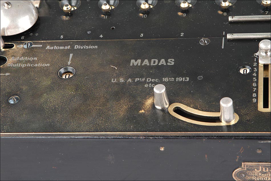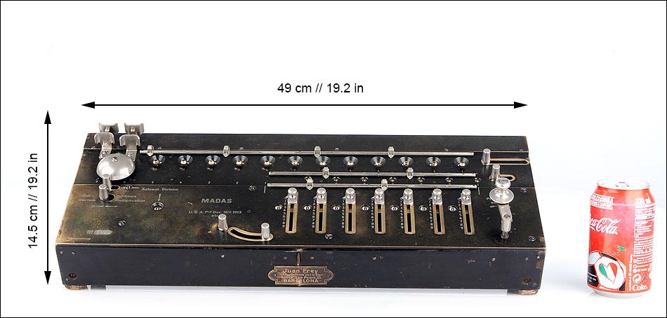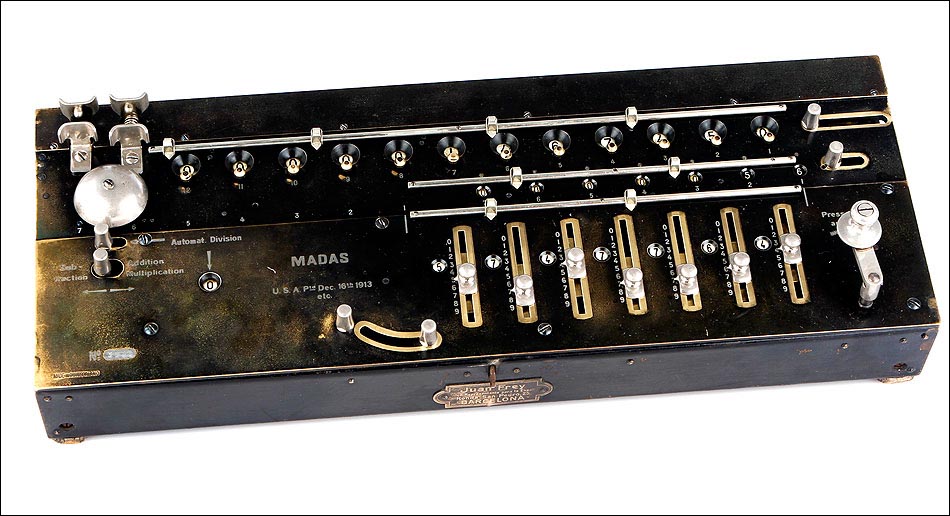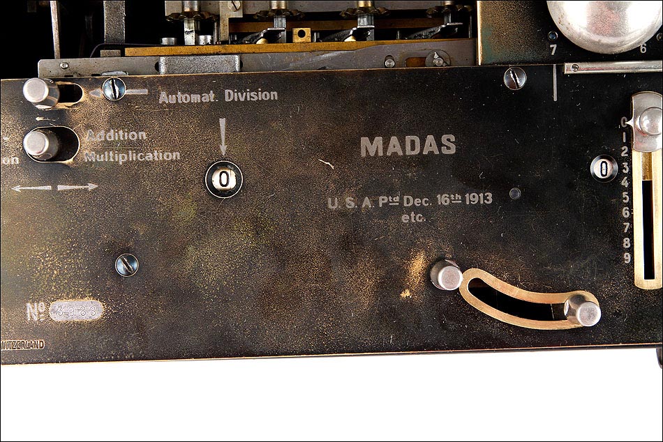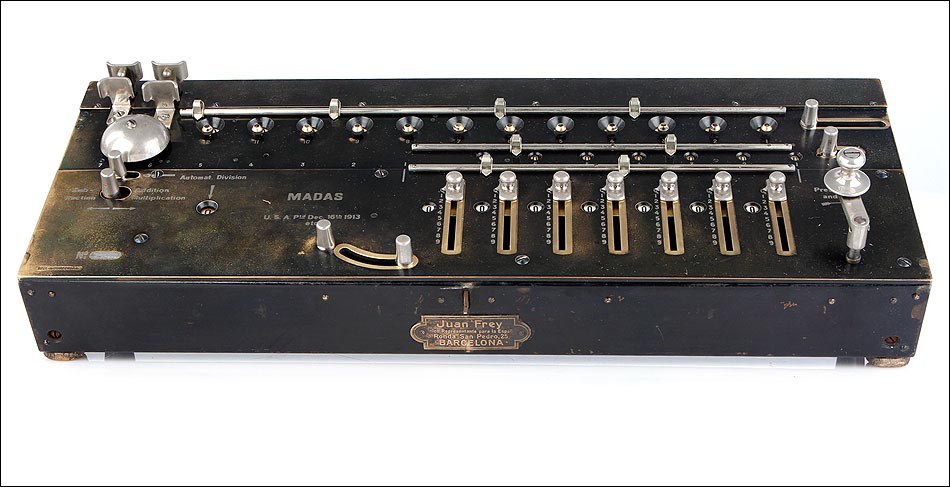 La firma que fabricó estas calculadoras fue fundada en Zúrich en 1891, por Hans Walter Egli. Las calculadoras MADAS derivan directamente del aritmómetro de Colmar, y el primer modelo apareció en el año 1908 con la gran innovación antes señalada. Más adelante, la firma también consiguió incluir una función de multiplicación automática, algo bastante más complicado de lograr. Las máquinas de calcular MADAS eran fiables y sólidas. En este caso en concreto, la calculadora presenta un placa en el frontal con nombre del distribuidor de la firma en España, Juan Frey, situado en la Ronda San Pedro, 25 de Barcelona. Literalmente, esta calculadora mecánica supera a la mayoría de las calculadoras electrónicas, siendo capaz de operar con cantidades con más dígitos que la mayoría de las calculadoras electrónicas, incluida la que tiene usted en su Smartphone, al manos en la versión normal, no científica.