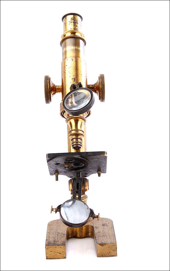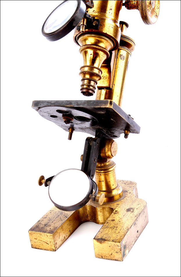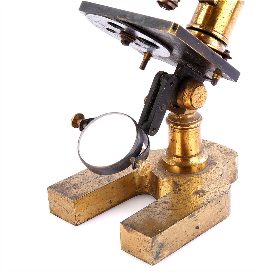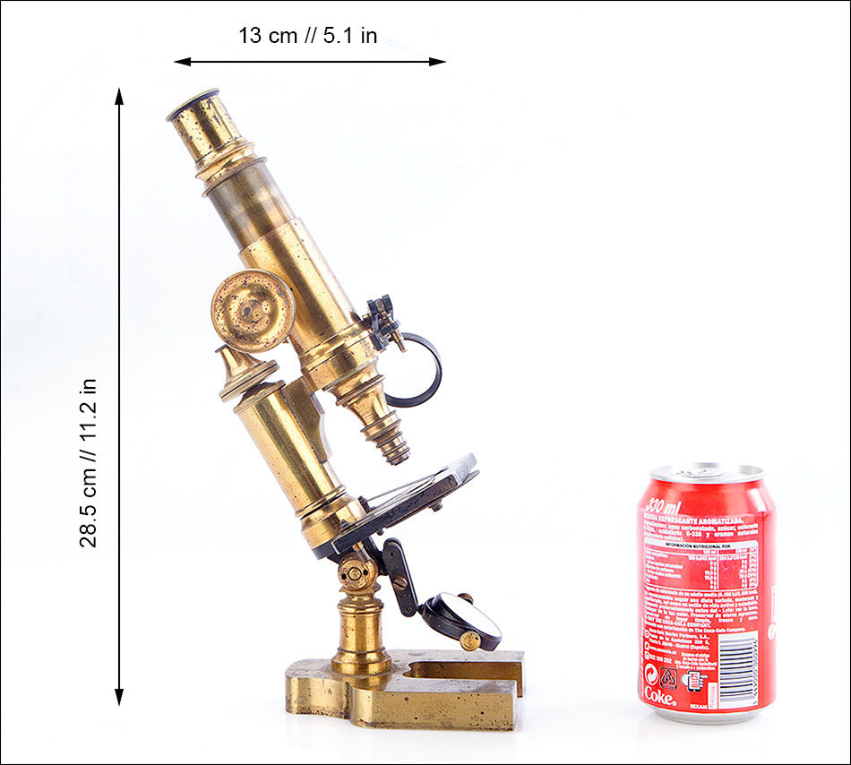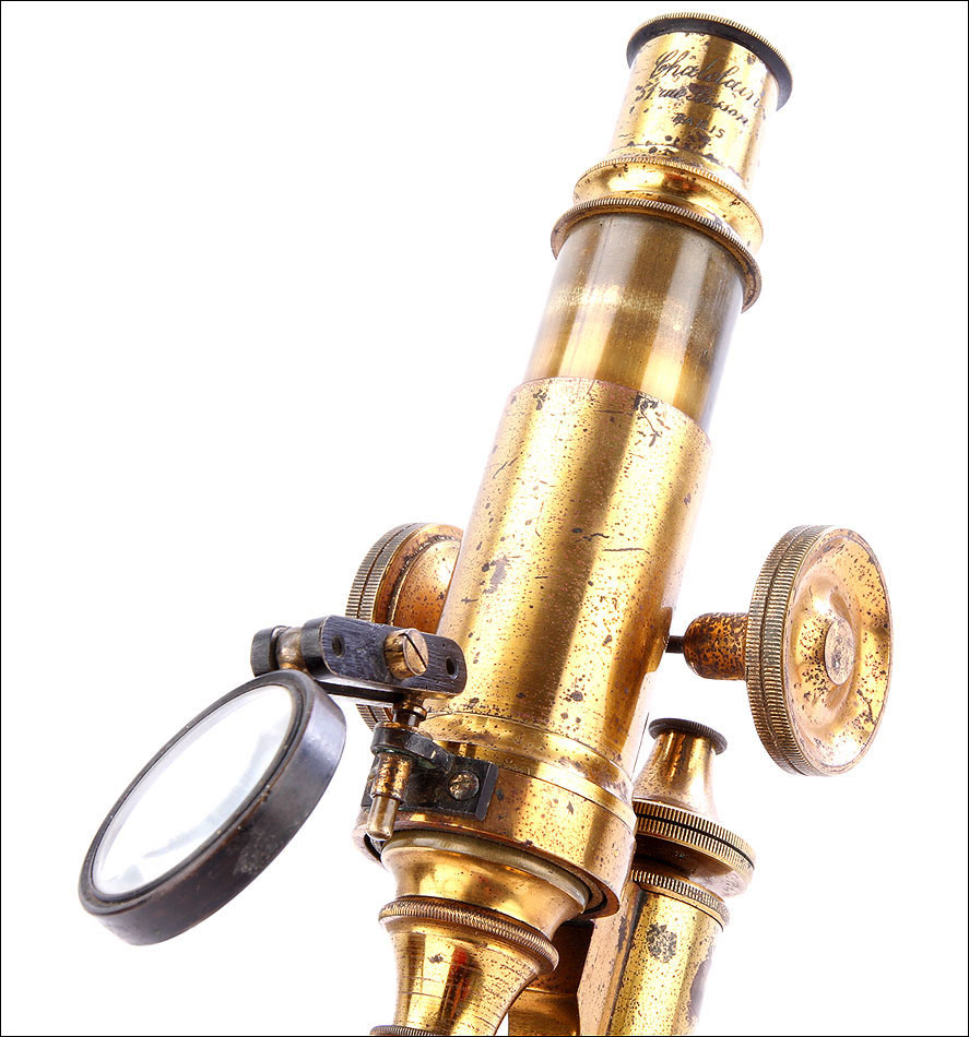 En el tubo del microscopio podemos ver una fina inscripción grabada a mano con el nombre y la dirección del fabricante: Chatelain – 51 rue Bisson – PARIS. La pletina para muestras es de hierro lacado en negro y conserva las pinzas que sujetan las placas de los preparados para su visualización. Bajo ella se encuentra el espejo oscilante doble, original de época y en buen estado. Las piezas móviles se deslizan con suavidad, lo que hace que este microscopio sea agradable de usar y funcional.