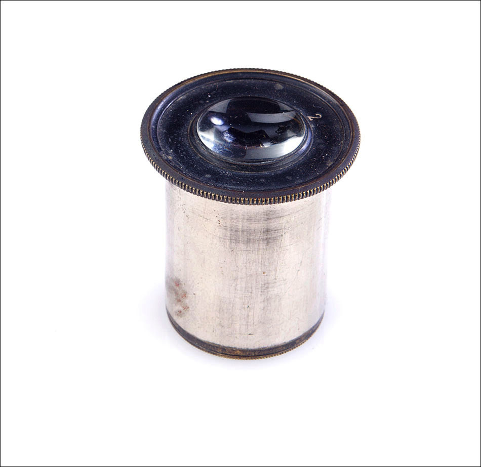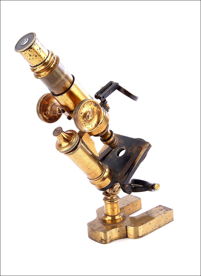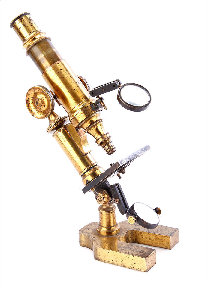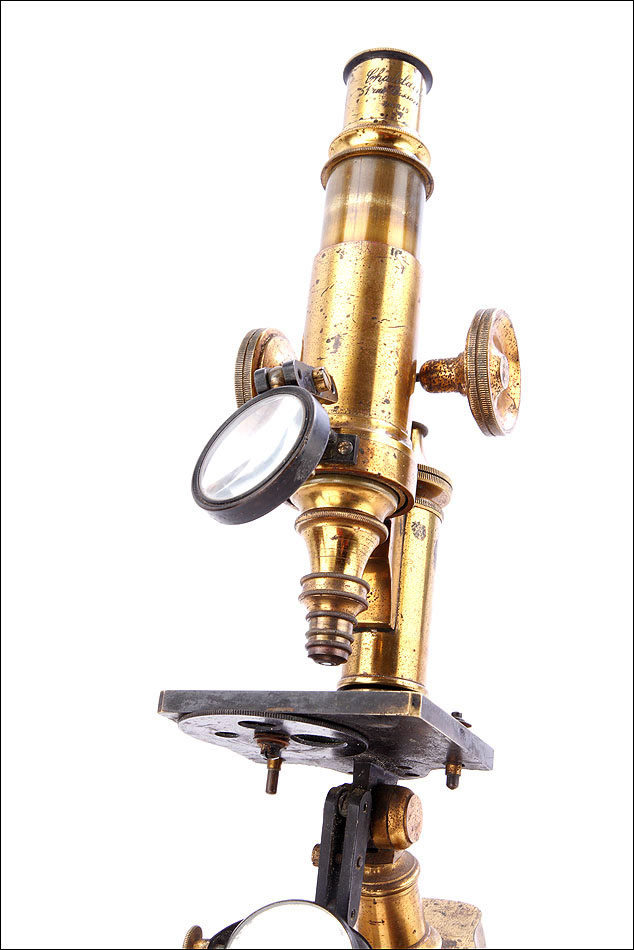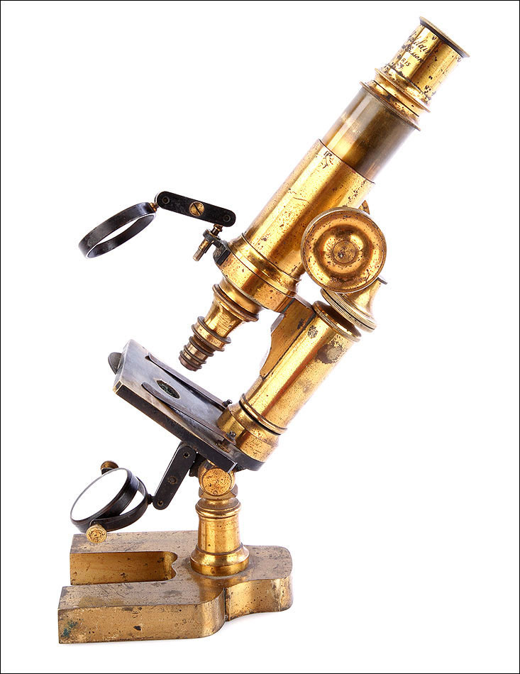 En el tubo del microscopio podemos ver una fina inscripción grabada a mano con el nombre y la dirección del fabricante: Chatelain – 51 rue Bisson – PARIS. La pletina para muestras es de hierro lacado en negro y conserva las pinzas que sujetan las placas de los preparados para su visualización. Bajo ella se encuentra el espejo oscilante doble, original de época y en buen estado. Las piezas móviles se deslizan con suavidad, lo que hace que este microscopio sea agradable de usar y funcional.