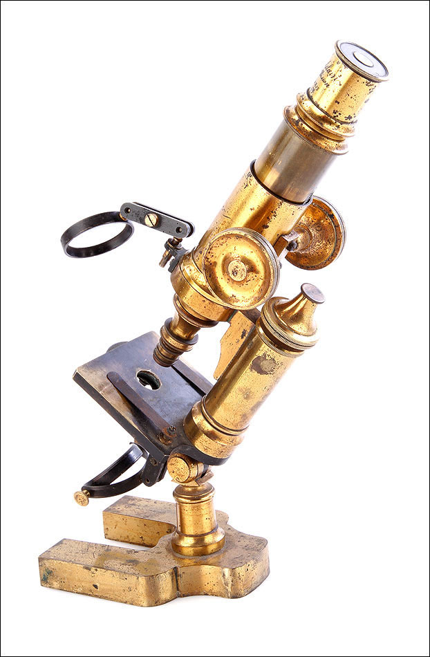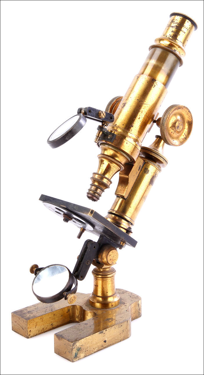 Bello microscopio antiguo de latón dorado, firmado por Chatelain y en buen estado de conservación y funcionamiento. El microscopio fue fabricado en París a finales del siglo XIX (circa 1880) y conserva todas sus piezas originales de época. Lleva dos oculares, tres lentes y una lupa de concentración de luz, y se presenta en su estuche original de madera de caoba. El microscopio conserva el lacado transparente original y muestra la delicada pátina característica de los aparatos de latón dorado de principios de siglo.