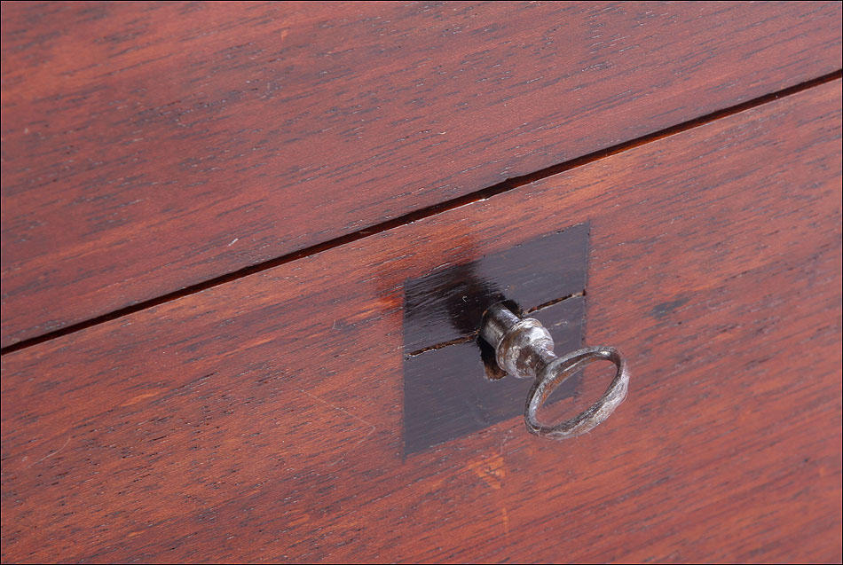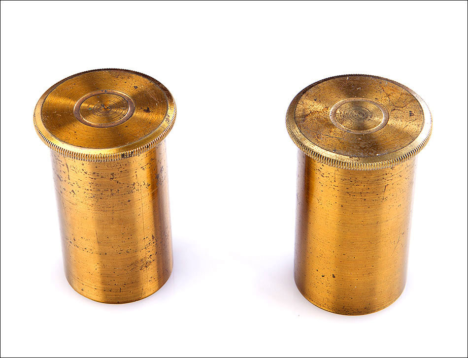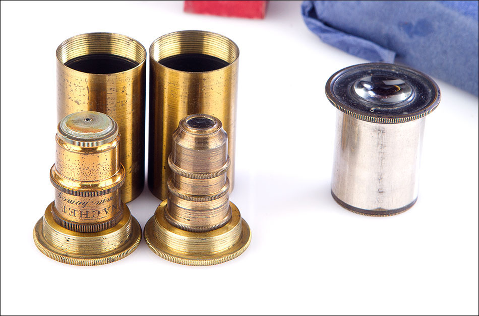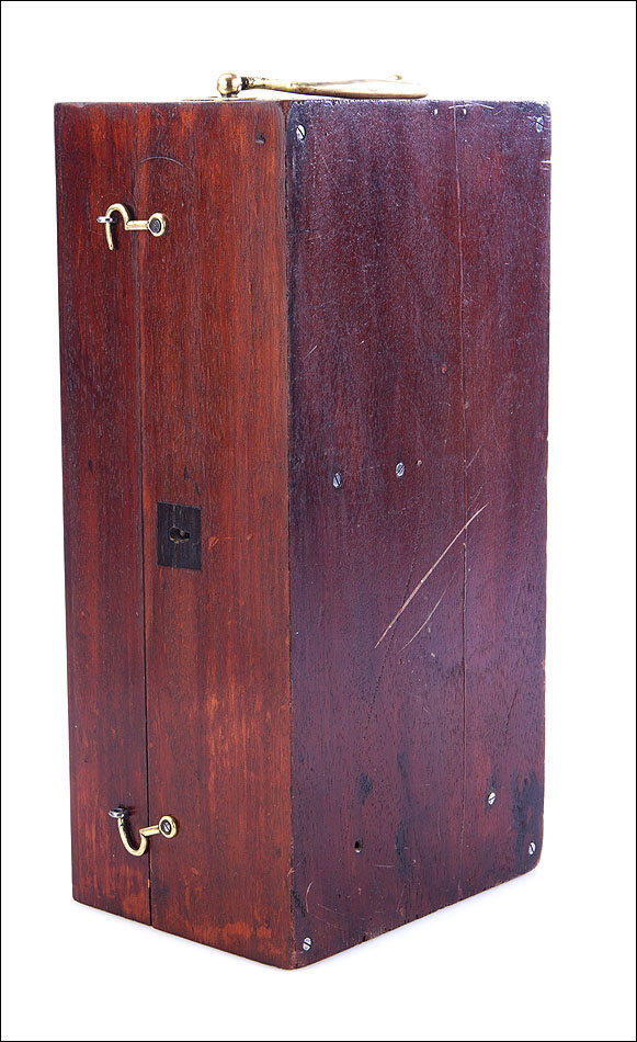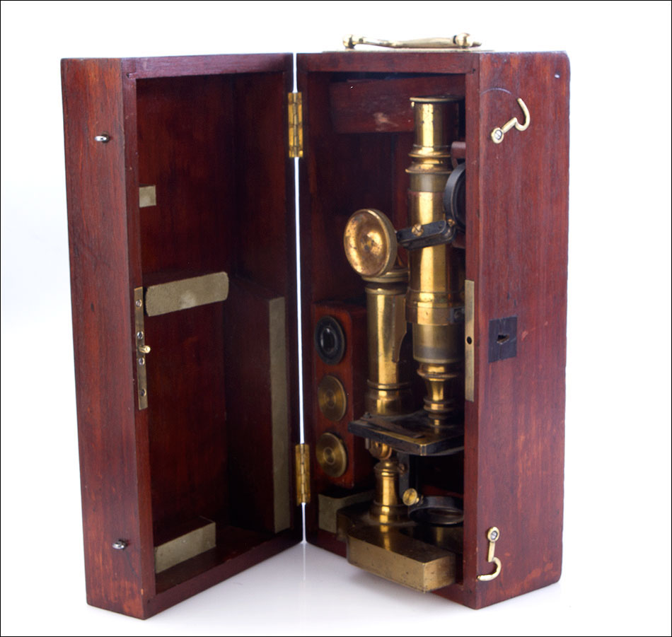 El estuche de madera de caoba donde se guarda el microscopio es una pieza magnífica de por sí. La madera maciza, de intenso color granate oscuro, está en excelentes condiciones. Conserva las bisagras de latón, los ganchos de cierre y la cerradura originales de época. La cerradura cuenta con la llave original y funciona perfectamente. El estuche lleva una serie de piezas de madera de caoba fijas, que sirven para poder encajar el microscopio y mantenerlo estable. El juego de accesorios que acompaña al aparato (las lentes con sus fundas, los oculares y un paquete de pletinas de cristal para muestras) también se pueden guardar cómodamente en su interior.