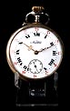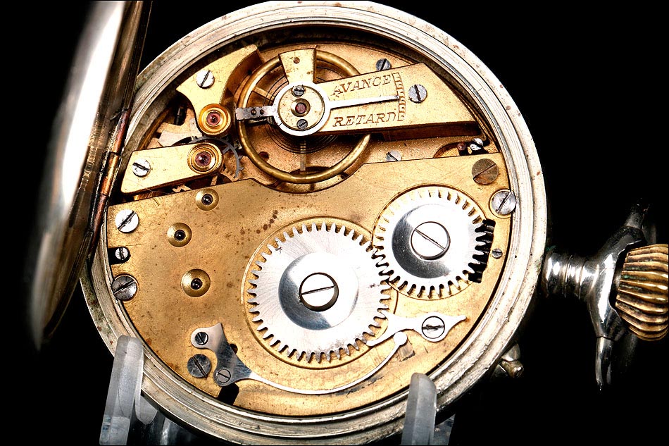 La esfera blanca va protegida por el cristal original de época, en buen estado de conservación. Como hemos comentado, lleva grandes números romanos de color negro rodeados por cifras arábigas en rojo, correspondientes a los minutos. Las manecillas son de metal cobrizo y muestran un fino diseño en filigrana, delicado y atractivo: bajo ellas encontramos el segundero. La tapa trasera es de metal plateado liso y está muy bien conservada, sin golpes ni arañazos de importancia.