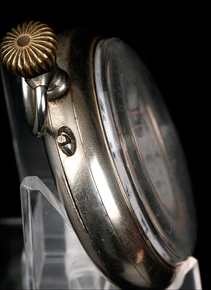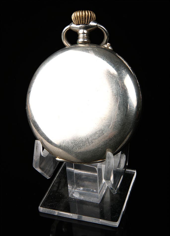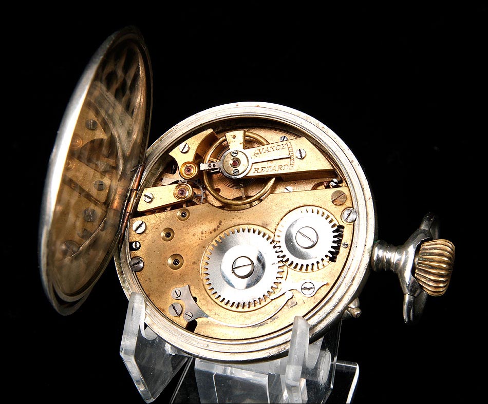 La corona del reloj es de metal dorado y hace un bello contraste con la caja plateada. Bajo la tapa trasera encontramos la delicada maquinaria: todas sus piezas son originales de época y funcionan a la perfección. En conjunto, el reloj destaca por su antigüedad, su buen estado y su excelente funcionamiento, siendo un artículo de calidad que llamará la atención por su atractivo diseño y su autenticidad.