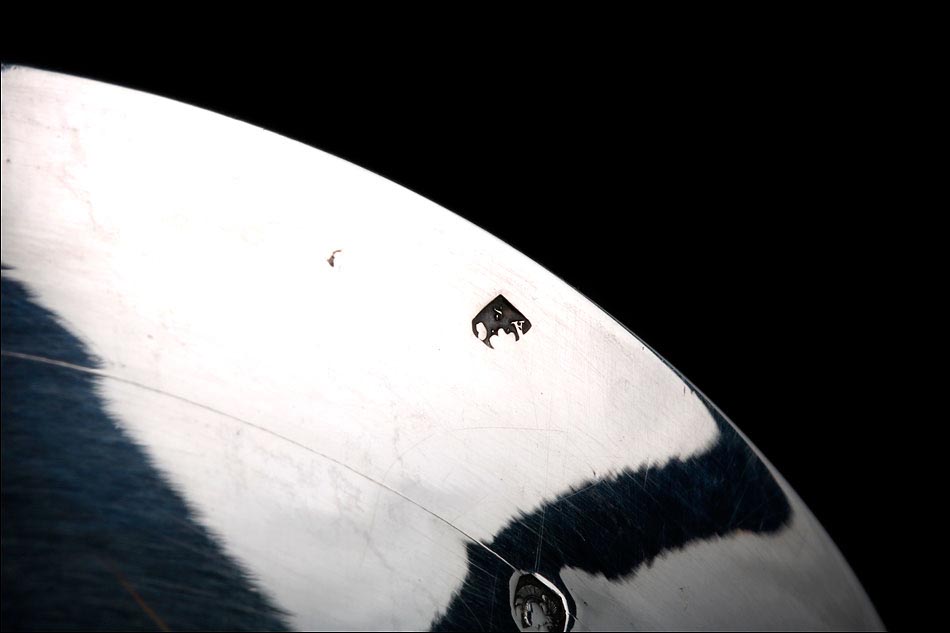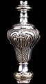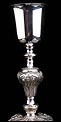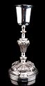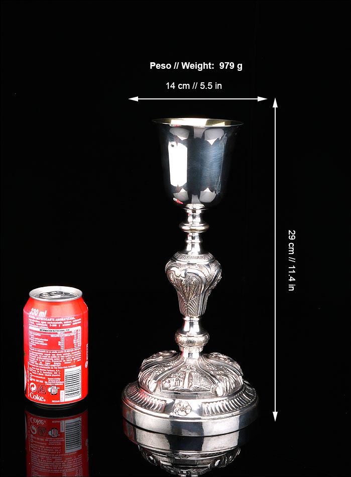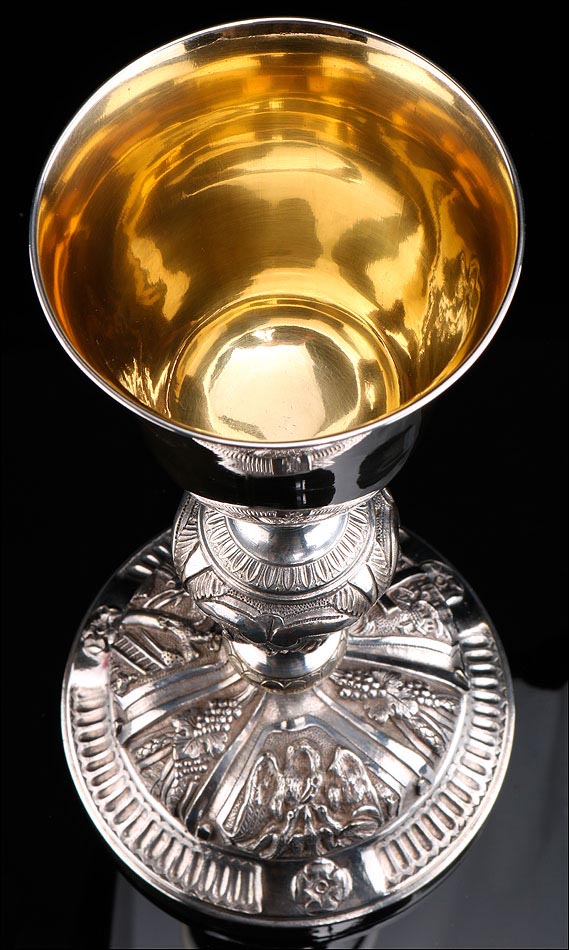 Estilizado cáliz antiguo de plata maciza y metal plateado, procedente de Francia y fabricado en el siglo XIX. La copa es de plata maciza y lleva el contraste del platero y el que identifica la plata francesa antigua (la cabeza de la diosa Minerva). El resto del cáliz es de metal plateado y llama la atención por su magnífica decoración, que contrasta intensamente con la estilizada copa de plata lisa. En conjunto, este cáliz es una pieza tan antigua como bella, con un diseño muy original lleno de simbología.