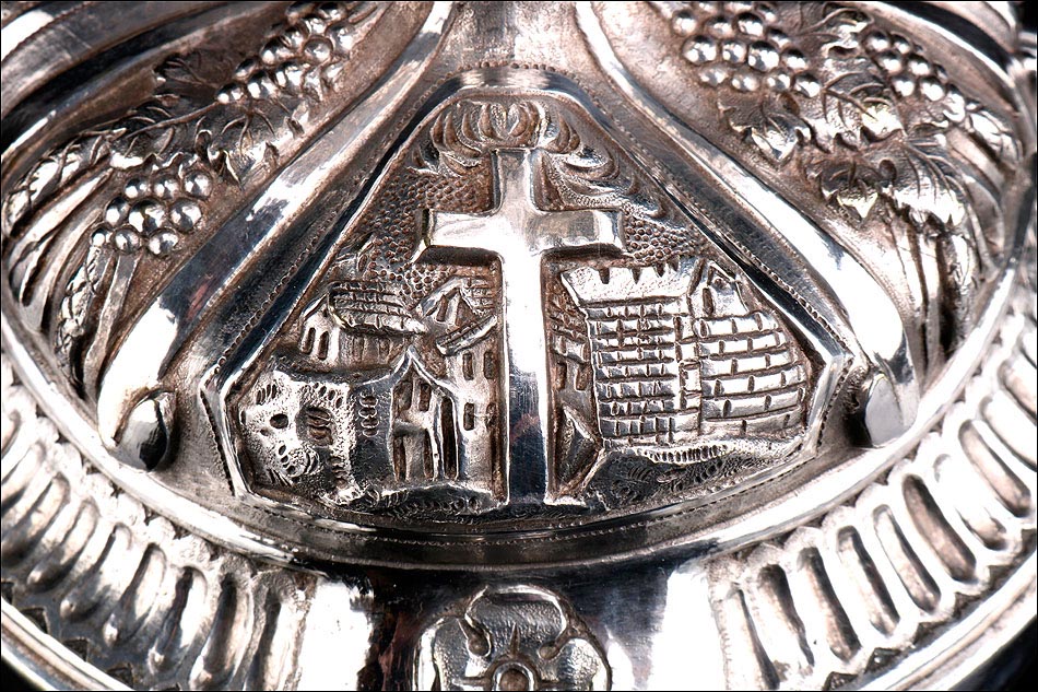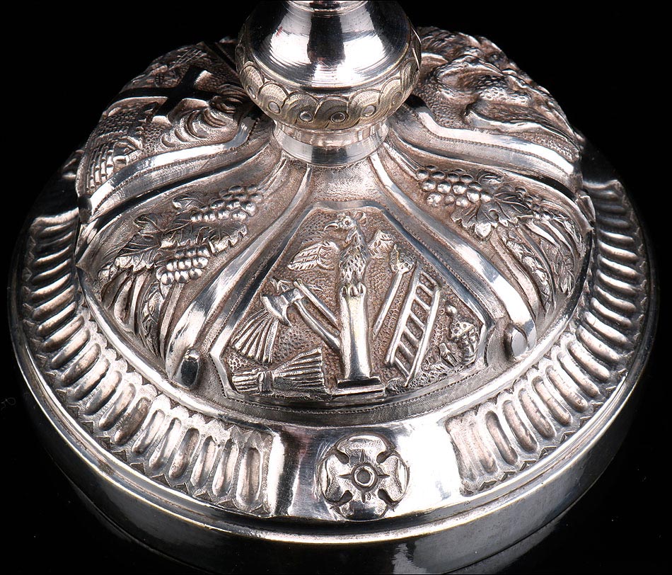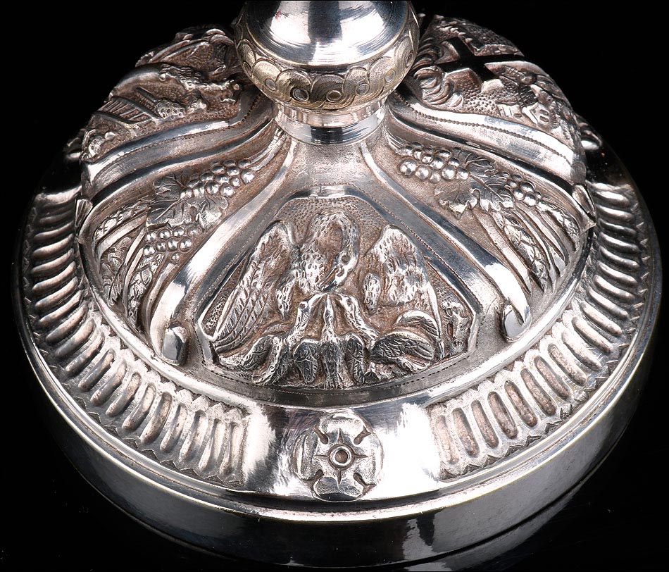 Es en la base del cáliz donde encontramos las imágenes relativas a la simbología cristiana. En una de ellas aparece un paisaje con la cruz en el centro, flanqueado por unas torres y las casas de un pueblo. La siguiente imagen muestra a un ave dando de comer a sus polluelos: se trata de un pelícano, el símbolo cristiano de la expiación y la redención. Según la mitología, el pelícano devuelve la vida a sus hijos muertos hiriéndose y rociándolos con su sangre, al igual que Cristo abre su costado para salvar a los hombres alimentándolos con la suya.
