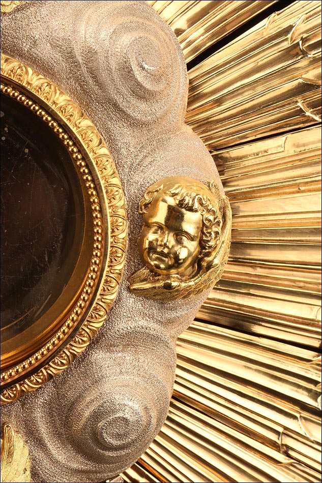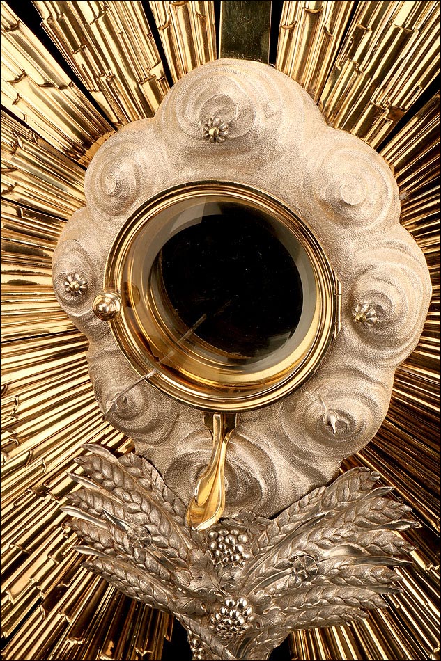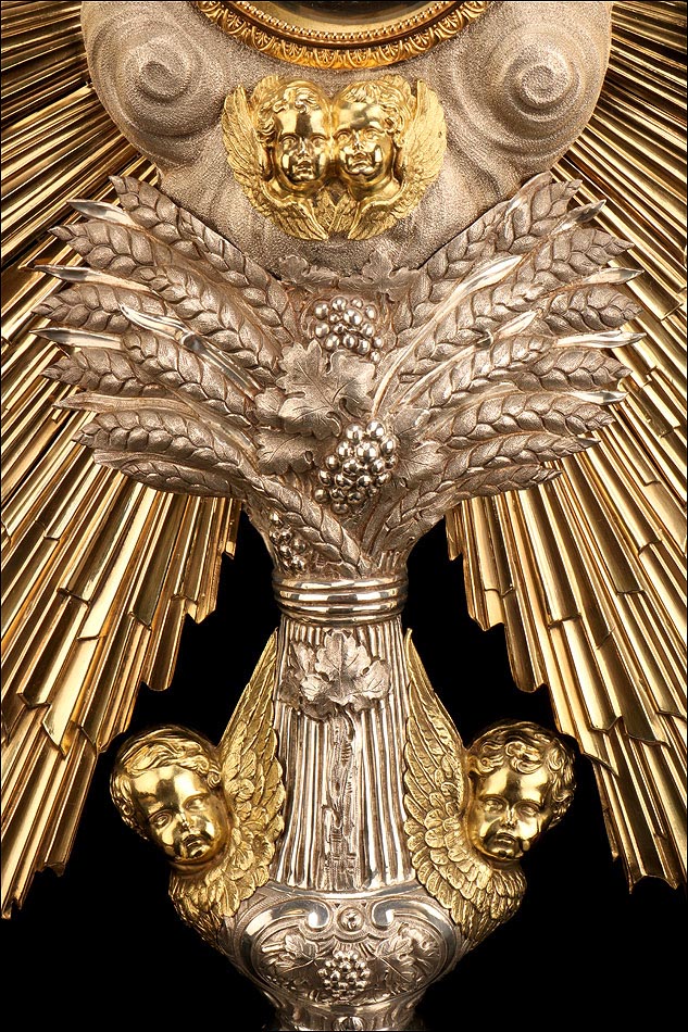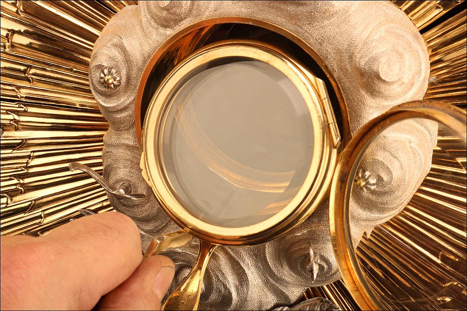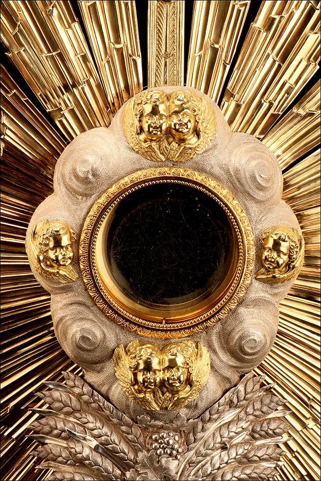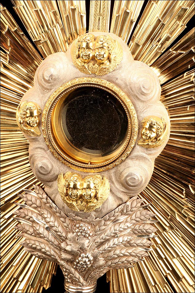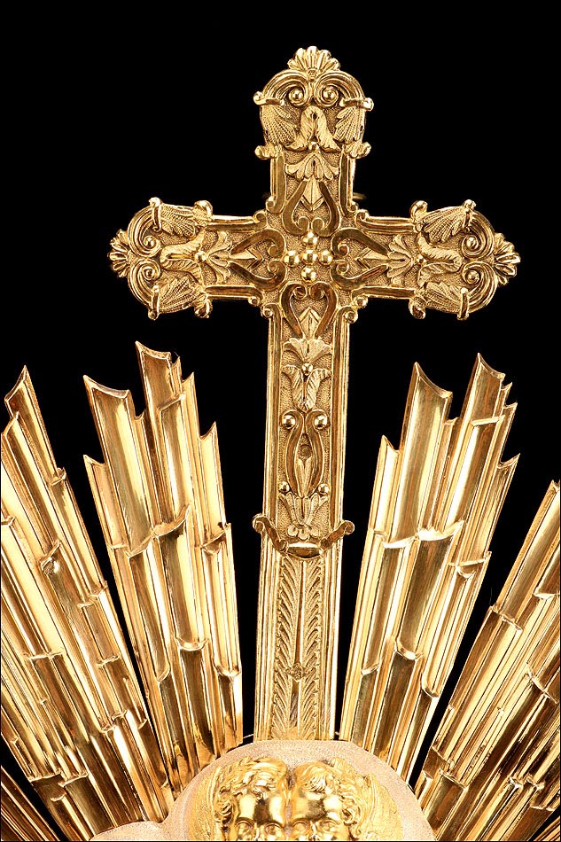 Se trata de la parte donde se inserta la luna o lúnula, el recipiente de plata dorada y cristal destinado a mantener en pie el Sagrado Sacramento cuando se encuentra dentro de la custodia. La luna está rodeada de una pieza de plata con forma de nube y decorada con pequeñas flores. De esta pieza parten un sinnúmero de rayos de plata dorada, que representan la gloria llameante del Cuerpo de Cristo. El conjunto está coronado por una preciosa cruz latina decorada con volutas y motivos vegetales. La custodia se puede guardar y trasladar en su estuche original, realizado en madera maciza pintada de negro y con forro interior de terciopelo rojo.