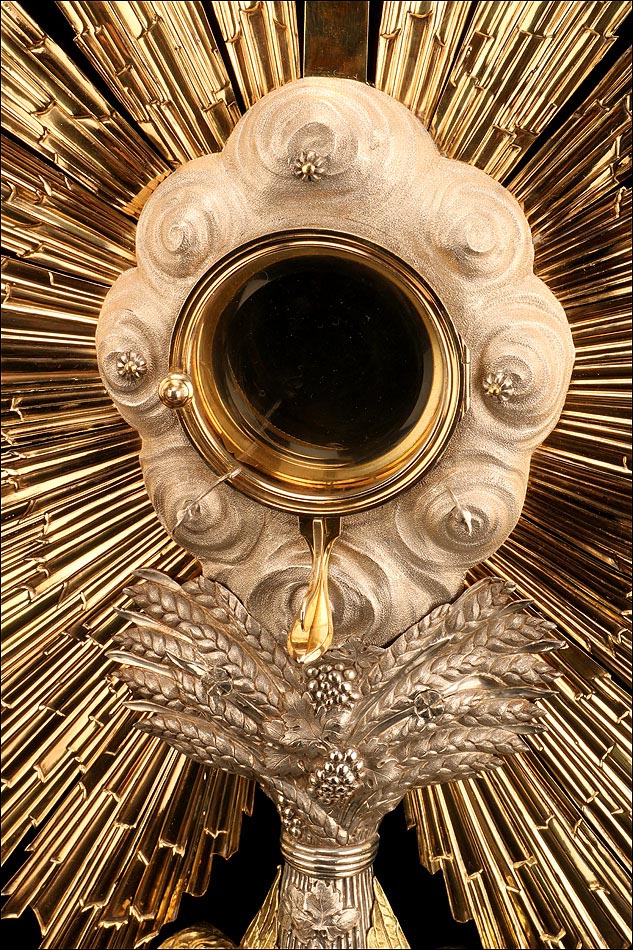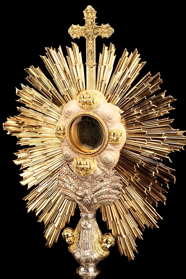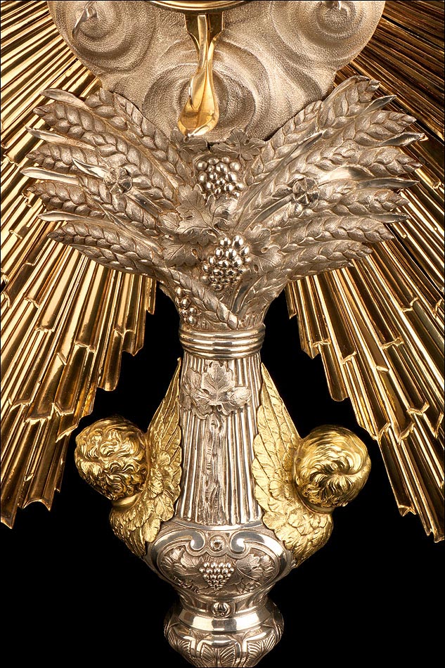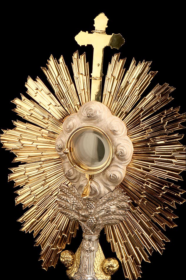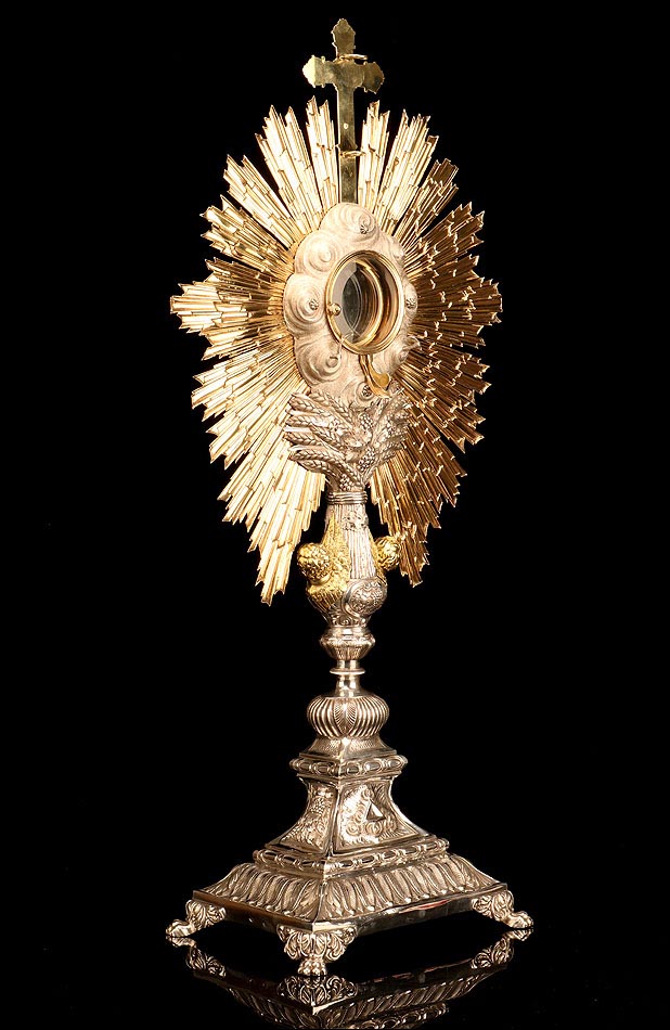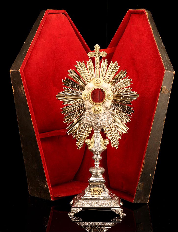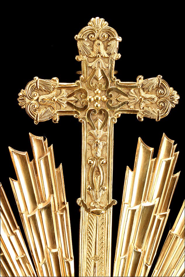 Se trata de la parte donde se inserta la luna o lúnula, el recipiente de plata dorada y cristal destinado a mantener en pie el Sagrado Sacramento cuando se encuentra dentro de la custodia. La luna está rodeada de una pieza de plata con forma de nube y decorada con pequeñas flores. De esta pieza parten un sinnúmero de rayos de plata dorada, que representan la gloria llameante del Cuerpo de Cristo. El conjunto está coronado por una preciosa cruz latina decorada con volutas y motivos vegetales. La custodia se puede guardar y trasladar en su estuche original, realizado en madera maciza pintada de negro y con forro interior de terciopelo rojo.