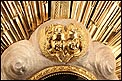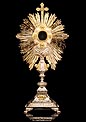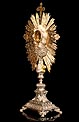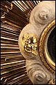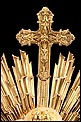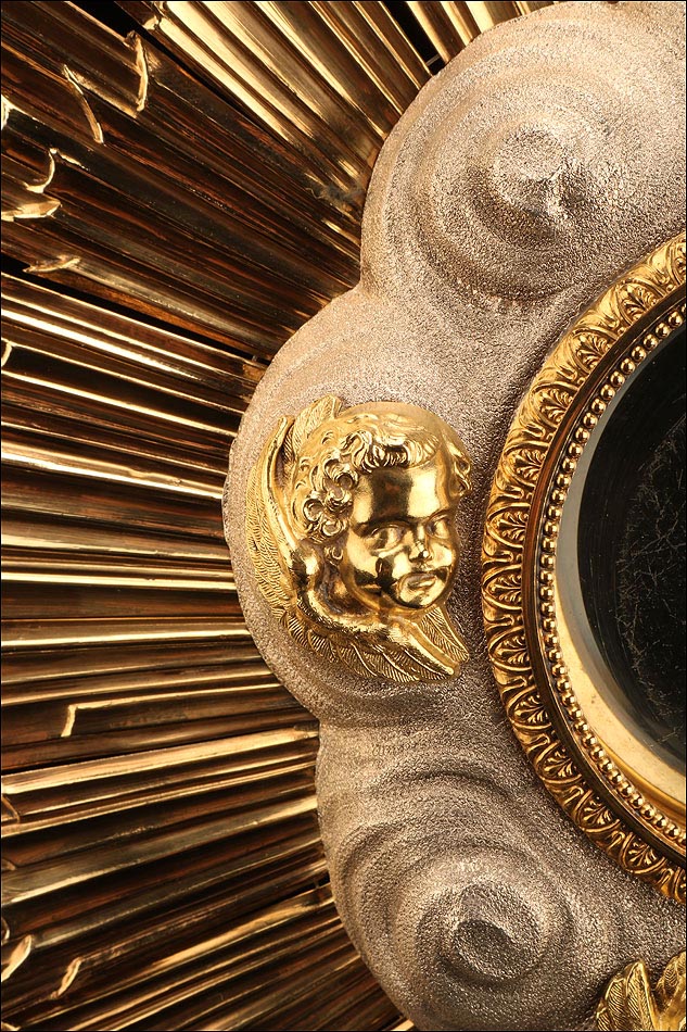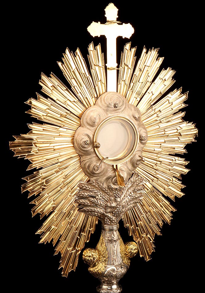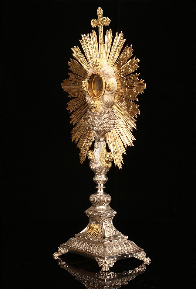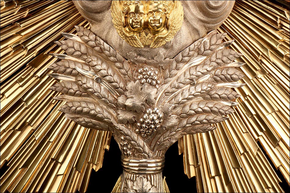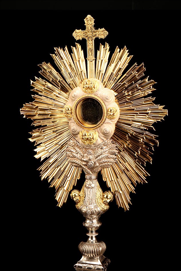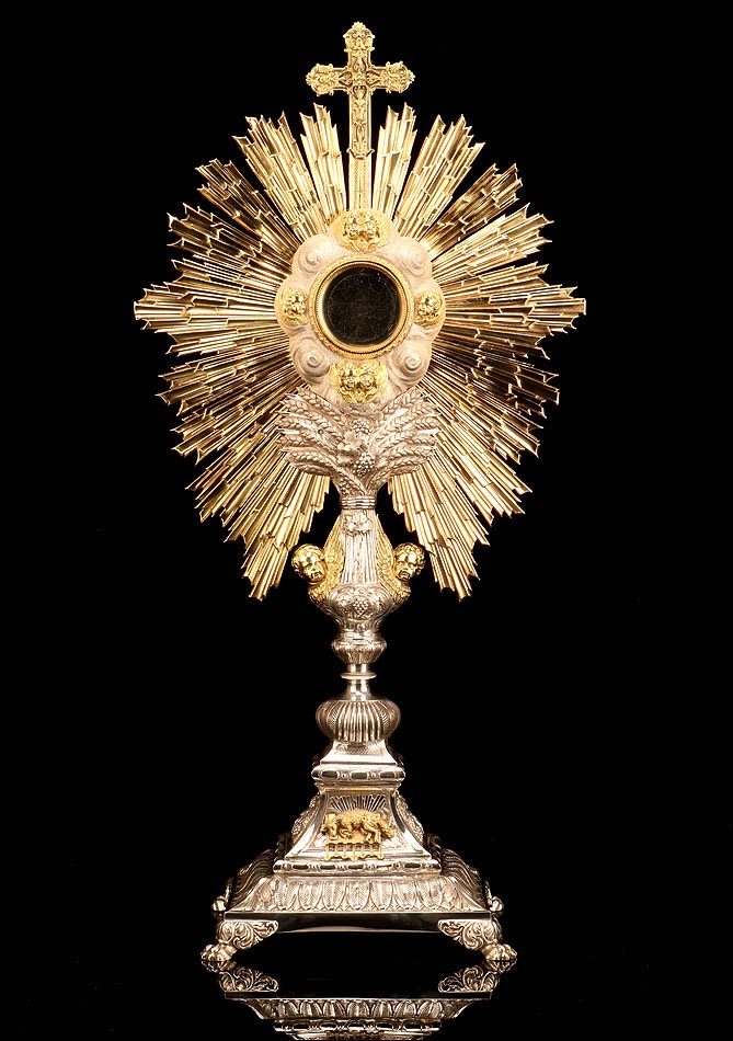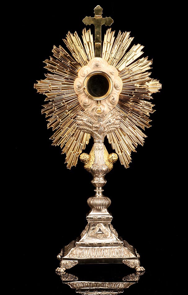 Se trata de la parte donde se inserta la luna o lúnula, el recipiente de plata dorada y cristal destinado a mantener en pie el Sagrado Sacramento cuando se encuentra dentro de la custodia. La luna está rodeada de una pieza de plata con forma de nube y decorada con pequeñas flores. De esta pieza parten un sinnúmero de rayos de plata dorada, que representan la gloria llameante del Cuerpo de Cristo. El conjunto está coronado por una preciosa cruz latina decorada con volutas y motivos vegetales. La custodia se puede guardar y trasladar en su estuche original, realizado en madera maciza pintada de negro y con forro interior de terciopelo rojo.