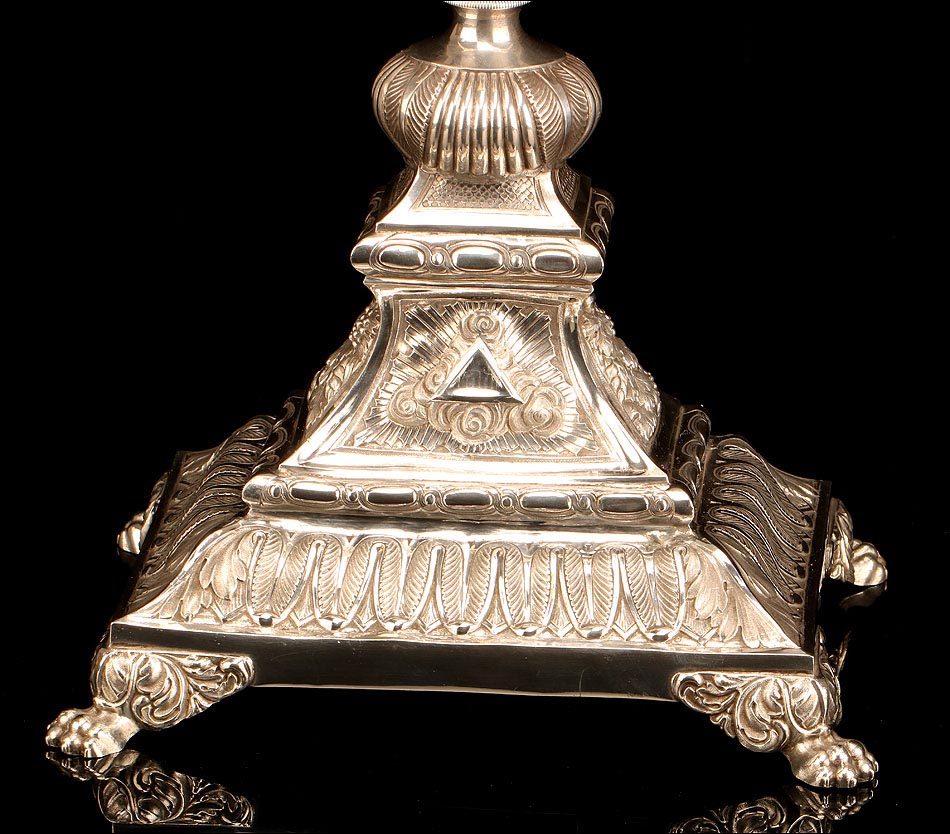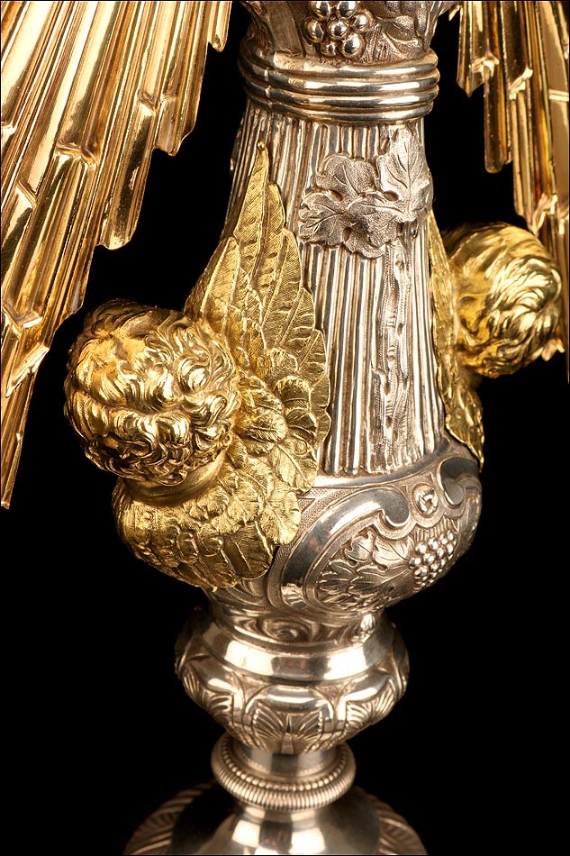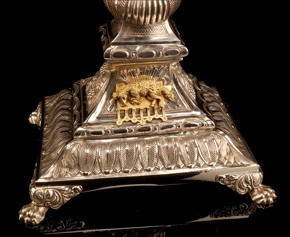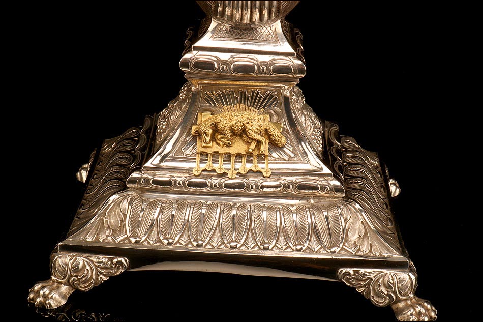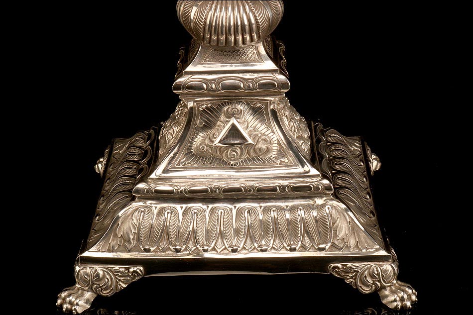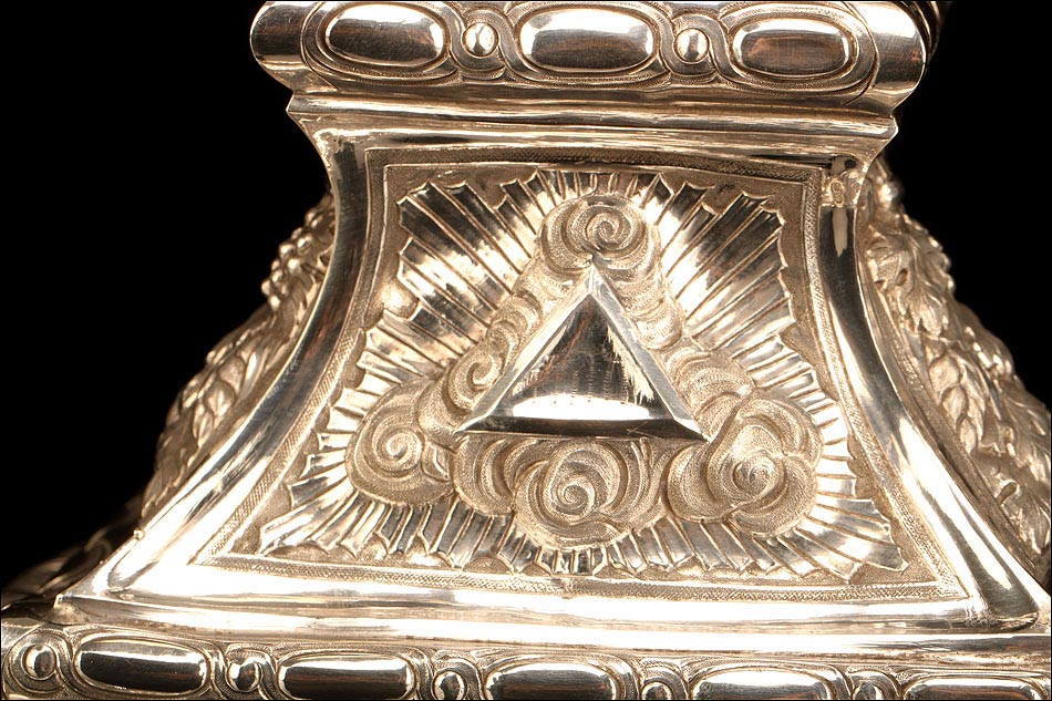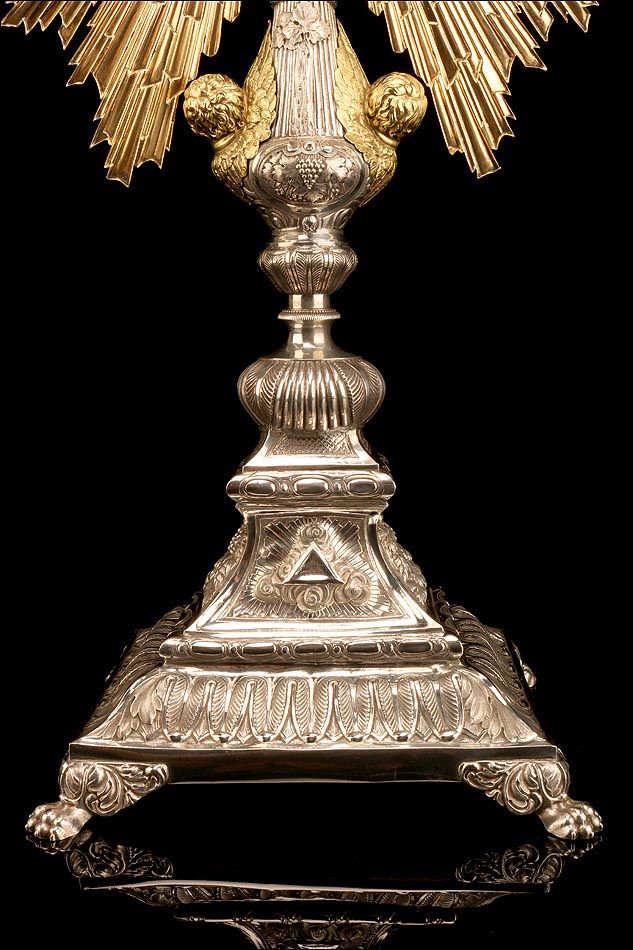 Soberbia custodia antigua de plata maciza de gran tamaño, realizada en Francia en el siglo XIX. La custodia está completa, y se presenta con la luna original y con el estuche de guardado. Está en magníficas condiciones, mostrando una belleza impresionante y un muy buen estado de conservación. La base de la pieza lleva cuatro patas en forma de garra sobre las que se alza una forma piramidal, profusamente decorada con volutas en relieve y con el símbolo de Dios, el triángulo en el cielo, situado en su cara frontal.