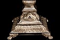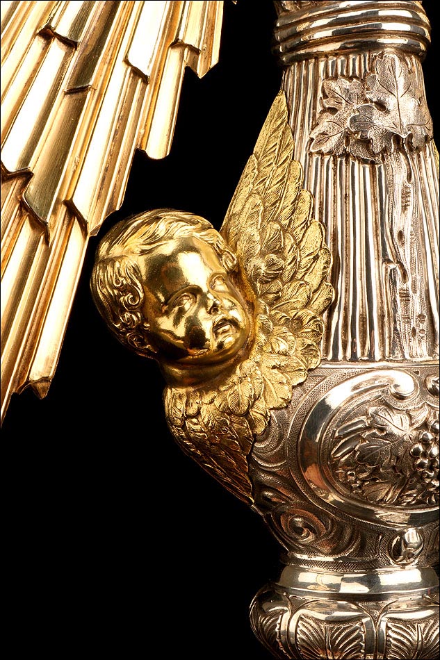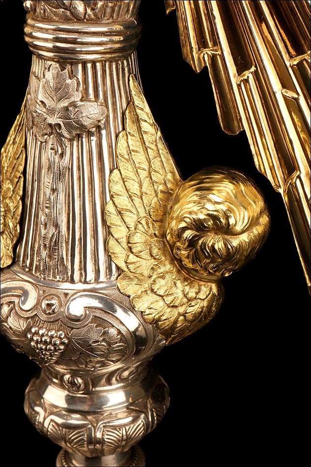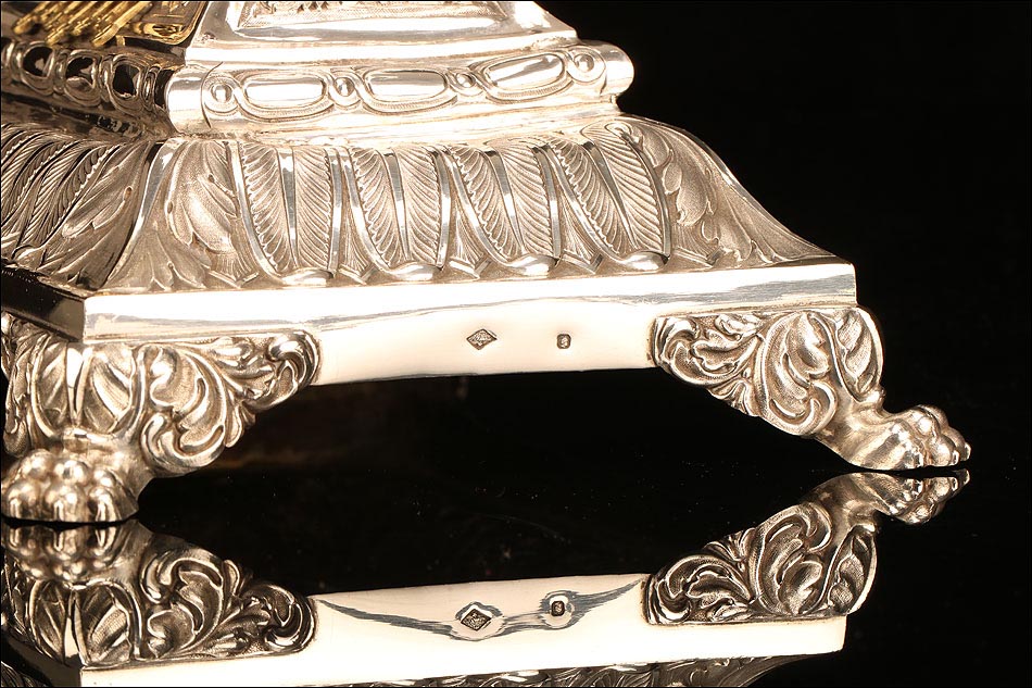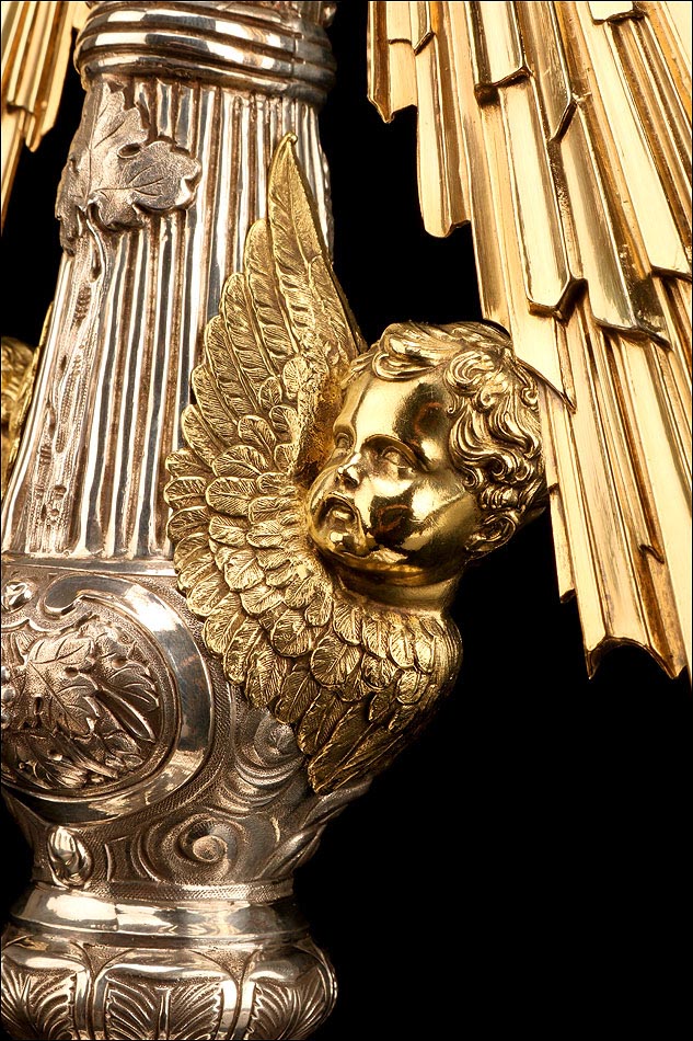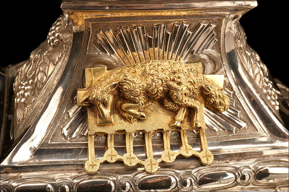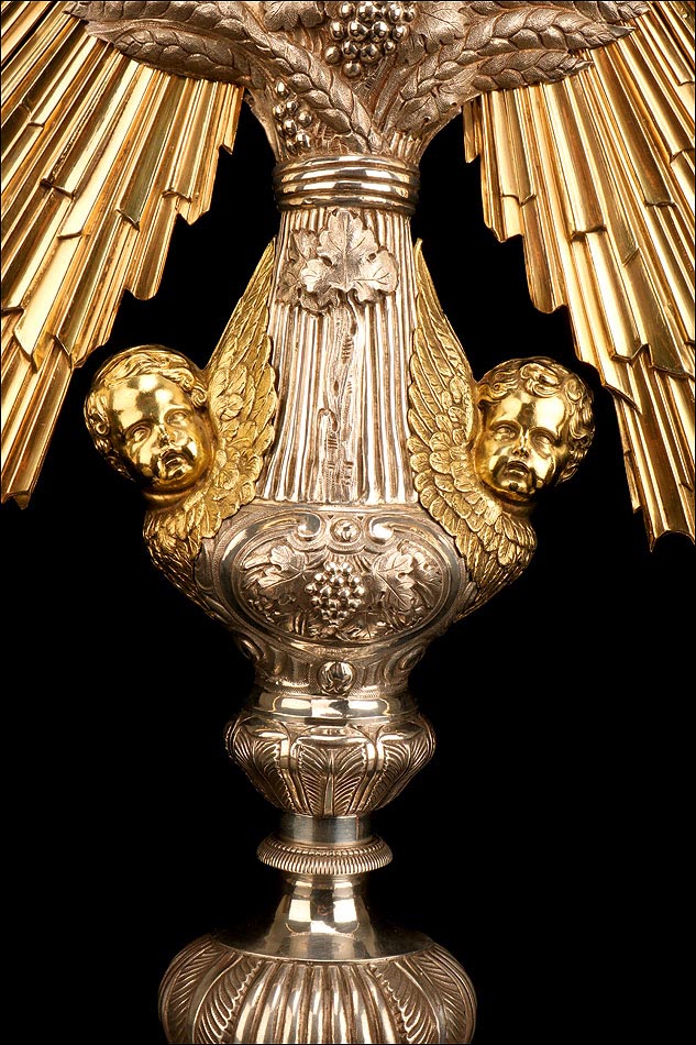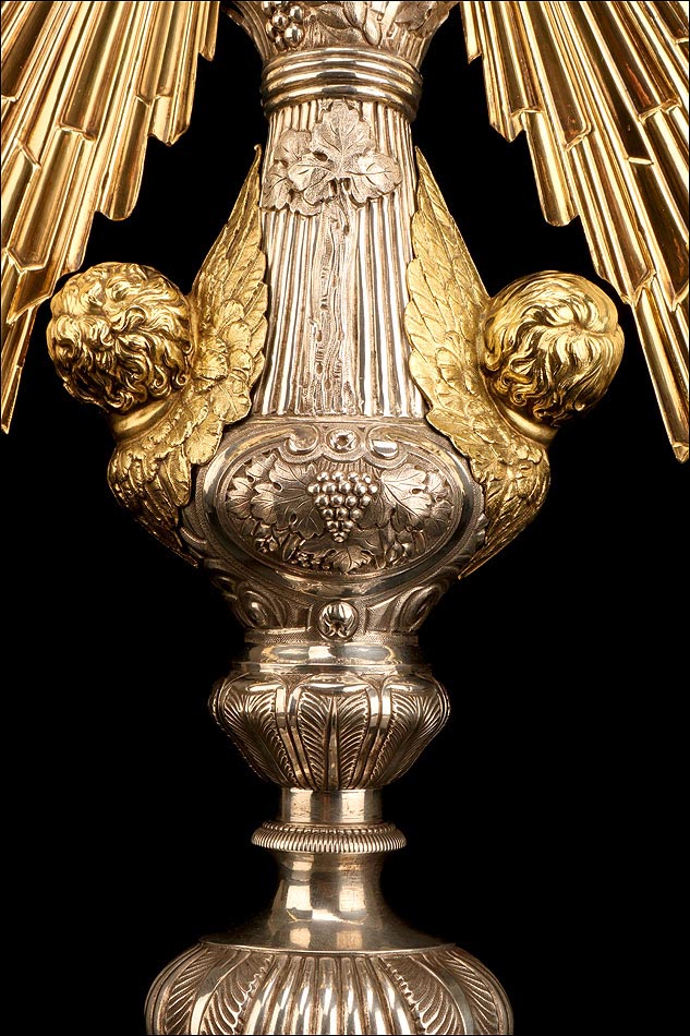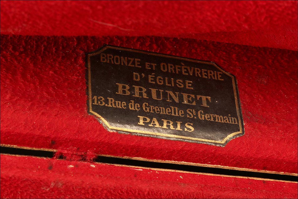 Soberbia custodia antigua de plata maciza de gran tamaño, realizada en Francia en el siglo XIX. La custodia está completa, y se presenta con la luna original y con el estuche de guardado. Está en magníficas condiciones, mostrando una belleza impresionante y un muy buen estado de conservación. La base de la pieza lleva cuatro patas en forma de garra sobre las que se alza una forma piramidal, profusamente decorada con volutas en relieve y con el símbolo de Dios, el triángulo en el cielo, situado en su cara frontal.