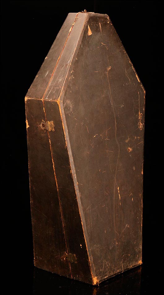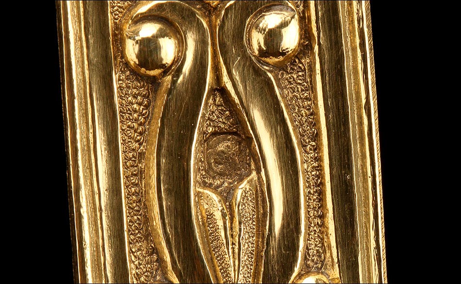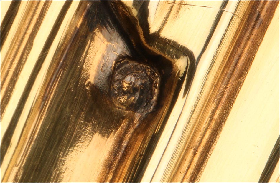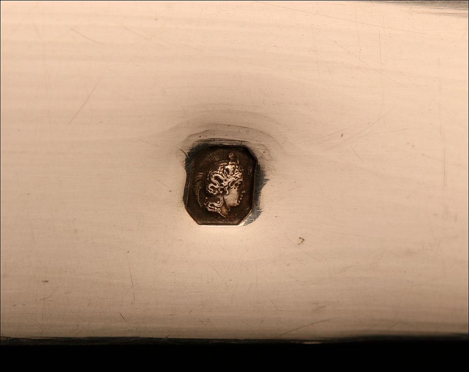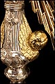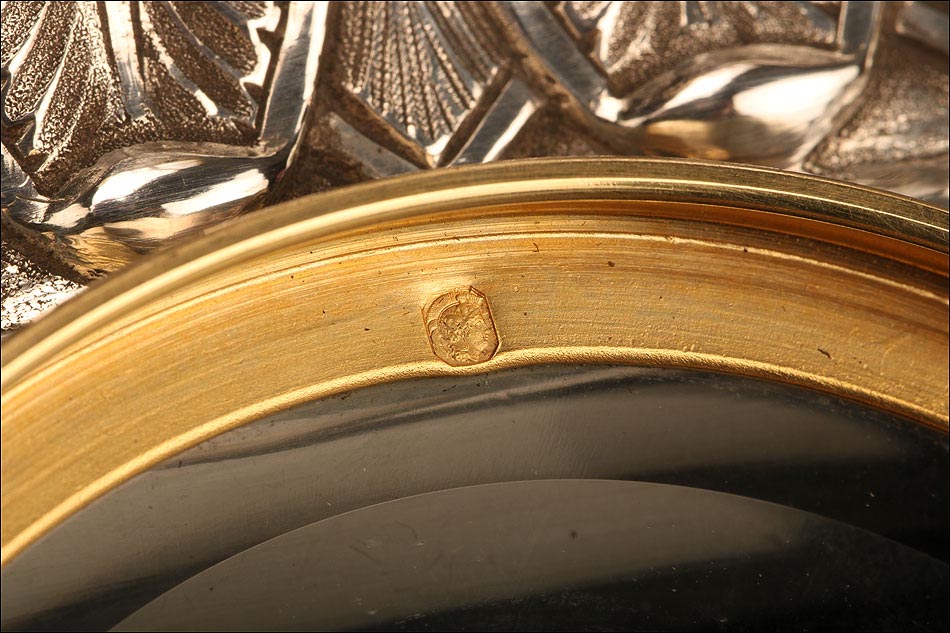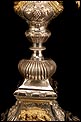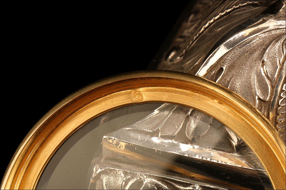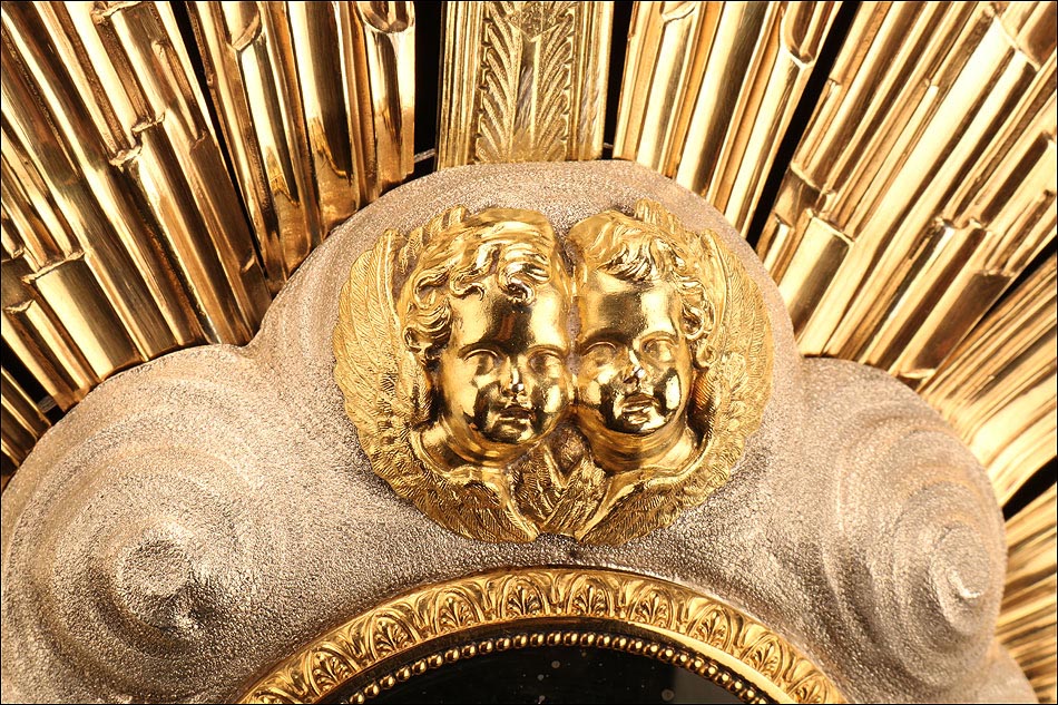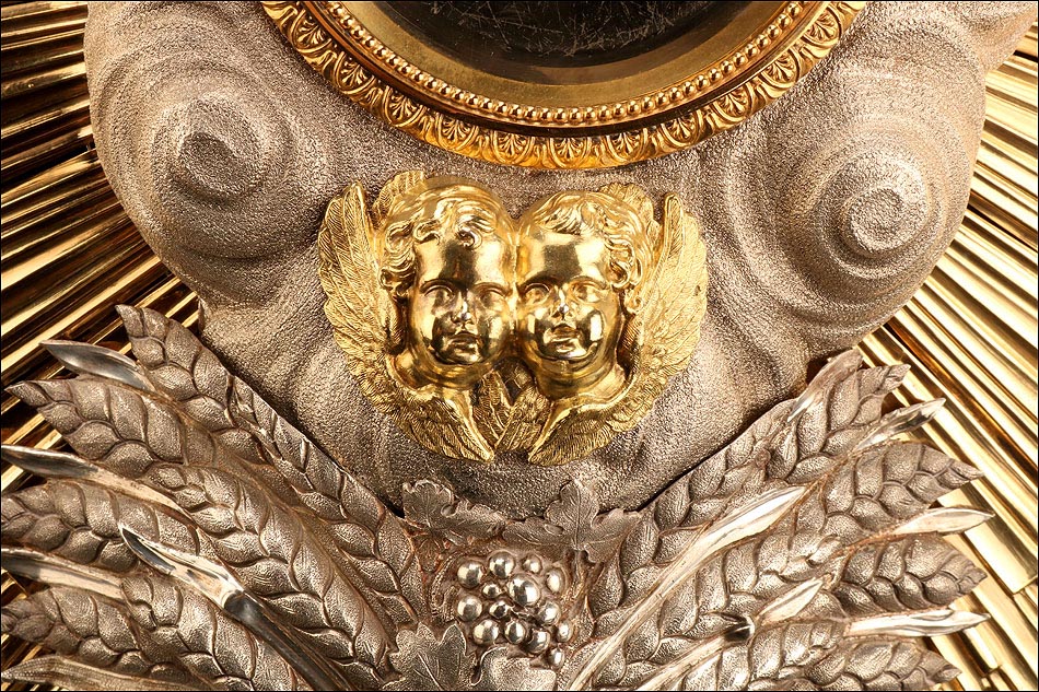 Soberbia custodia antigua de plata maciza de gran tamaño, realizada en Francia en el siglo XIX. La custodia está completa, y se presenta con la luna original y con el estuche de guardado. Está en magníficas condiciones, mostrando una belleza impresionante y un muy buen estado de conservación. La base de la pieza lleva cuatro patas en forma de garra sobre las que se alza una forma piramidal, profusamente decorada con volutas en relieve y con el símbolo de Dios, el triángulo en el cielo, situado en su cara frontal.
