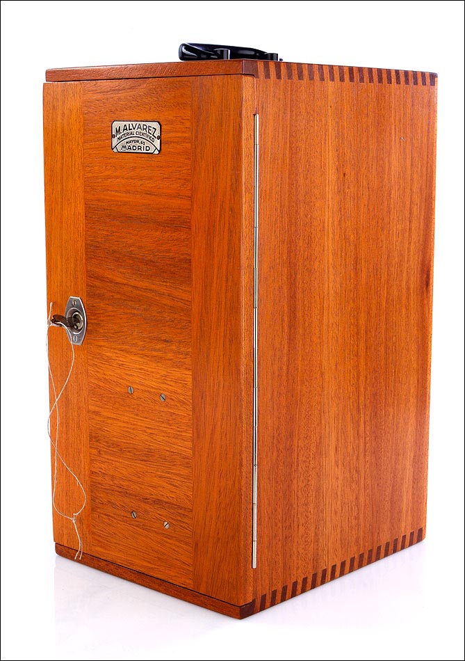 En su cara frontal, la torre del microscopio lleva grabado el nombre del fabricante y el número de serie del aparato: E. Leitz Wetzlar – Nr 446467. Este mismo nombre aparece claramente grabado también en otras partes del microscopio, al igual que en las lentes. El juego de accesorios que acompaña a este fantástico instrumento incluye lentes y oculares con sus respectivas fundas, así como una pequeña botella de vidrio con tapón de corcho y una serie de llaves unidas mediante un cordón violeta. El estuche donde se guarda el conjunto está fabricado en madera maciza de caoba rubia, magníficamente conservado y con una placa donde aparece el nombre del establecimiento donde se vendió el microscopio en origen: M. ÁLVAREZ - MADRID.