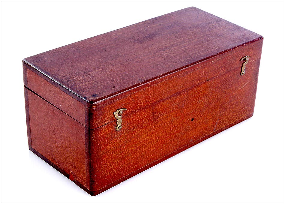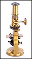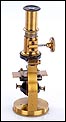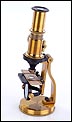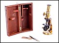 Pequeño microscopio compuesto antiguo fabricado a principios del siglo XX, probablemente en Alemania o en Austria. El microscopio es compacto y funcional, conserva todas sus piezas y componentes originales y se presenta en su estuche de guardado de madera. Es un aparato muy atractivo y antiguo que todavía se puede emplear para visualizar muestras y preparados. El microscopio está fabricado íntegramente en latón excepto por la pletina para muestras y el espejo doble, que son de hierro esmaltado en negro. Va acompañado de unas pinzas antiguas de latón para la manipulación de las muestras y una pletinas de vidrio antigua. El conjunto se guarda en el estuche de madera de caoba, original de época y magníficamente conservado. La madera se muestra lisa y brillante, sin apenas desperfectos y con el acabado transparente antiguo en muy buen estado. El estuche conserva las bisagras y los ganchos de cierre originales.