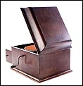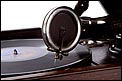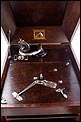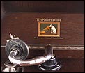 En el interior de la tapa podemos ver el logotipo de la firma His Master’s Voice (La Voz de Su Amo en España) donde aparece una imagen a todo color, muy bien conservada, del famoso perro escuchando un gramófono de trompeta. El reproductor es también un His Master’s Voice original, y lleva grabado el nombre de la marca y de la compañía fabricante en el dorso. El brazo que lo soporta, el plato giradiscos y el resto de las piezas son de metal cromado, muy bien conservadas y sin apenas signos del paso del tiempo y el uso. El gramófono conserva la manivela original que sirve para dar cuerda al motor, en estado operativo.