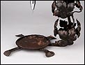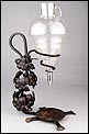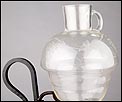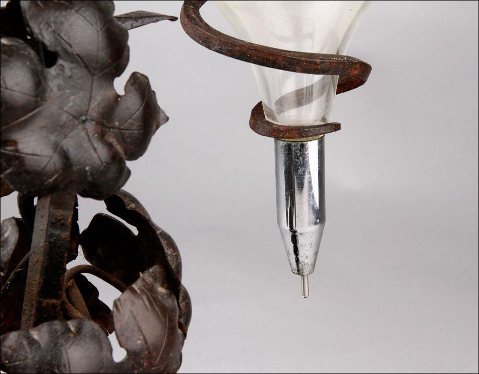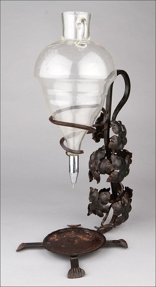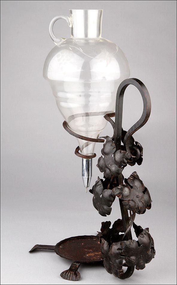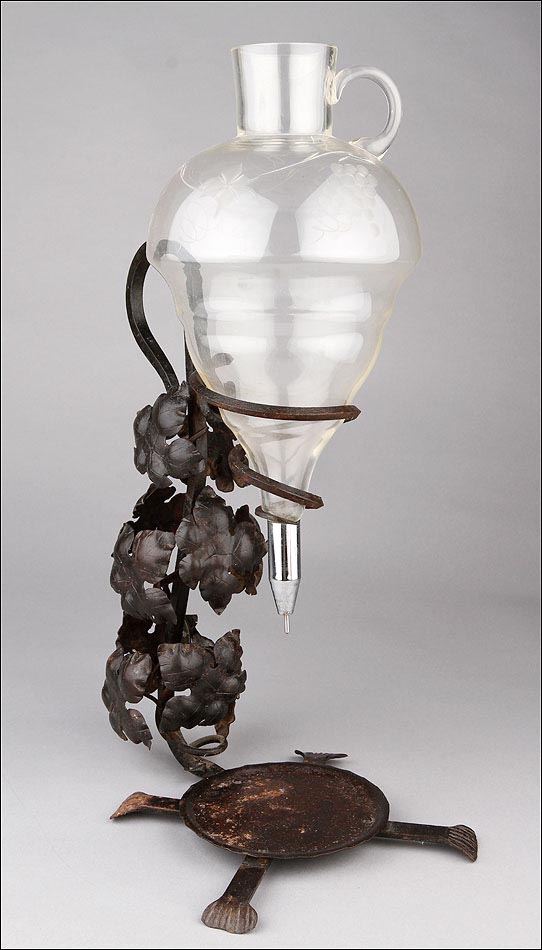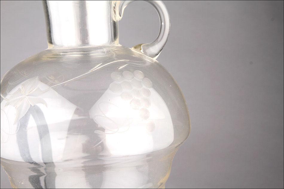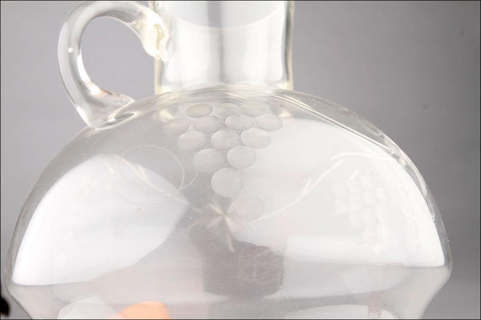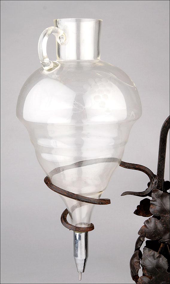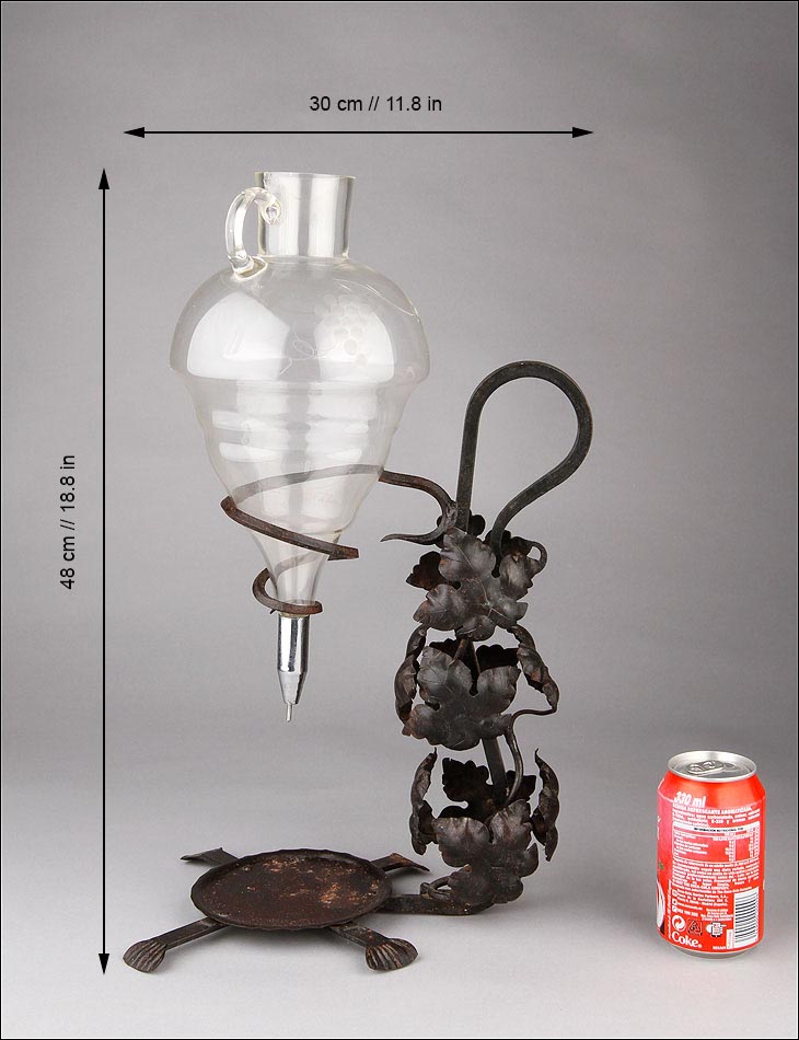 Original decantador de vino vintage fabricado en los años 70 del siglo XX, realizado en cristal tallado a mano y con soporte de forja. El decantador está equipado con un filtro que sirve para retener los posos del vino y los restos de corcho, de haberlos. Esta pieza tiene un encanto muy singular, tanto por su original diseño como por su realización cien por cien artesanal. El decantador es muy delicado: el cristal del que está hecho es fino y transparente, y está decorado con racimos de uva cuidadosamente tallados a mano. Lleva una pequeña asa que permite servir el vino fácilmente tras el proceso de decantación. En el borde superior hay un pequeño desperfecto, apenas perceptible; el resto del decantador está en perfecto estado. El soporte de forja lleva una base para colocar un recipiente bajo el decantador; está decorado con hojas de parra y se encuentra en buenas condiciones. El decantador es más decorativo que funcional.