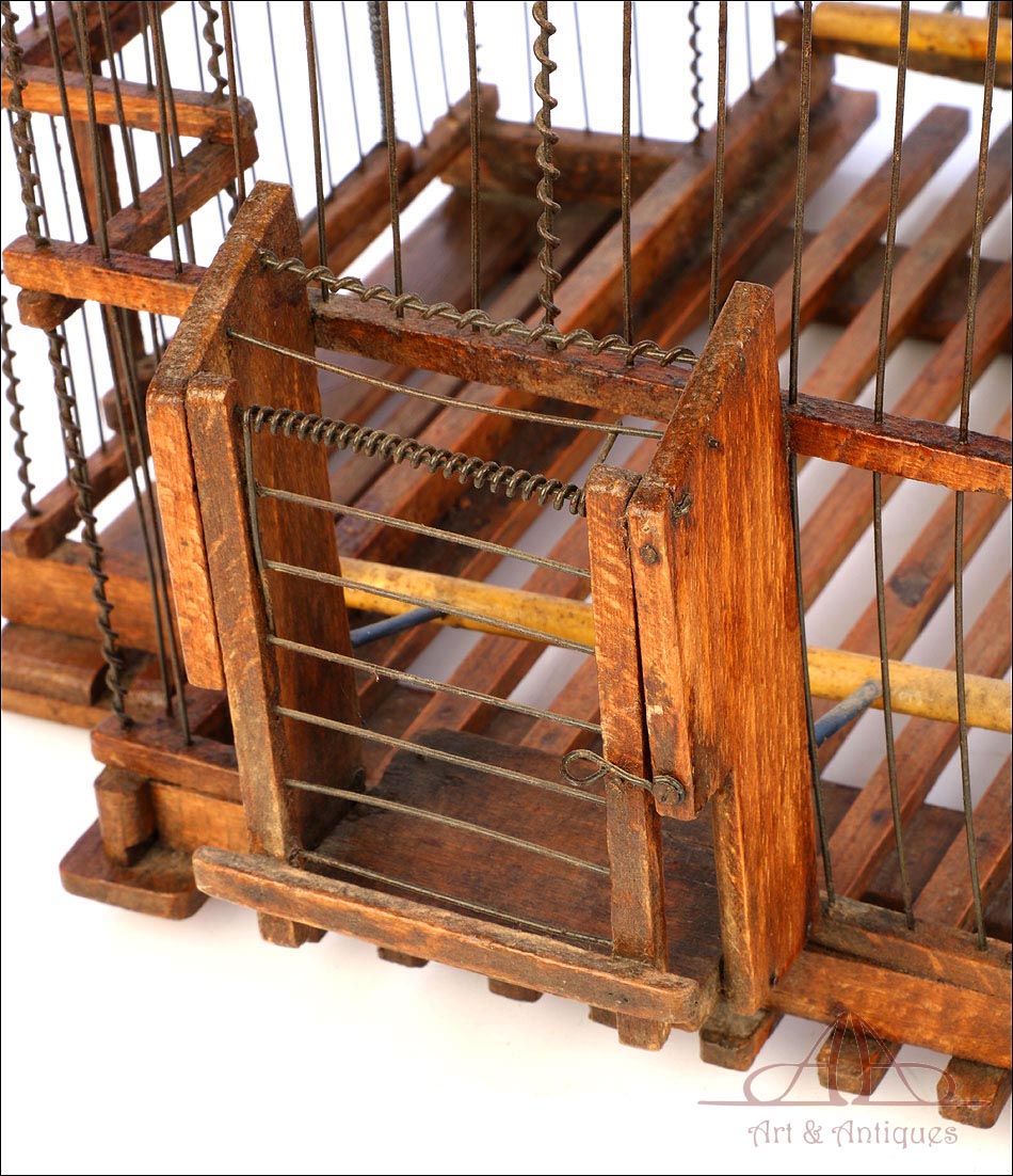 Fantástica y antigua pajarera o jaula para pájaros fabricada en España circa 1940, en muy buenas condiciones y en estado de uso. La jaula está en excelentes condiciones, tanto las piezas de madera como las varillas y los resortes de metal. En la parte superior hay un pequeño desperfecto que ha sido reparado, y que a día de hoy no afecta a la estructura, la estética o la resistencia de la pajarera. La estructura, de hecho, es muy firme y permite utilizar la jaula, si se desea, para criar y mantener pájaros sin problemas o bien como uso decorativo. En las paredes encontramos dos puertas de entrada/salida para las aves y otras dos puertas de guillotina, destinadas a colocar los comederos. La pajarera tiene forma de casa y muestra un encantador diseño alpino, siendo una pieza enormemente decorativa que destacará en un salón luminoso o una terraza de estilo colonial.