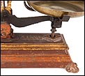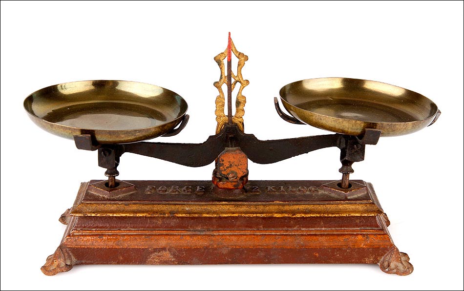 Esta delicada pieza es una balanza antigua, pequeña y funcional, fabricada a principios del siglo XX. La balanza llama la atención por su fina factura y sus detalles decorativos, siendo la pieza ideal para decorar una vitrina, una mesa de centro, un aparador o un rincón especial. La base es de hierro fundido lacado en distintos colores: rojo inglés, naranja y dorado. Tiene forma moldurada y cuatro pequeñas patas decorativas en las esquinas, modeladas a modo de conchas o vieiras. En la parte superior de la base podemos ver la palabra FORGE (forja) en llamativas letras en relieve. La cruz de hierro está perfectamente nivelada y soporta dos finos platillos de latón, muy bien conservados. En el centro, el fiel o aguja indica el equilibrio entre los platillos situando su punta esmaltada en rojo en el centro de un bello adorno de filigrana pintado de dorado.
