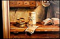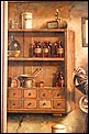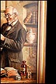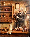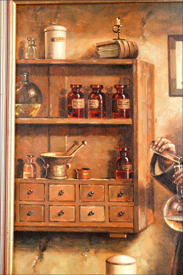 La obra está realizada en una austera gama de tonos ocres, marfiles y grises. Esta paleta de colores aumenta su sensación evocadora y antigua, similar a la que generan las viejas fotografías y grabados en tonos sepia. El pintor muestra gran talento y habilidad en el uso de la pincelada, los toques de brillo y las proporciones, tanto en el personaje principal como en todos los objetos que le rodean. La perfección en la recreación de materiales como el cristal o el metal dorado, así como en la representación de los líquidos o el propio retrato del farmacéutico, revelan la mano de un artista consumado con muchos años de profesión a sus espaldas.